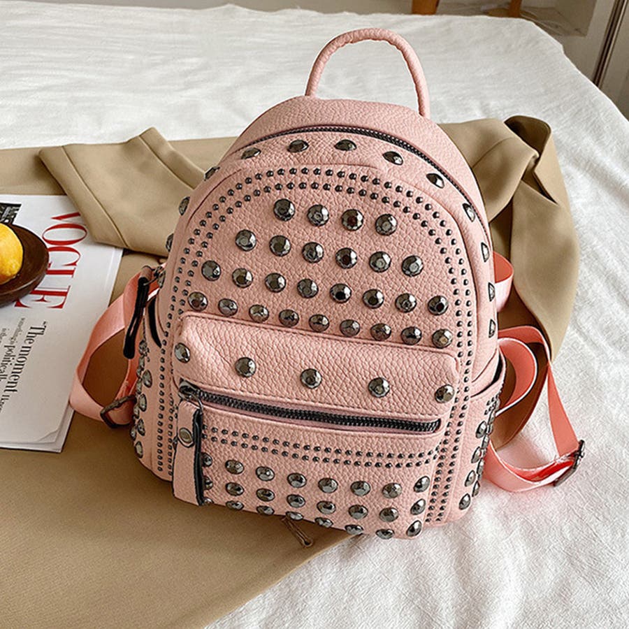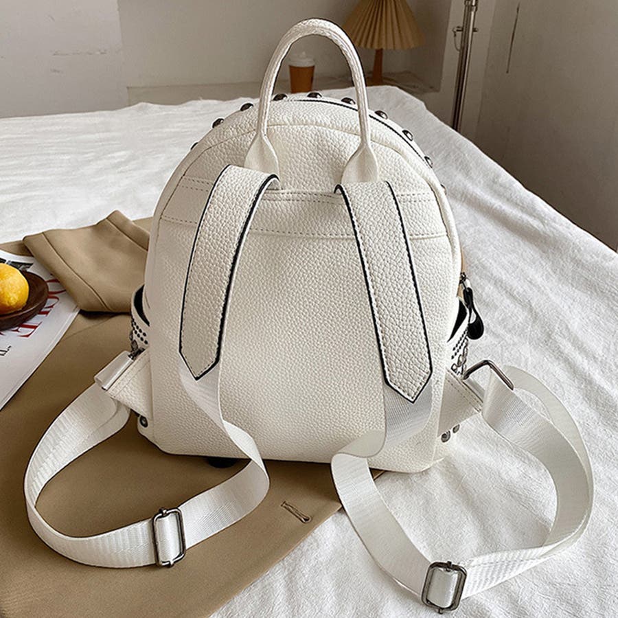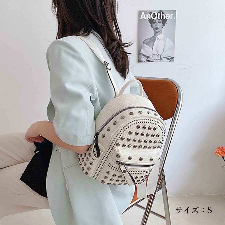 牛シボ模様でマットの質感を醸し出し、リベットスタッズによってロックの疾走感を加えたPU生地のコンパクトリュック