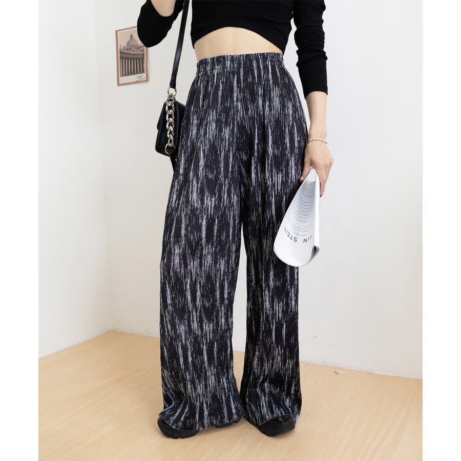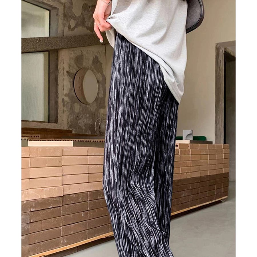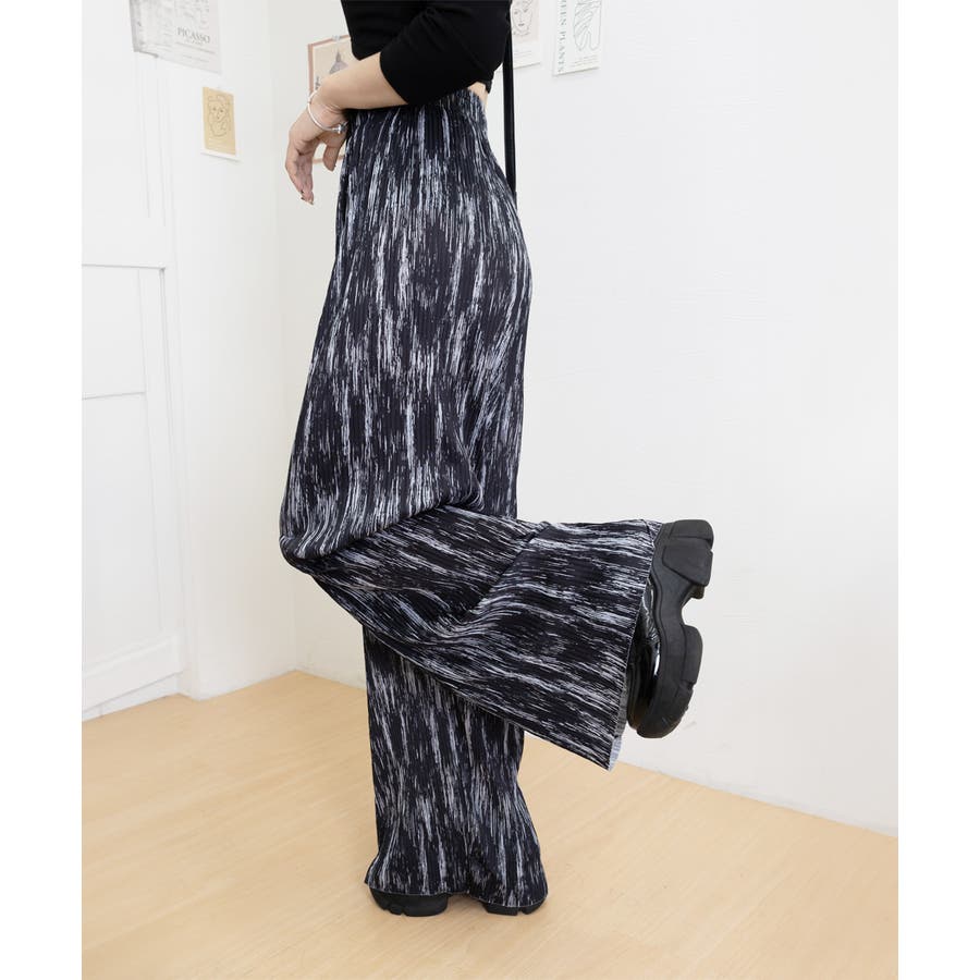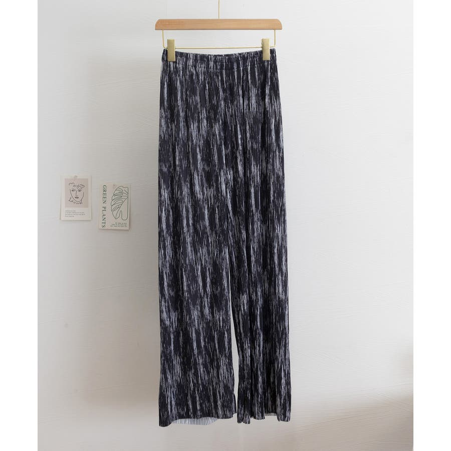 光と影が織りなす独特の質感を持つ、プリーツ加工のワイドパンツ。