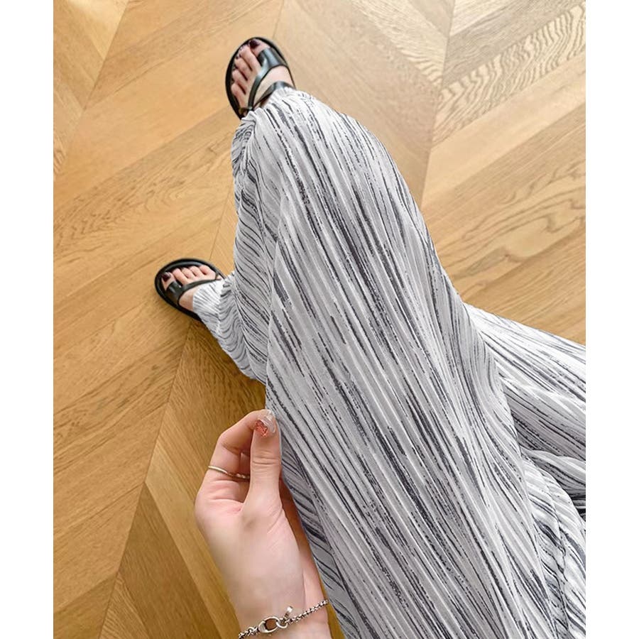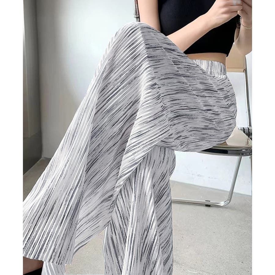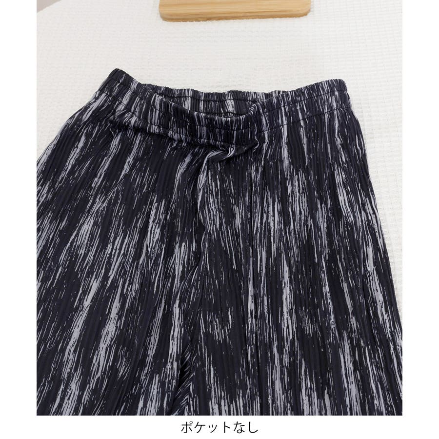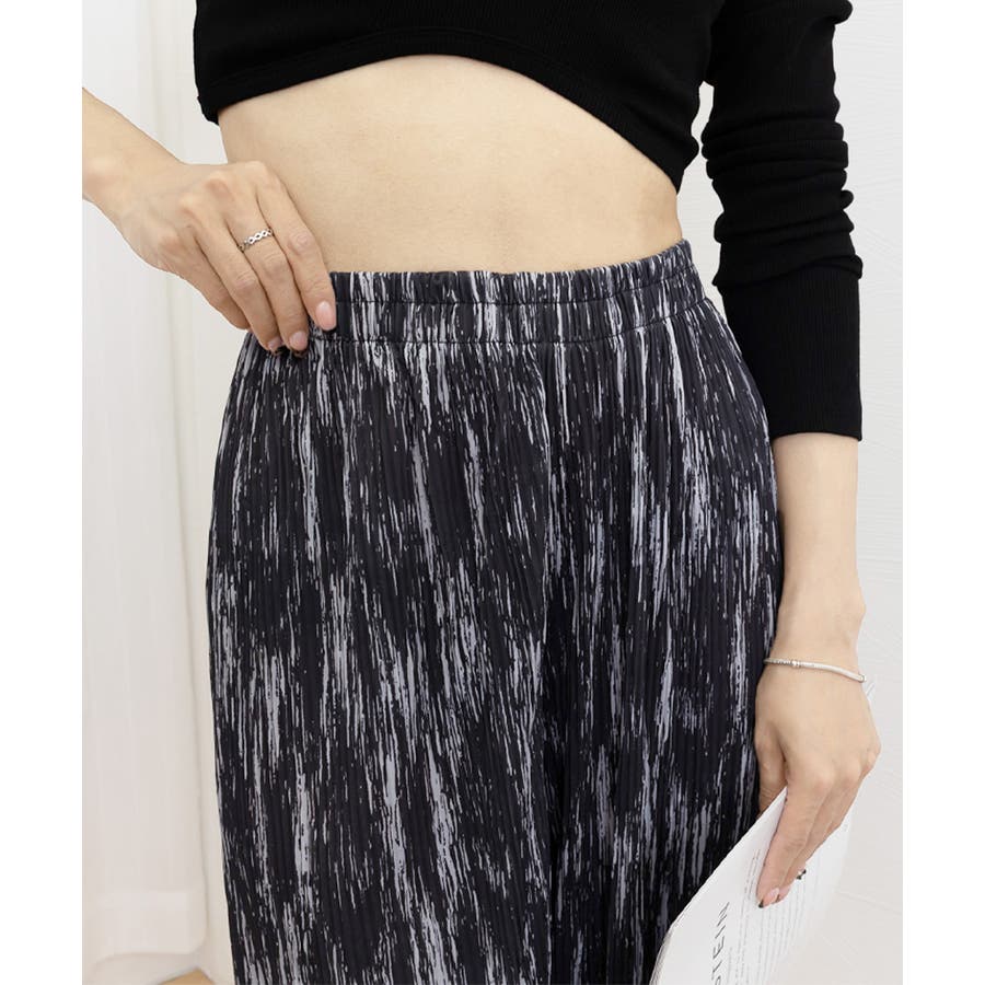光と影が織りなす独特の質感を持つ、プリーツ加工のワイドパンツ。