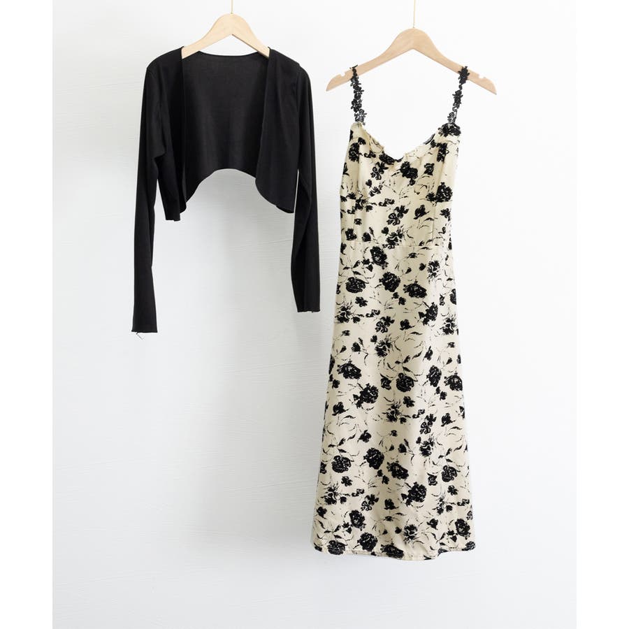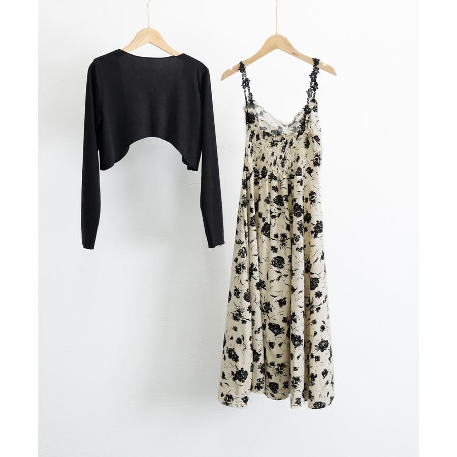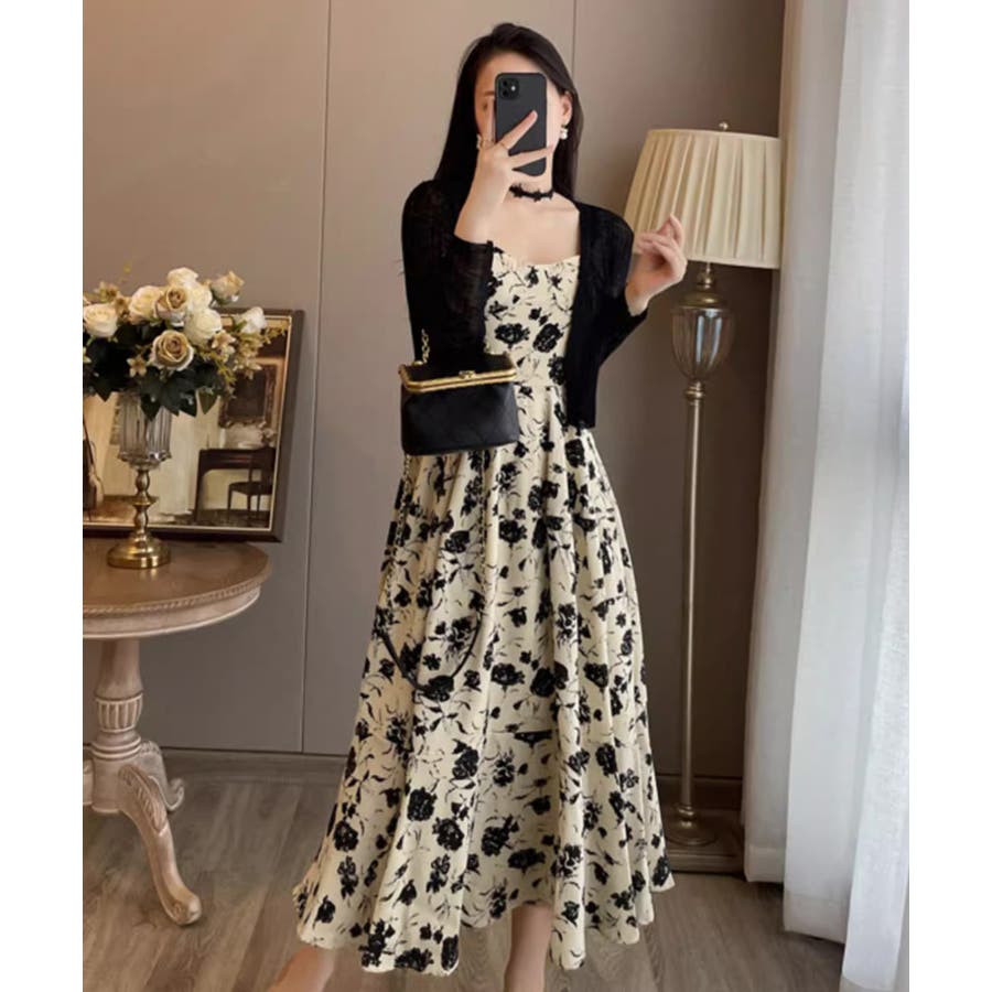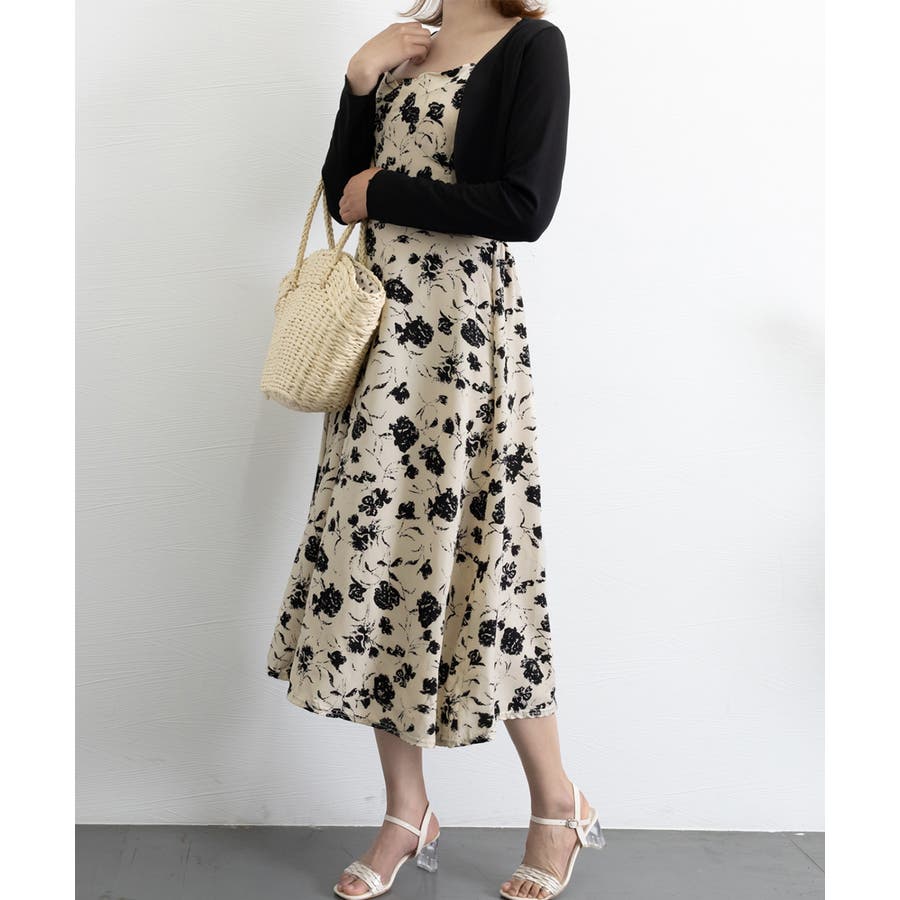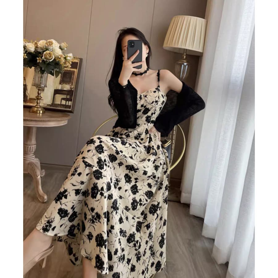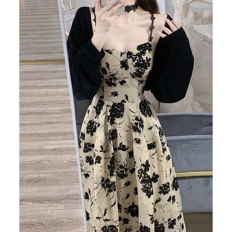 花柄のキャミワンピースと黒のカーディガンのセットアップ