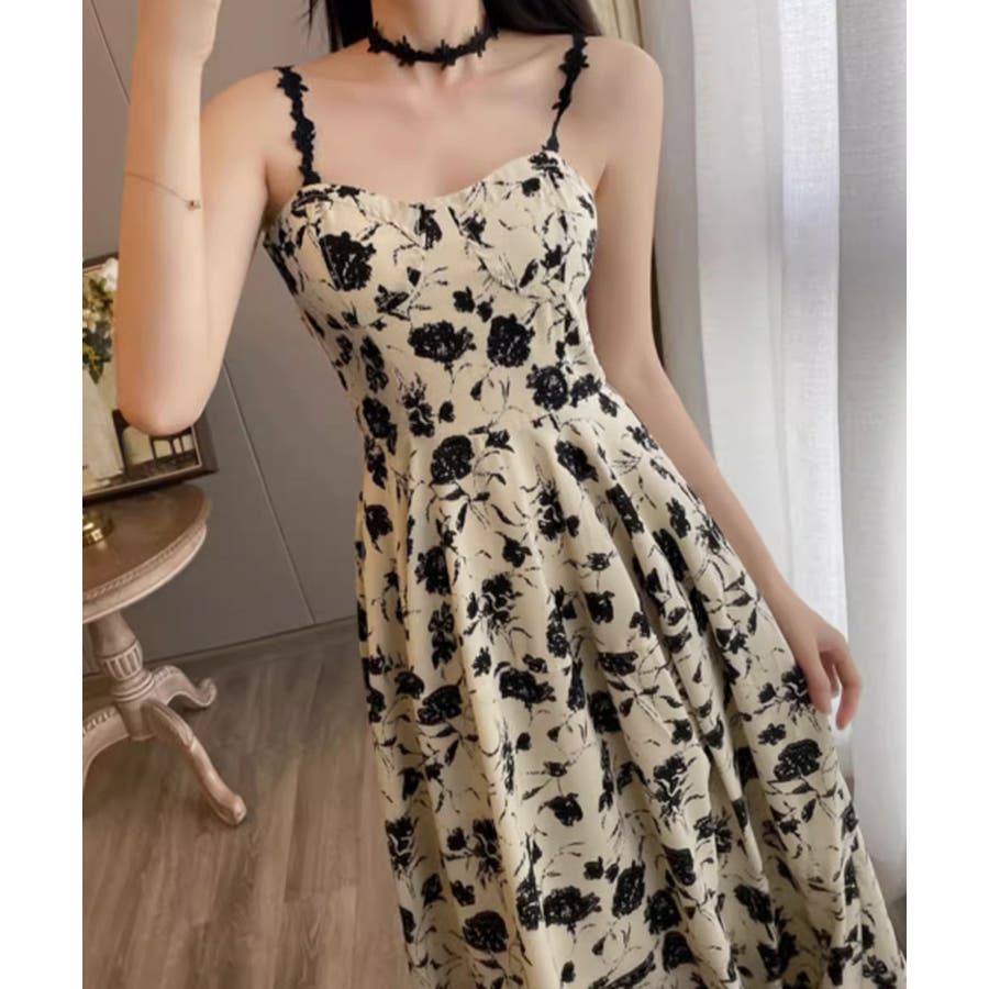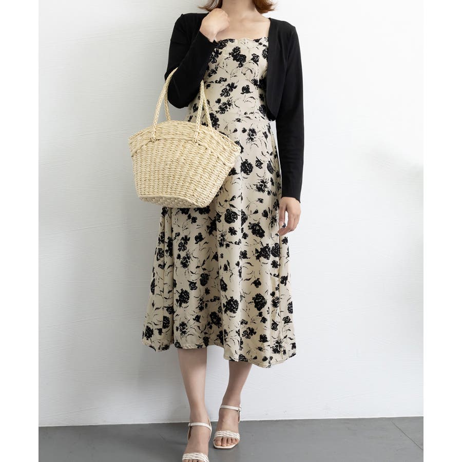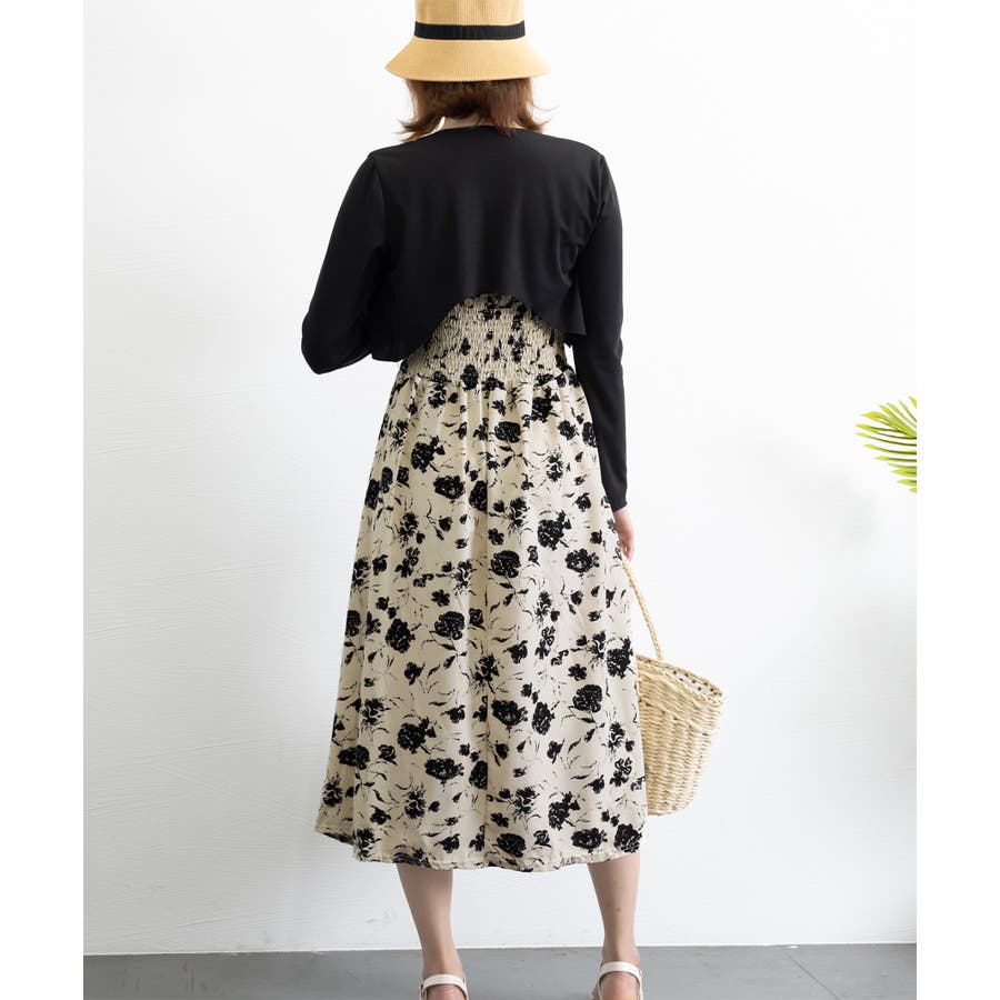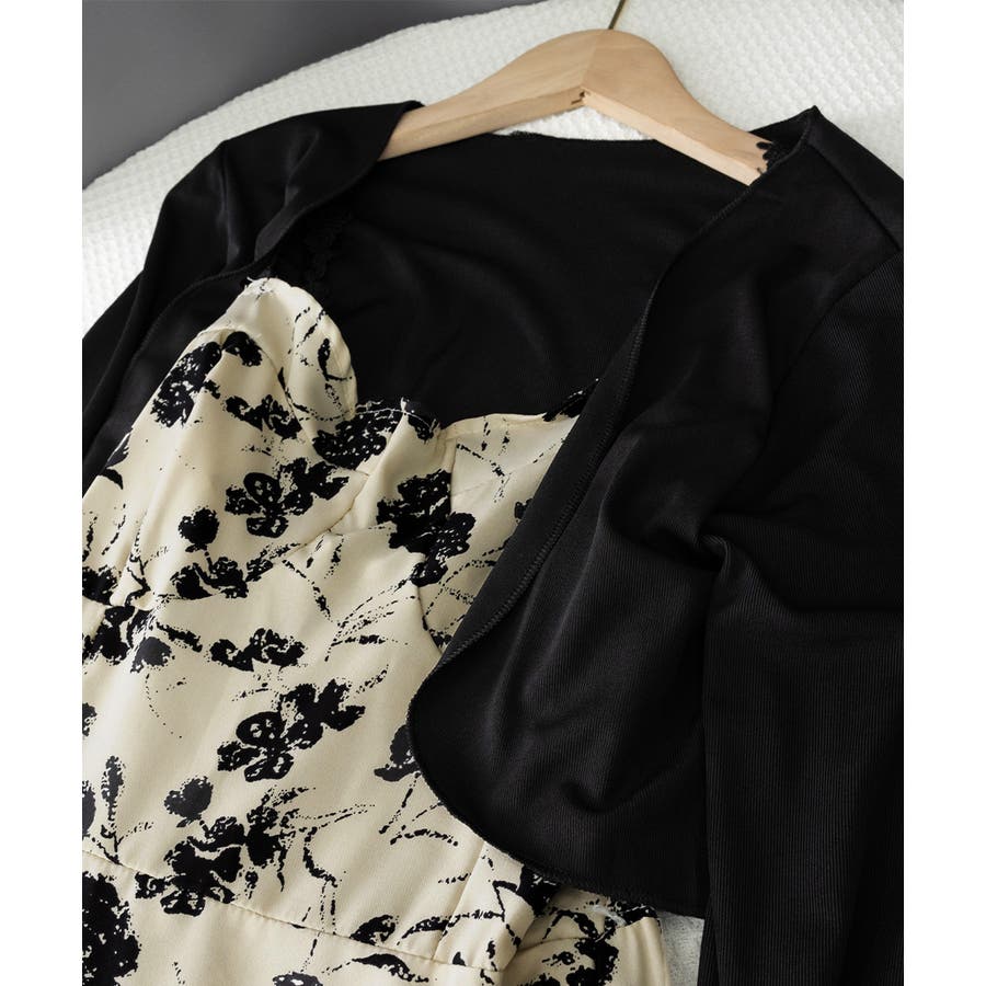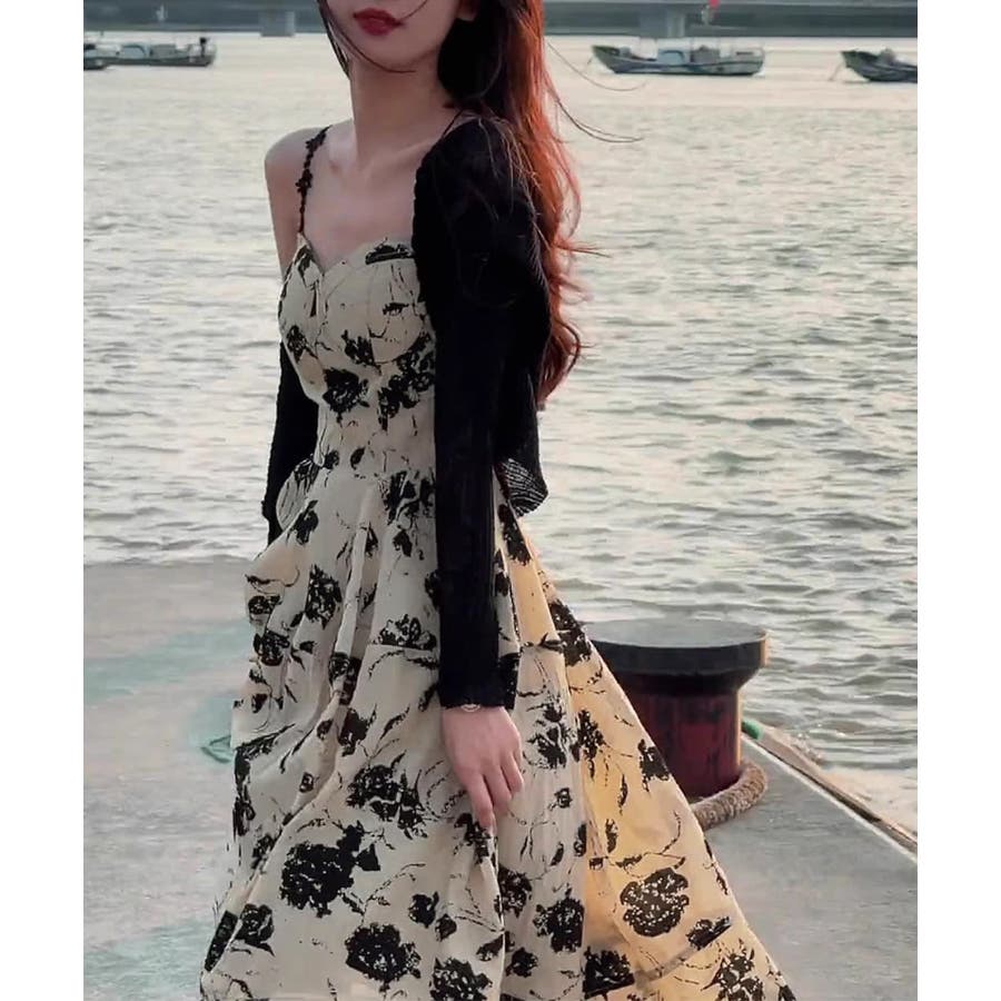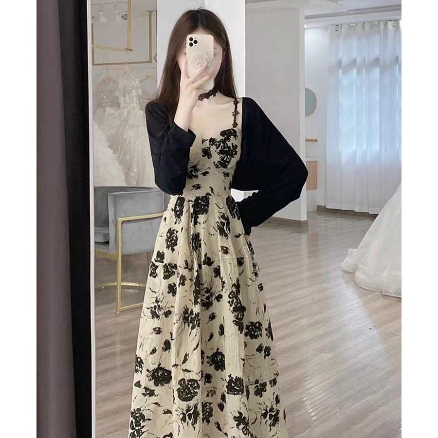 花柄のキャミワンピースと黒のカーディガンのセットアップ