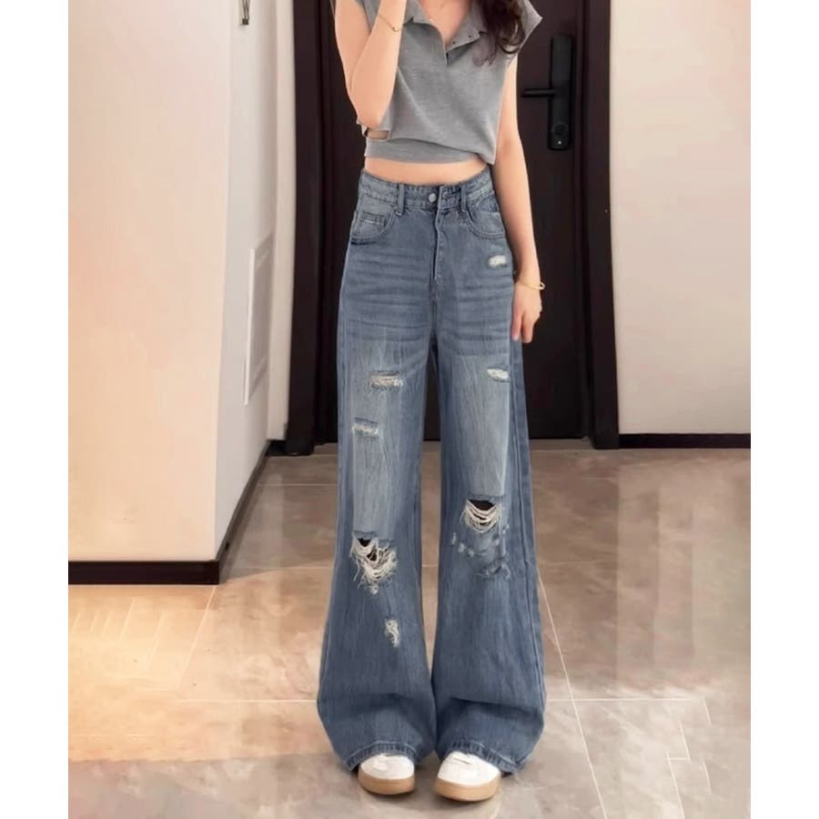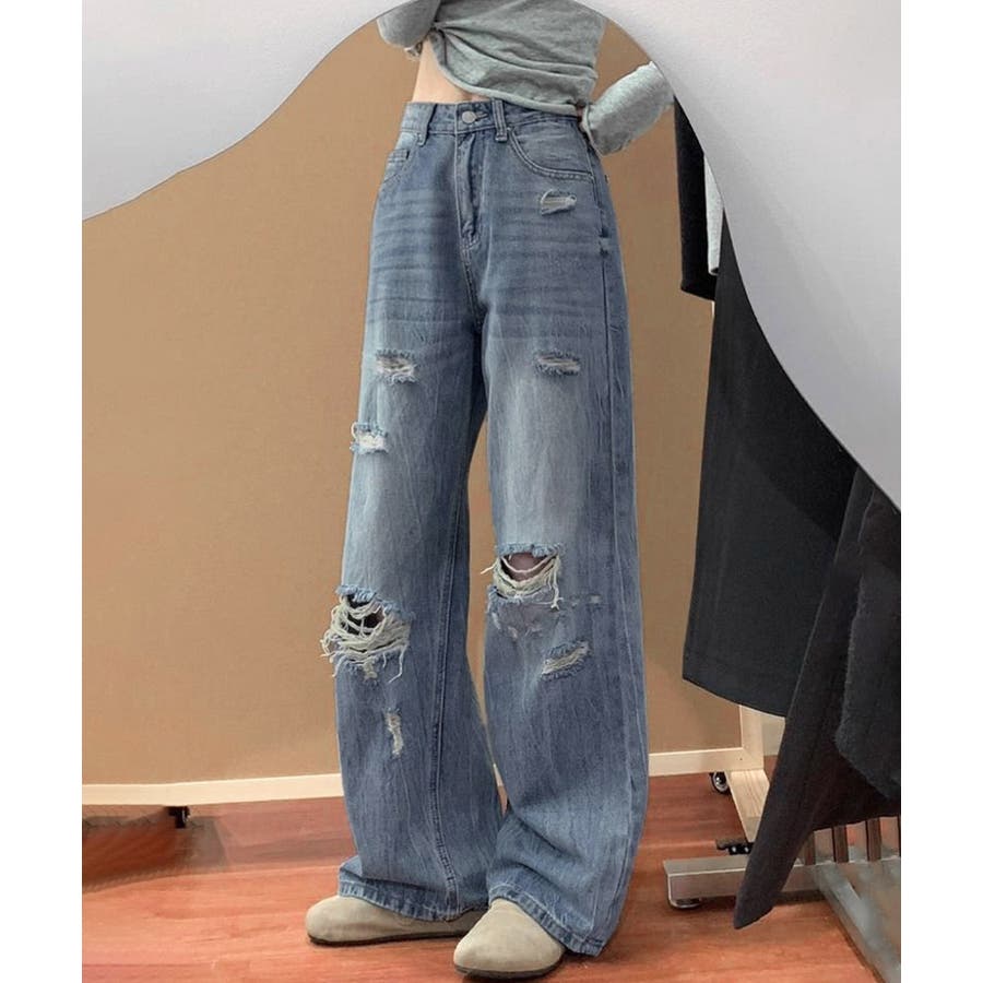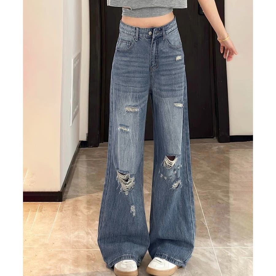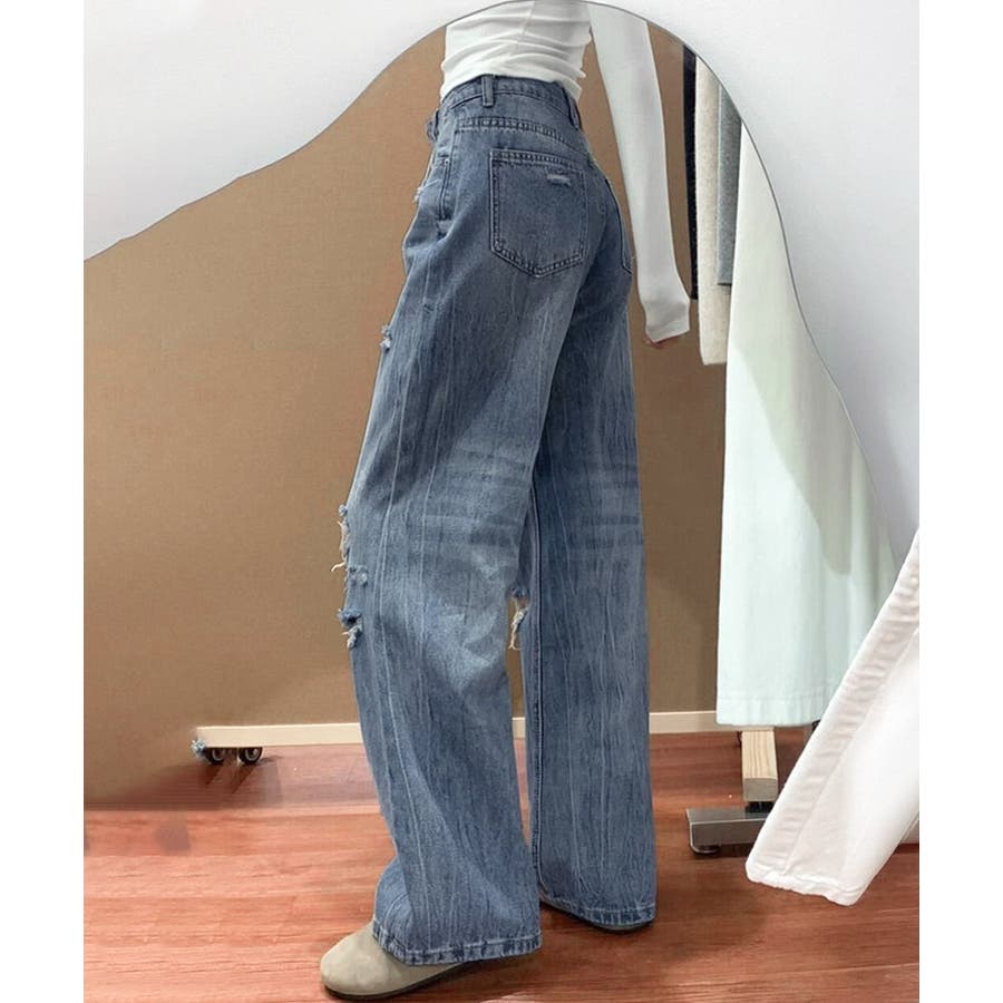 レディース ハイウエスト ロングパンツ ウォッシュ加工 ストレートパンツ 着やせ 韓国風ジーパン ゆったり ボトムス脚長