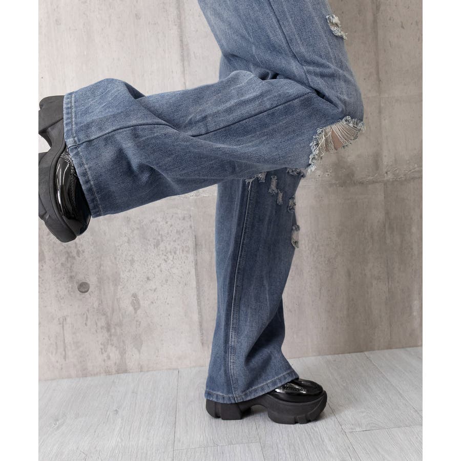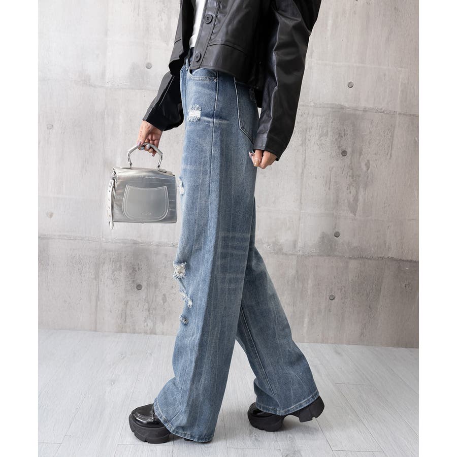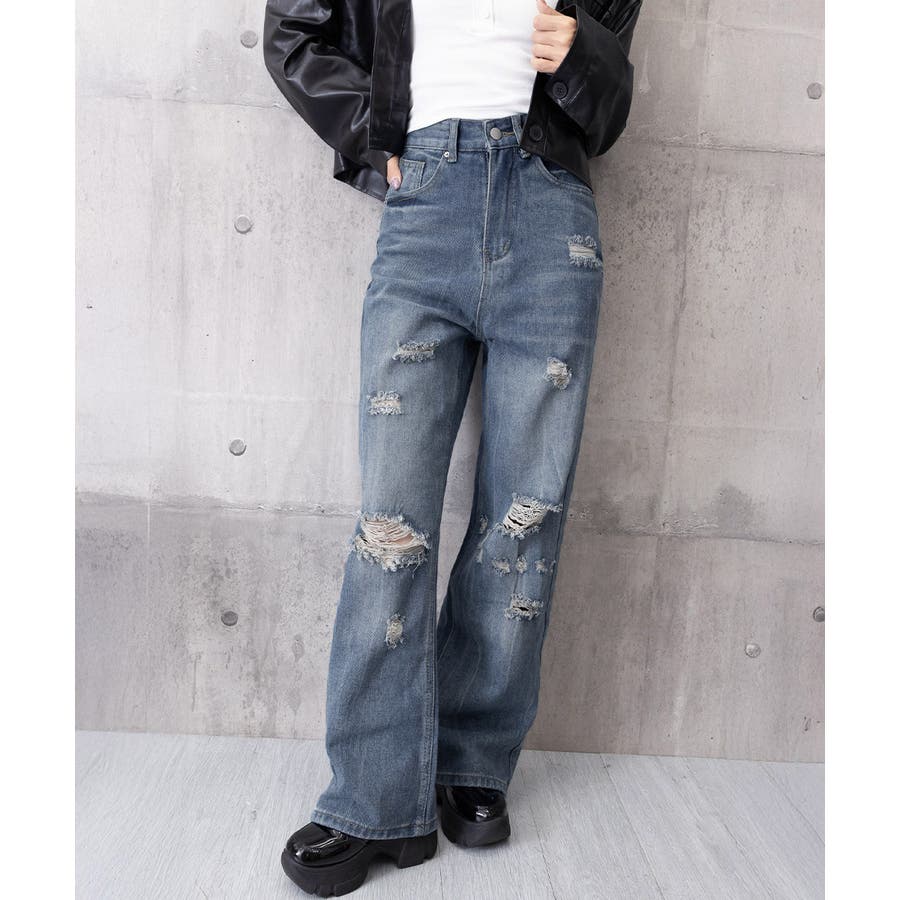 フロントの大胆なダメージ加工が、肌見せの抜け感とヘルシーな印象をプラスするデニムワイドパンツ。