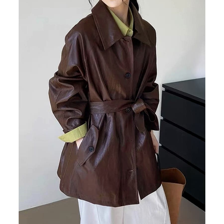 レディースウエストマークフェイクレザージャケット 合皮テーラードジャケットお洒落 ベルト付きアウター秋冬 カジュアル上着