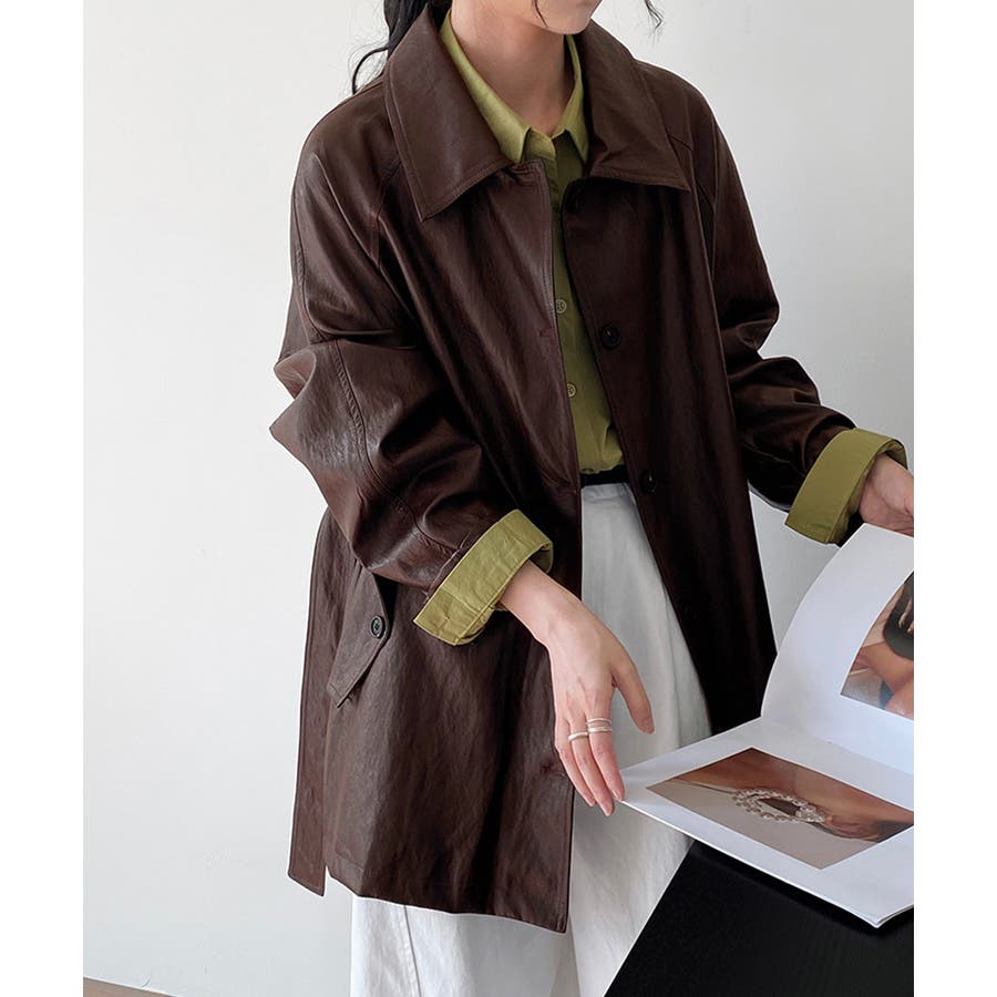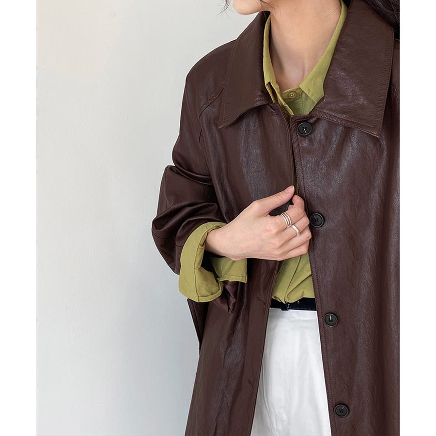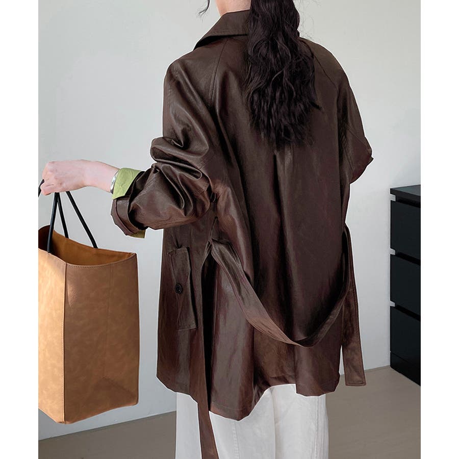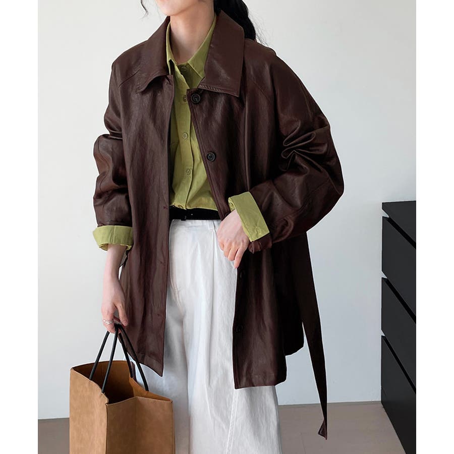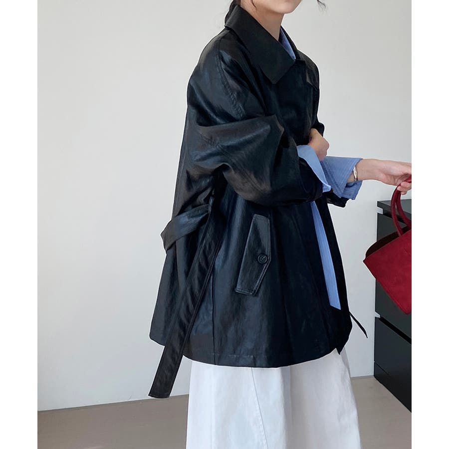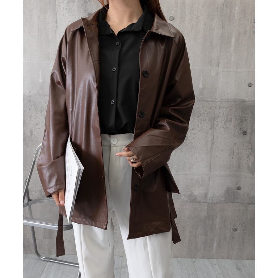 上質なフェイクレザーを使用したロングトレンチジャケット。