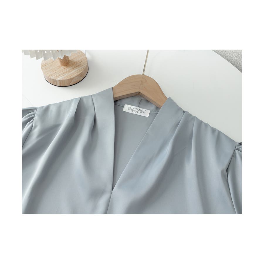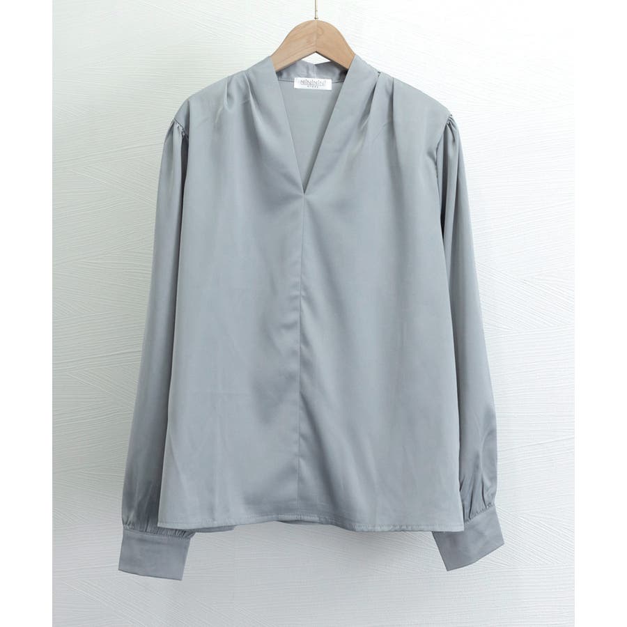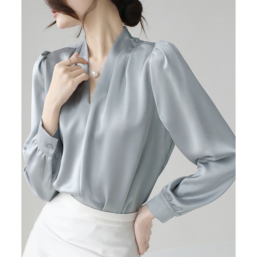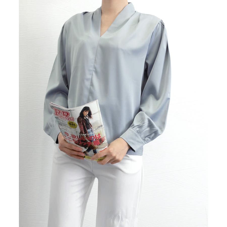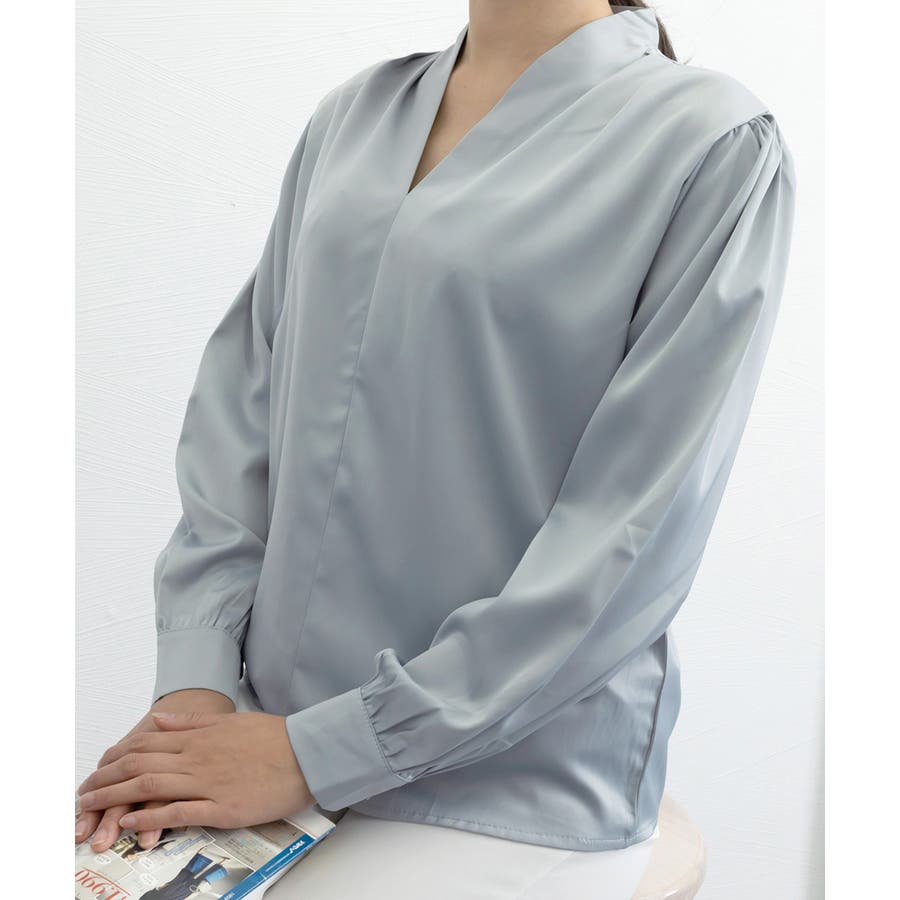 サテン風シャツブラウス Vネックトップス