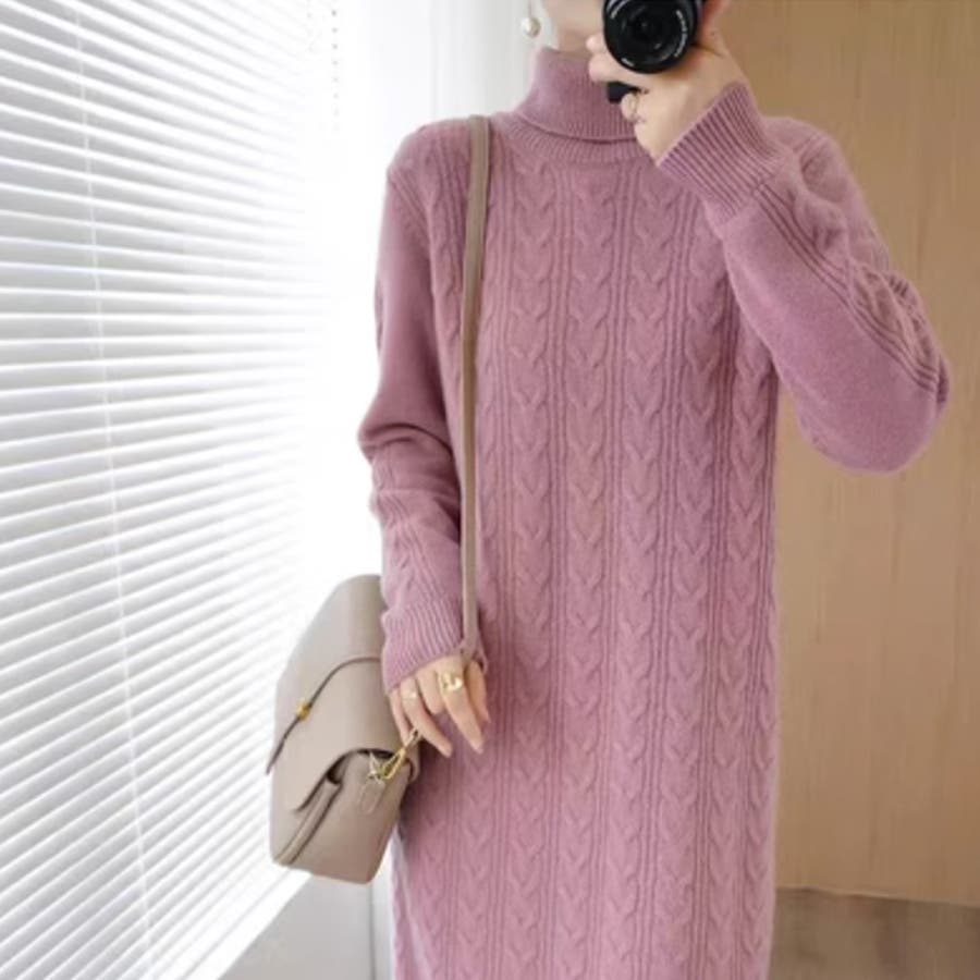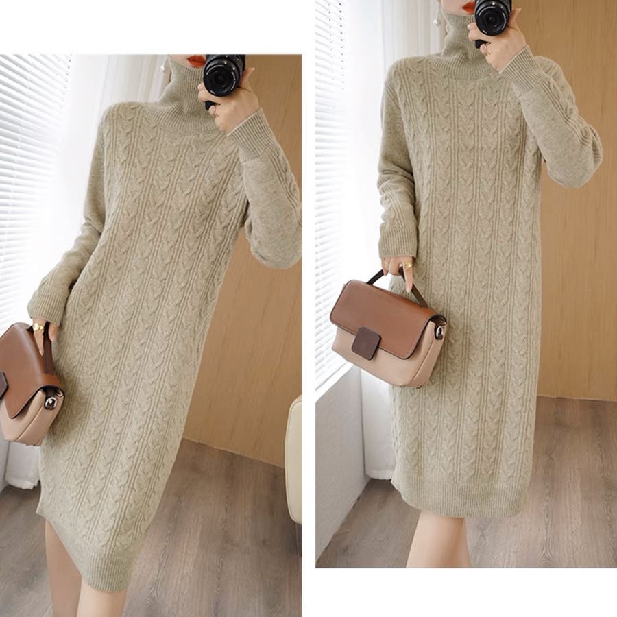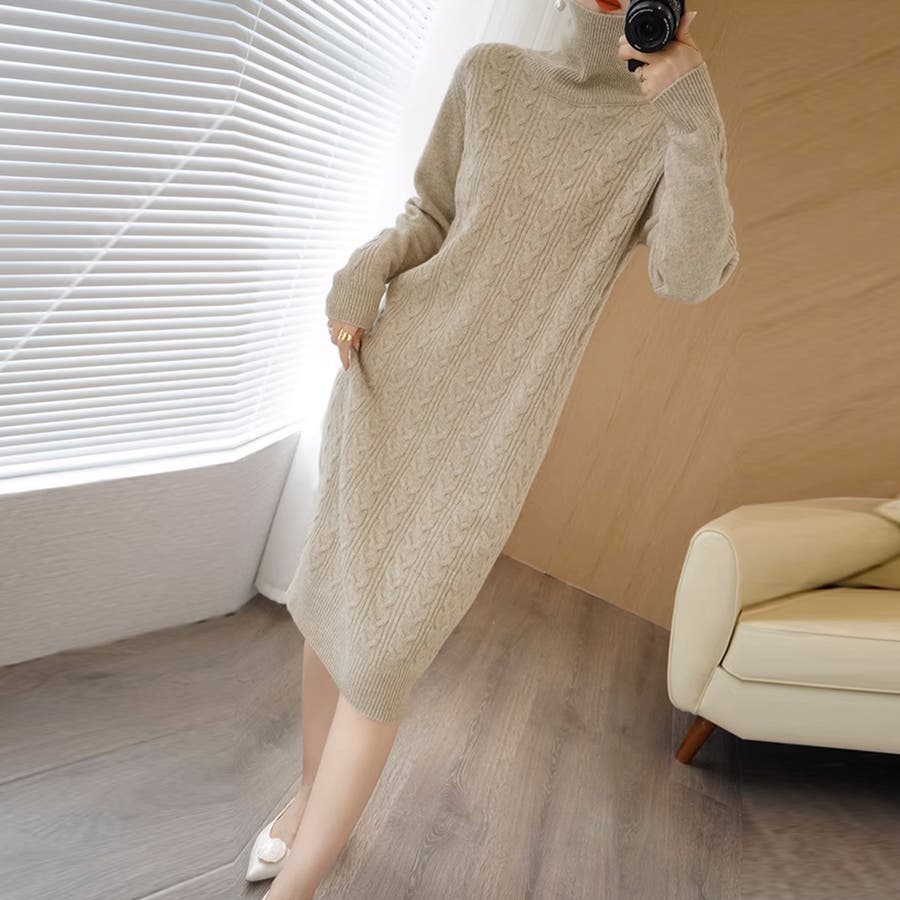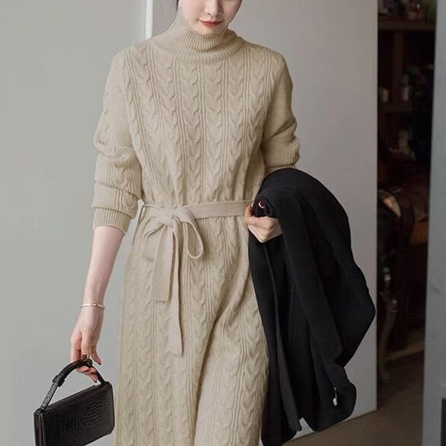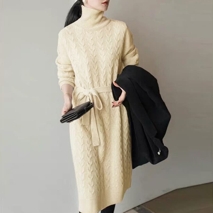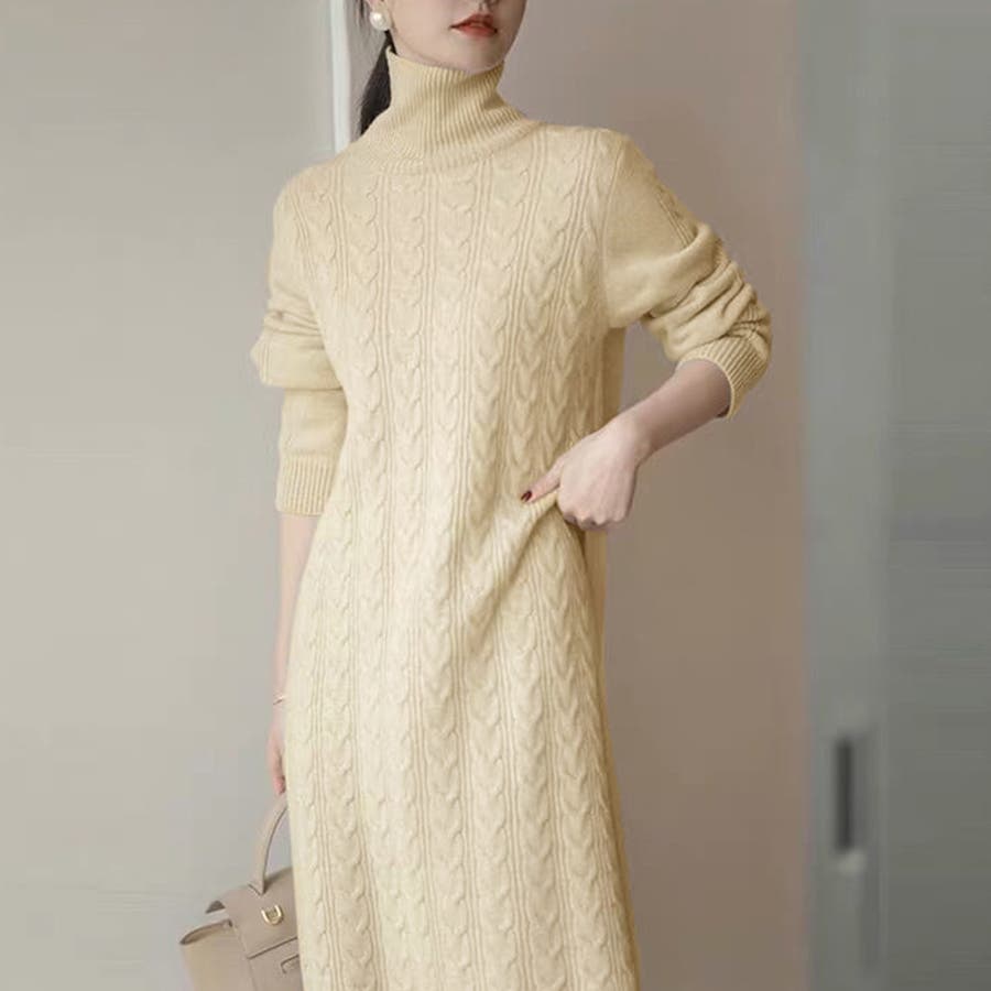 1枚で楽ちん&お洒落、フロントケーブル編みが大人可愛い韓国新作DESIGNのタートルネックニットワンピース