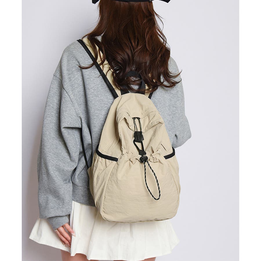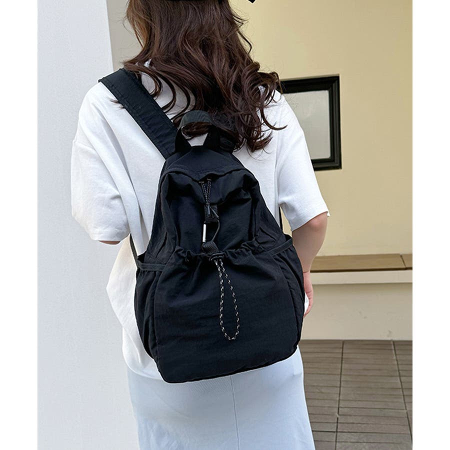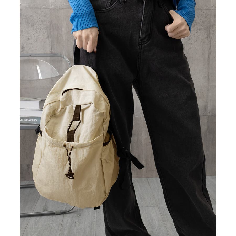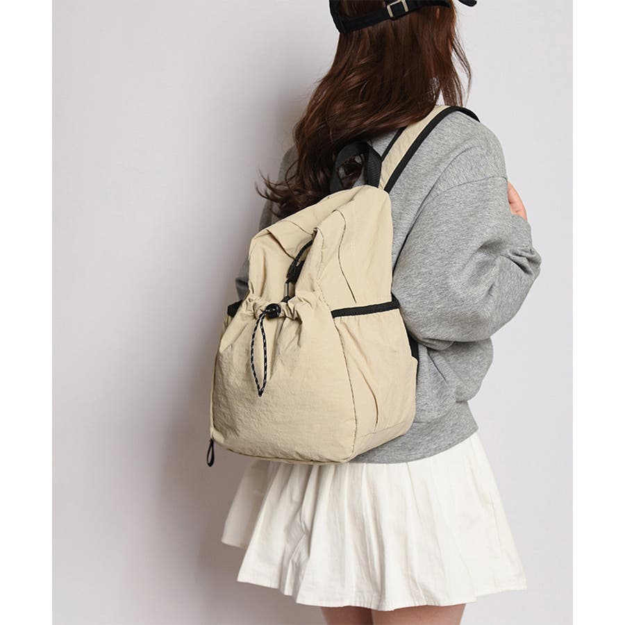 フロントのドローストリングデザインがアクセントになり、実用性とデザイン性を兼ね備えた一品。