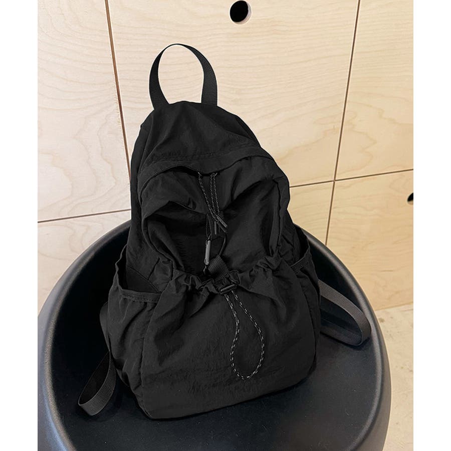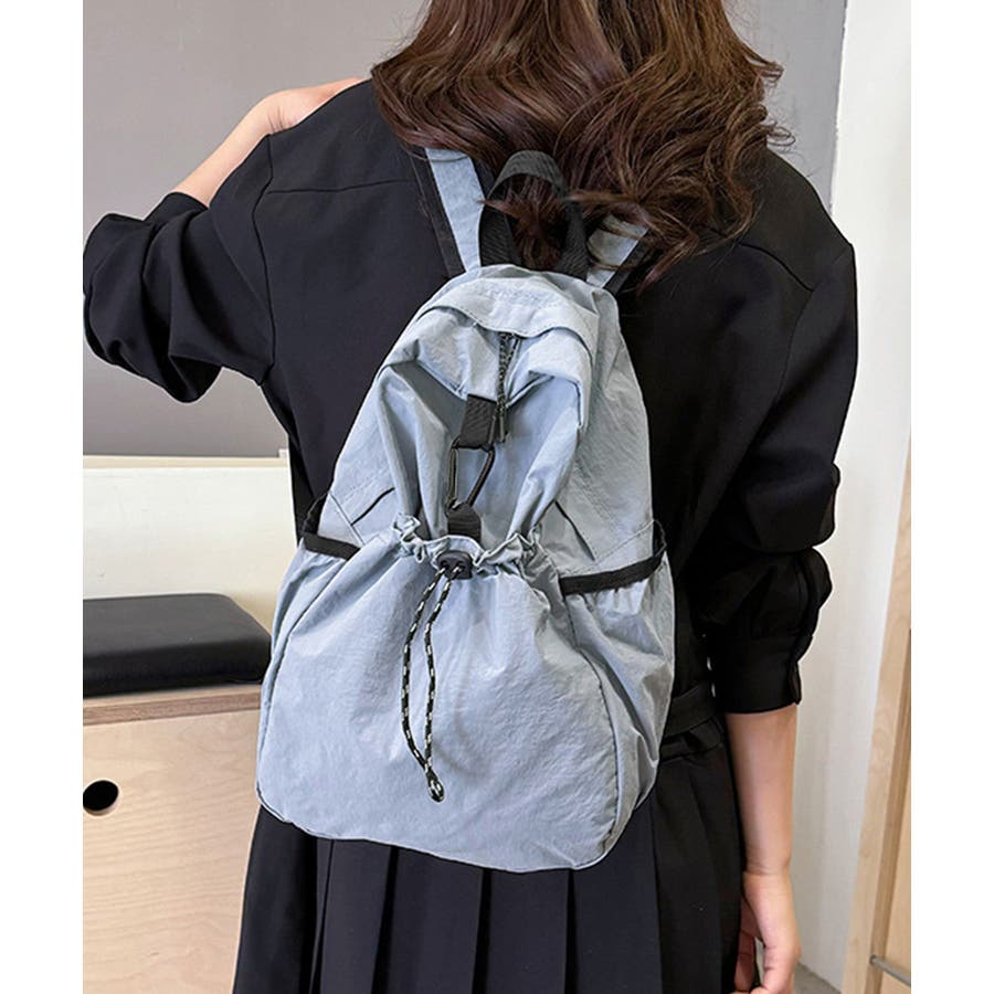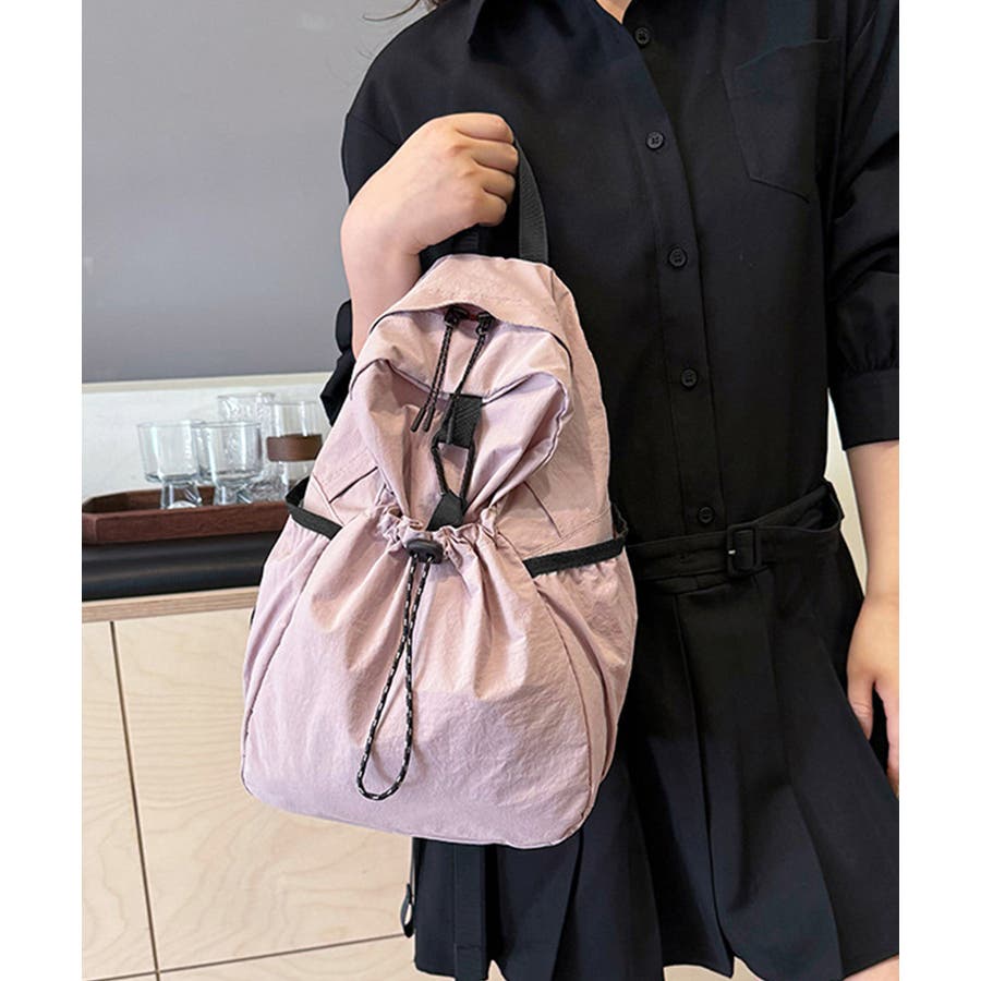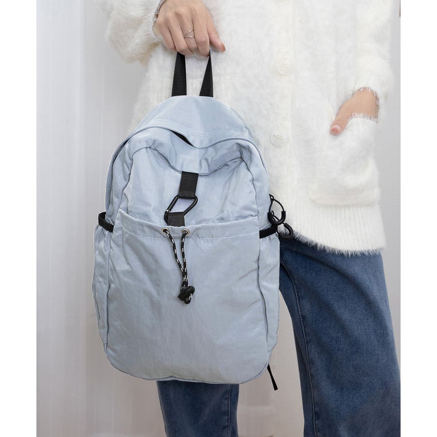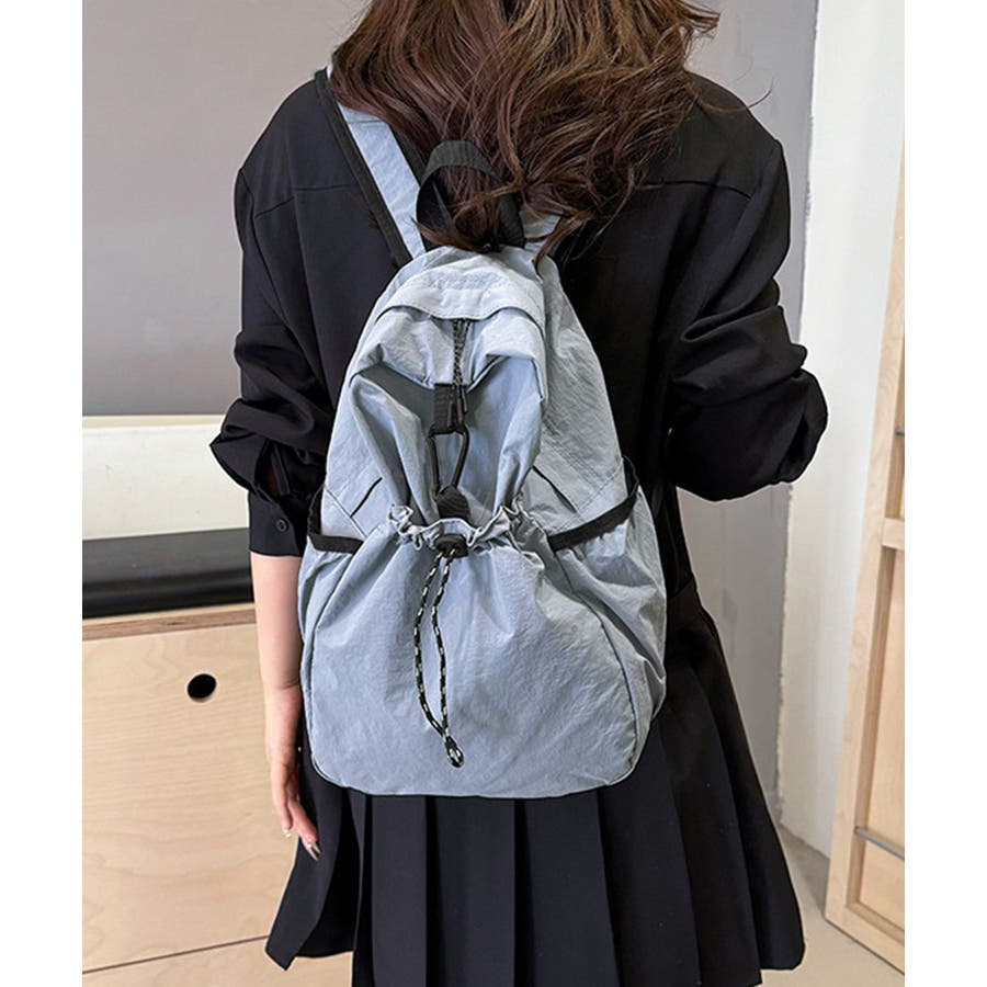 フロントのドローストリングデザインがアクセントになり、実用性とデザイン性を兼ね備えた一品。