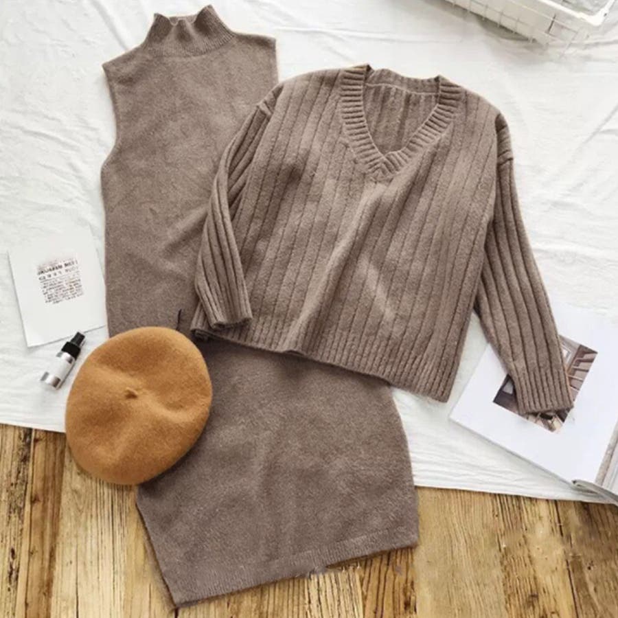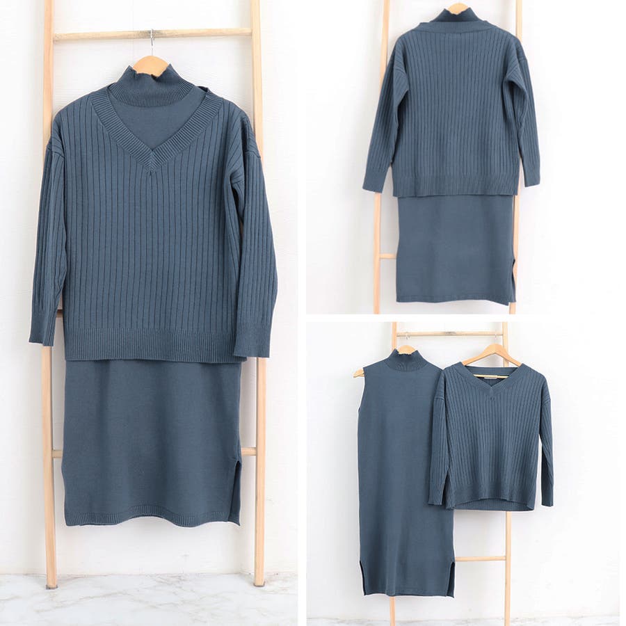Vネックトップスはデコルテラインを美しく魅せてさらにハイネックインナーにも合わせやすい、ワンピースは袖なしなので秋冬でももたつかずに春先までロングシーズン重宝する