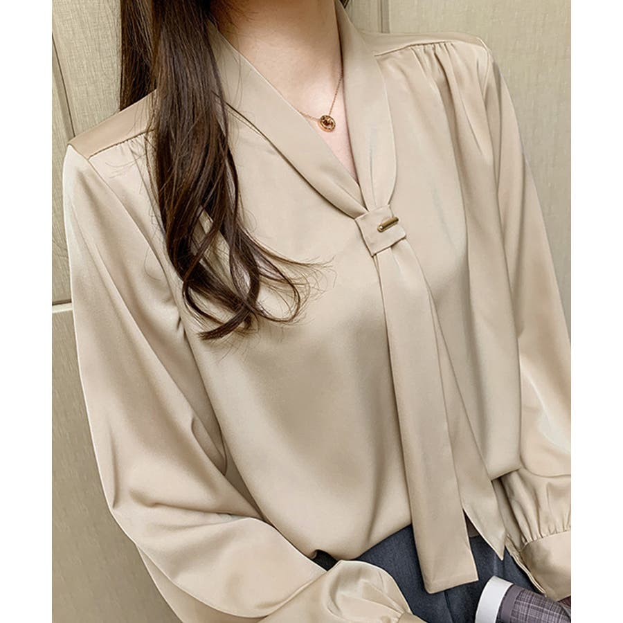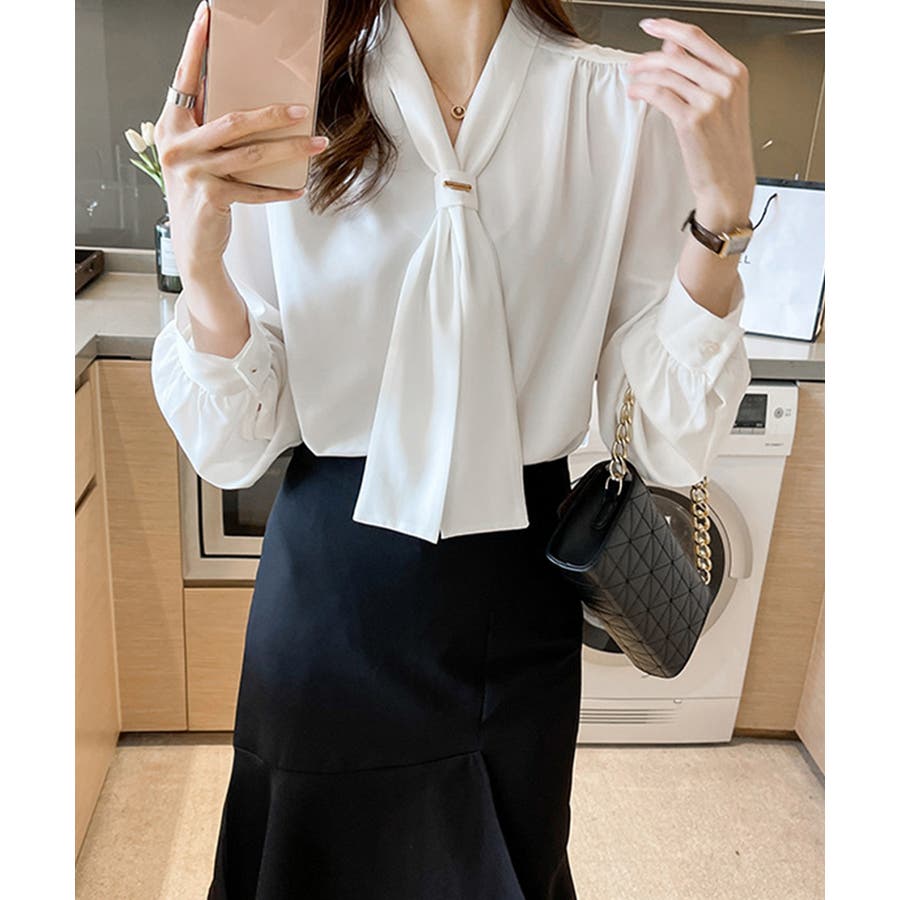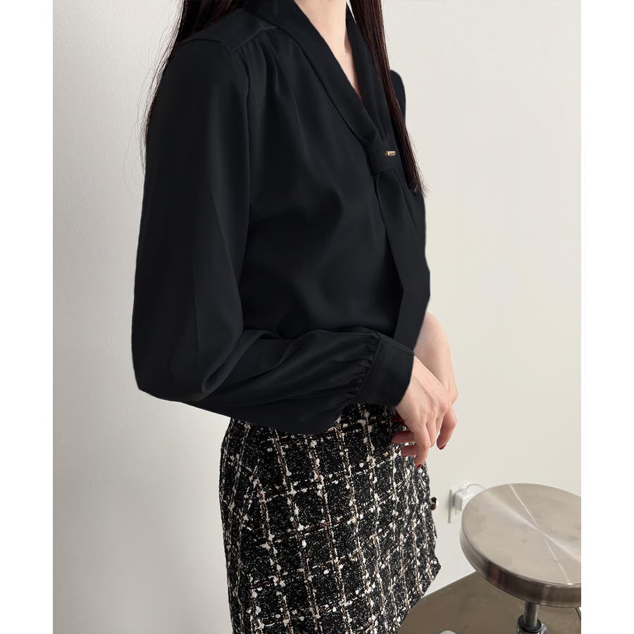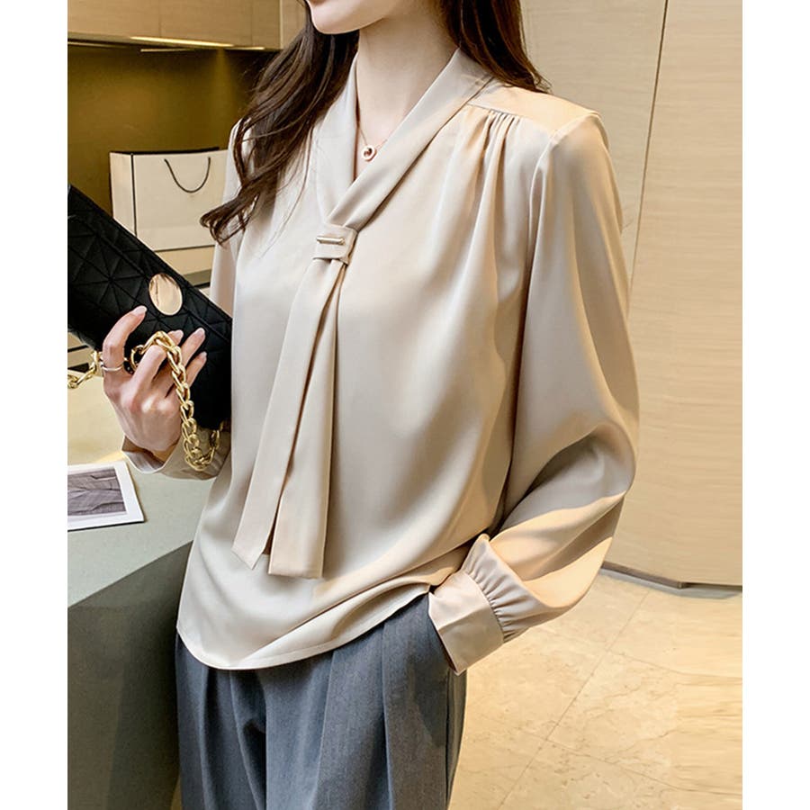 胸元のボウタイが上品な印象にしてくれるVネックブラウス