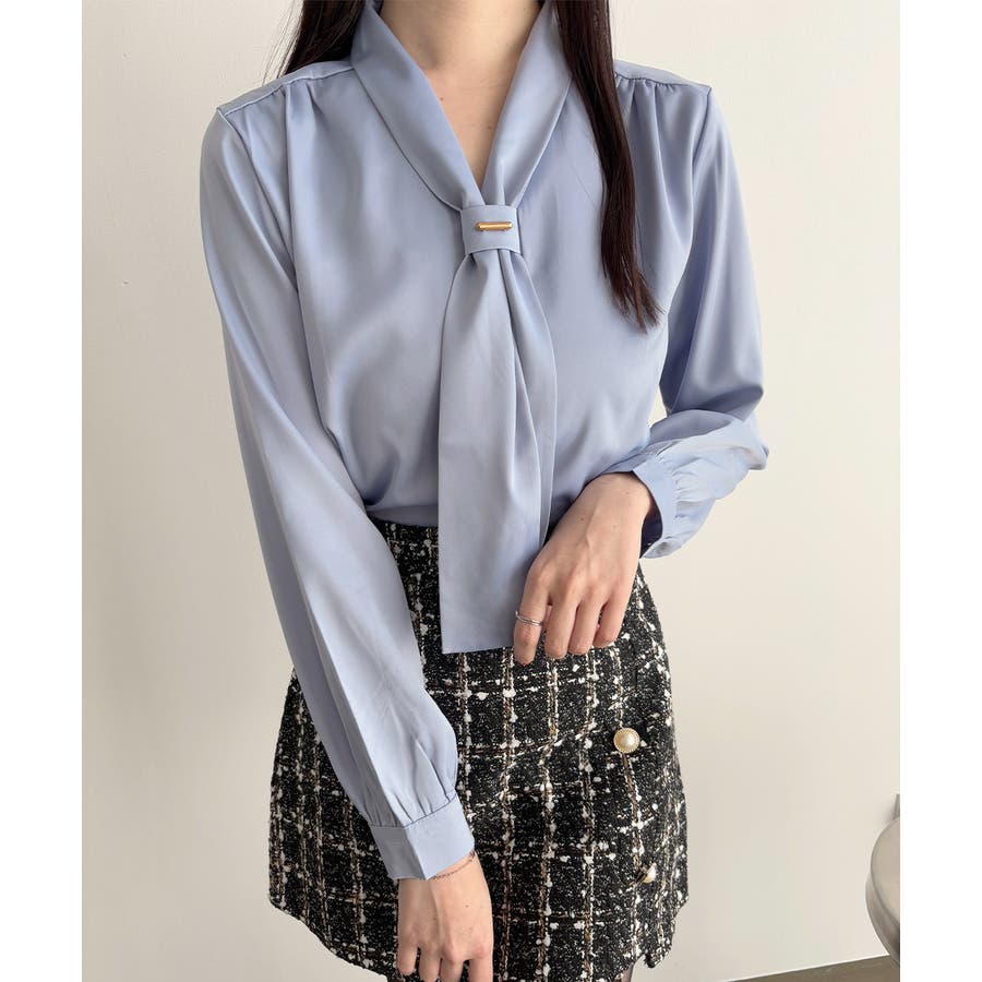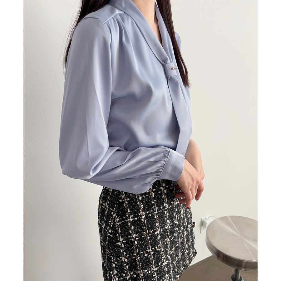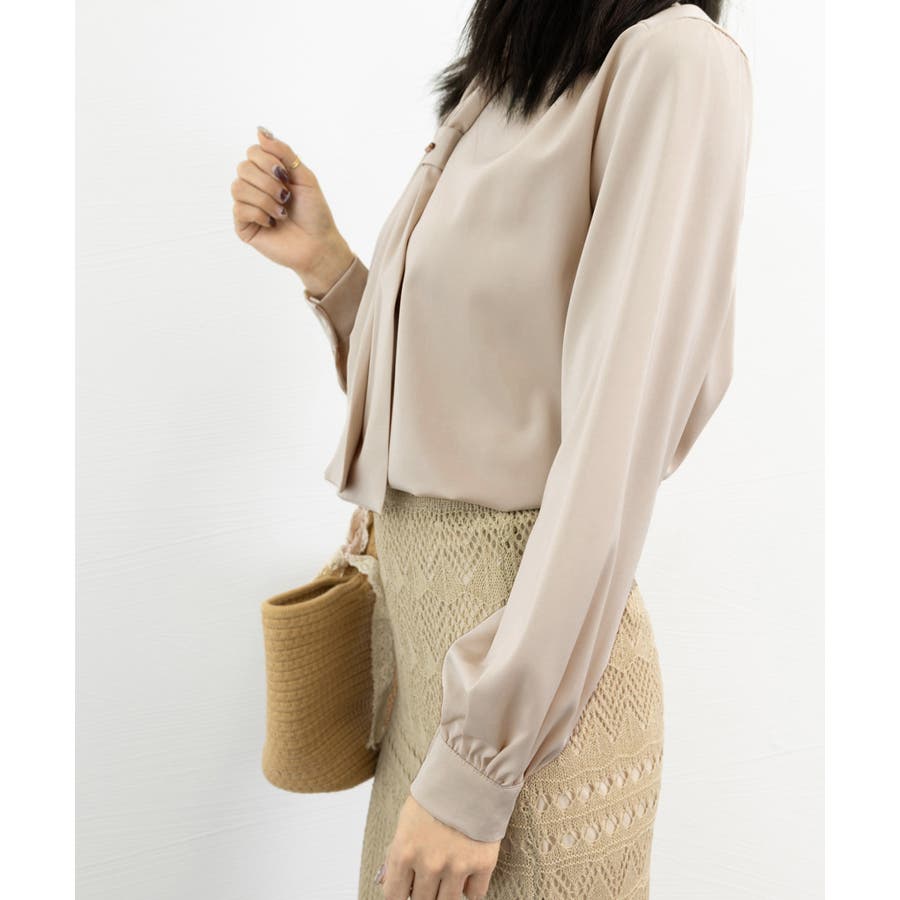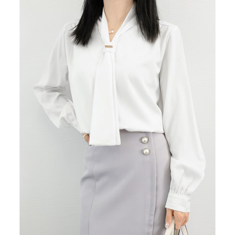 胸元のボウタイが上品な印象にしてくれるVネックブラウス
