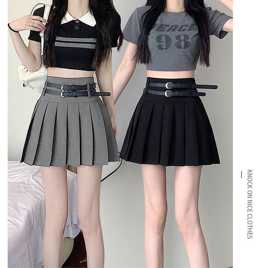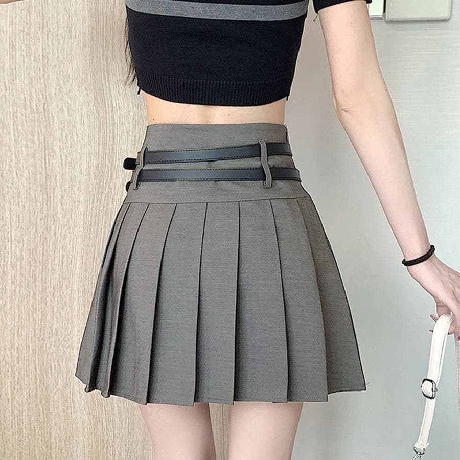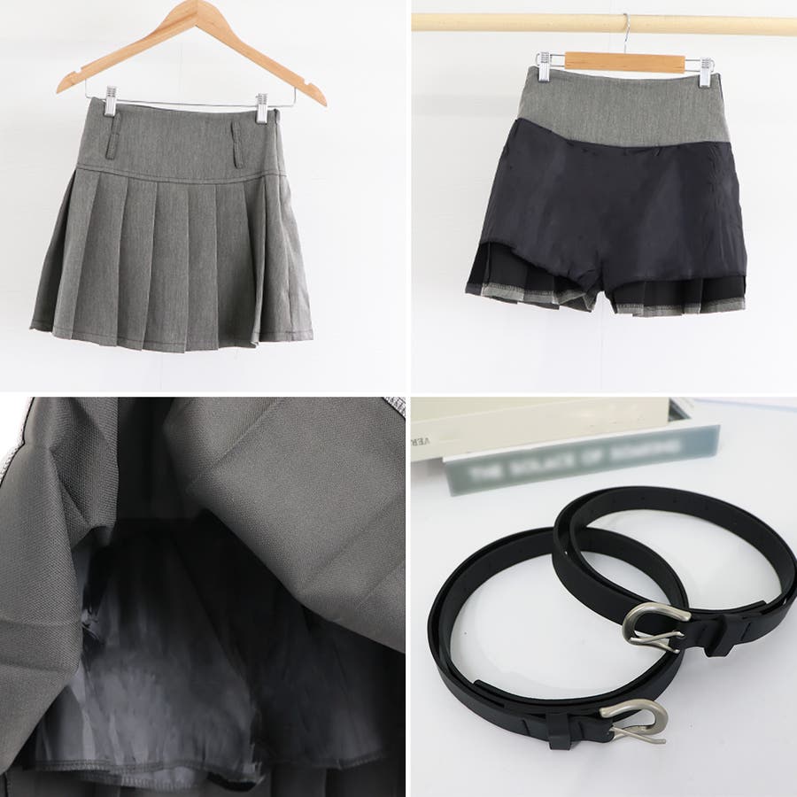 ウエストのベルトデザインが特徴のプリーツミニスカート