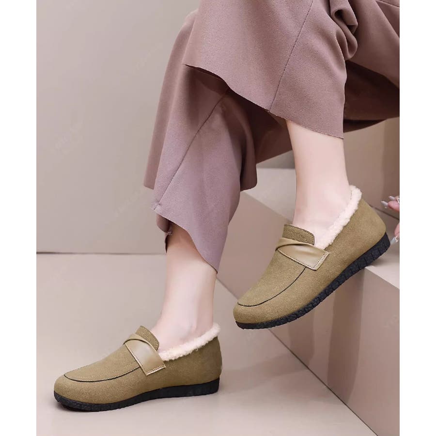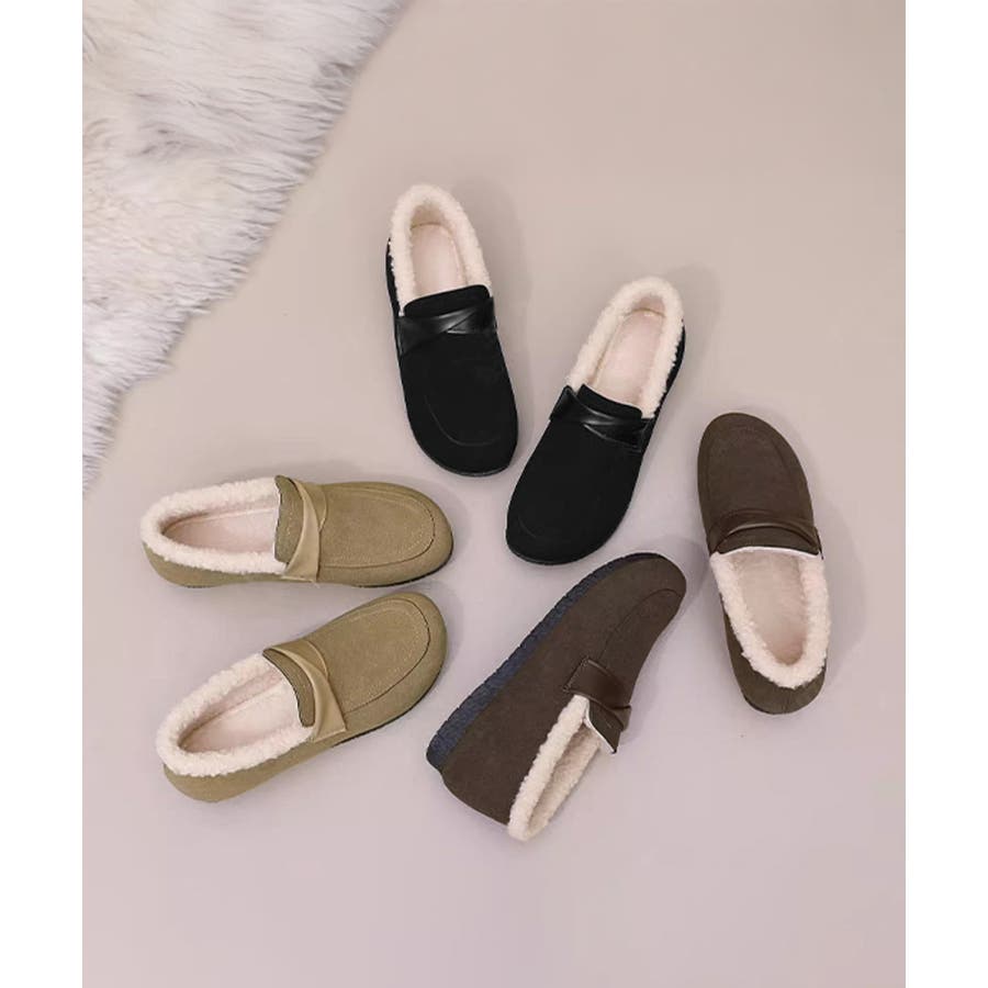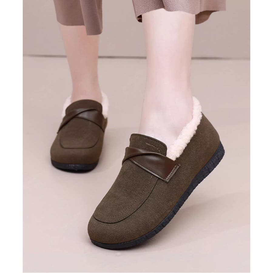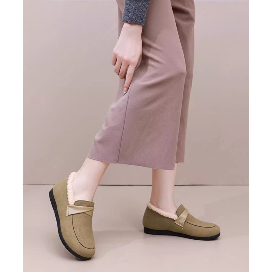 シンプルなデザインで秋冬コーデを軽やかに仕上げるファーモカシン。