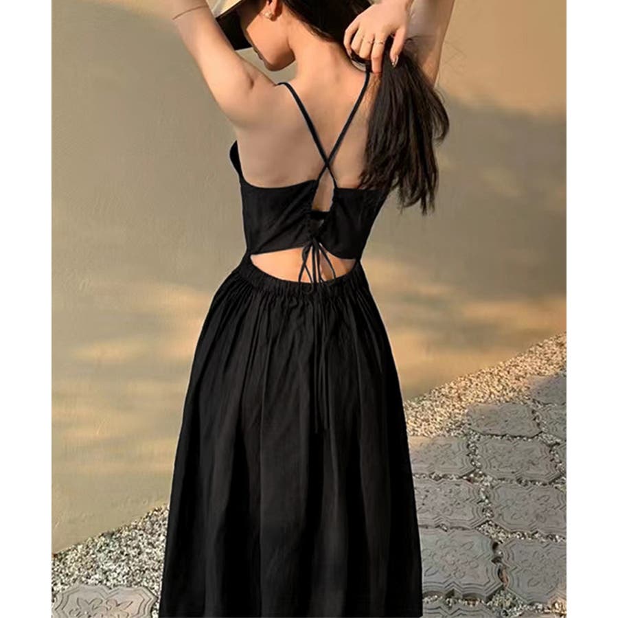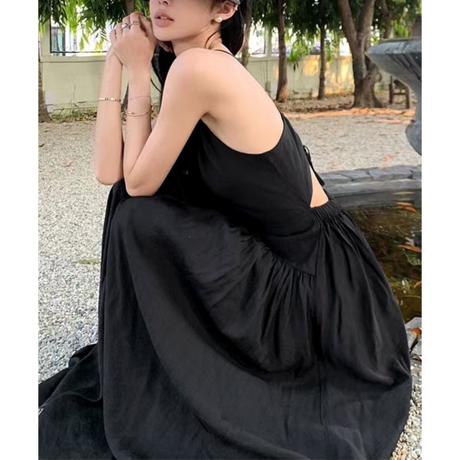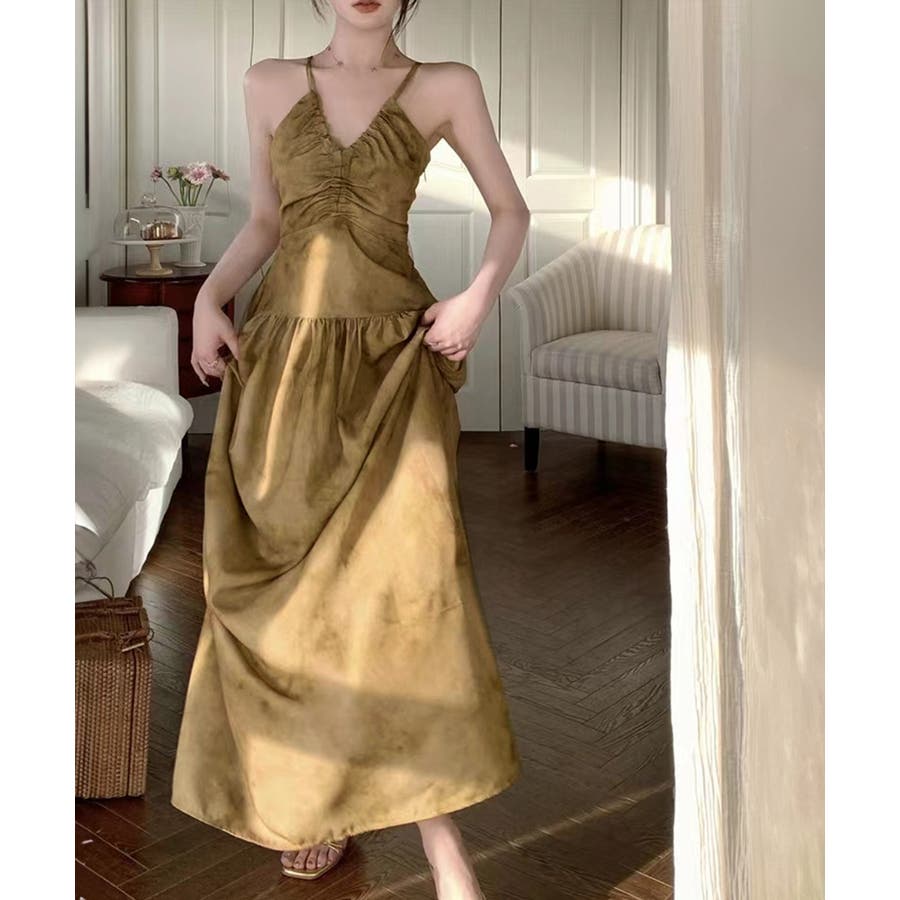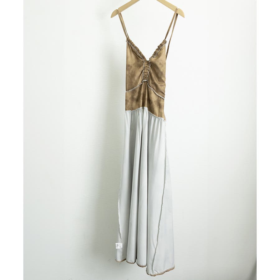 胸元のシャーリングアクセントでさりげないニュアンスチェンジが楽しめ、バックスタイルのリボン結びと肌見せがセンシュアルな印象に