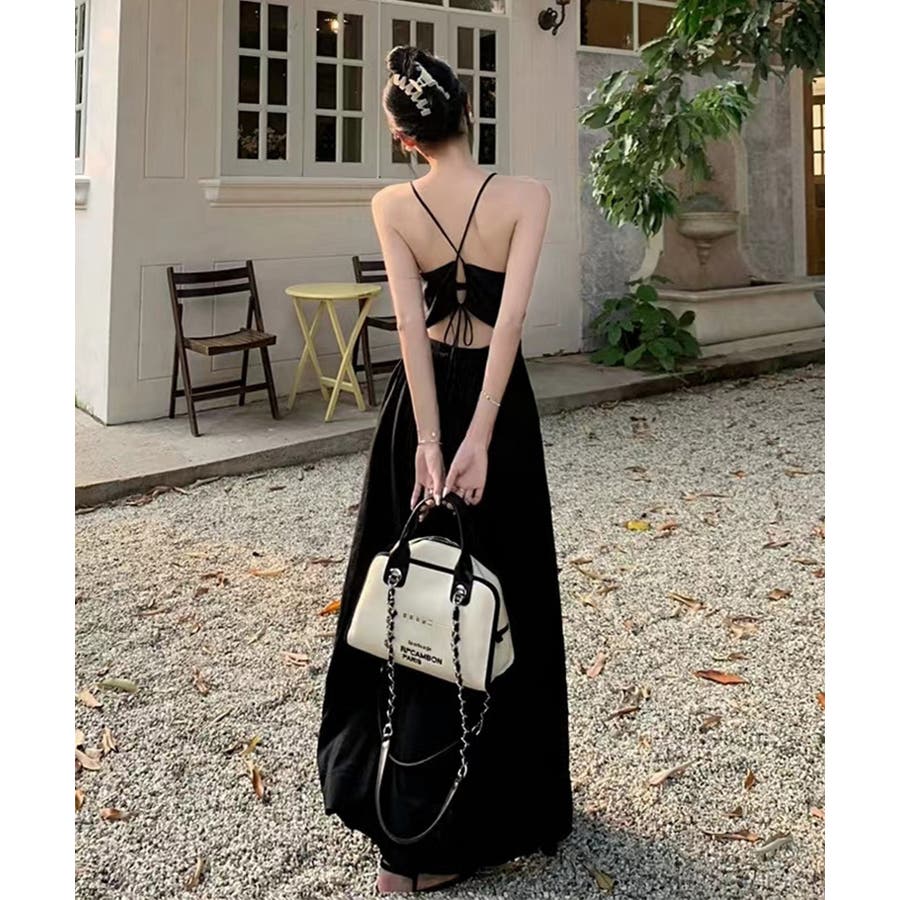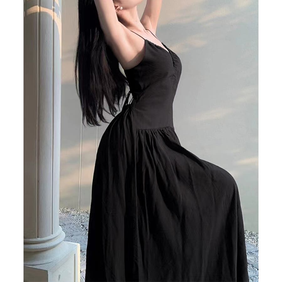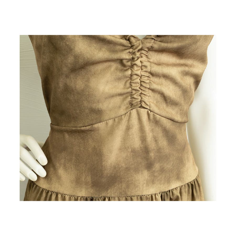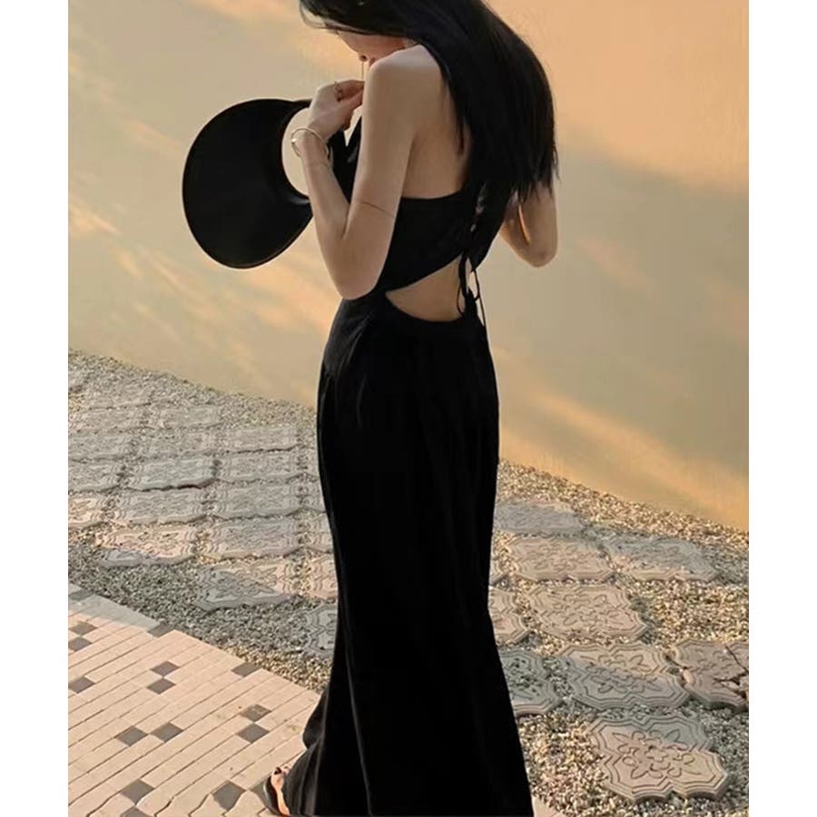 胸元のシャーリングアクセントでさりげないニュアンスチェンジが楽しめ、バックスタイルのリボン結びと肌見せがセンシュアルな印象に