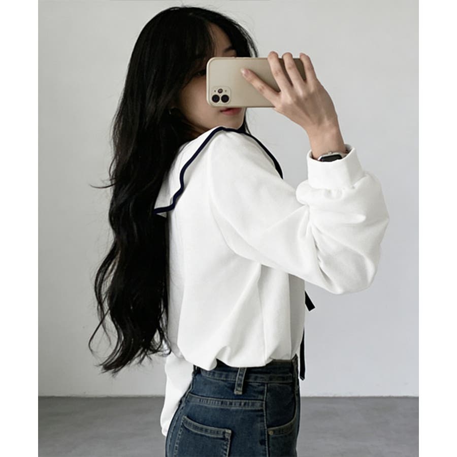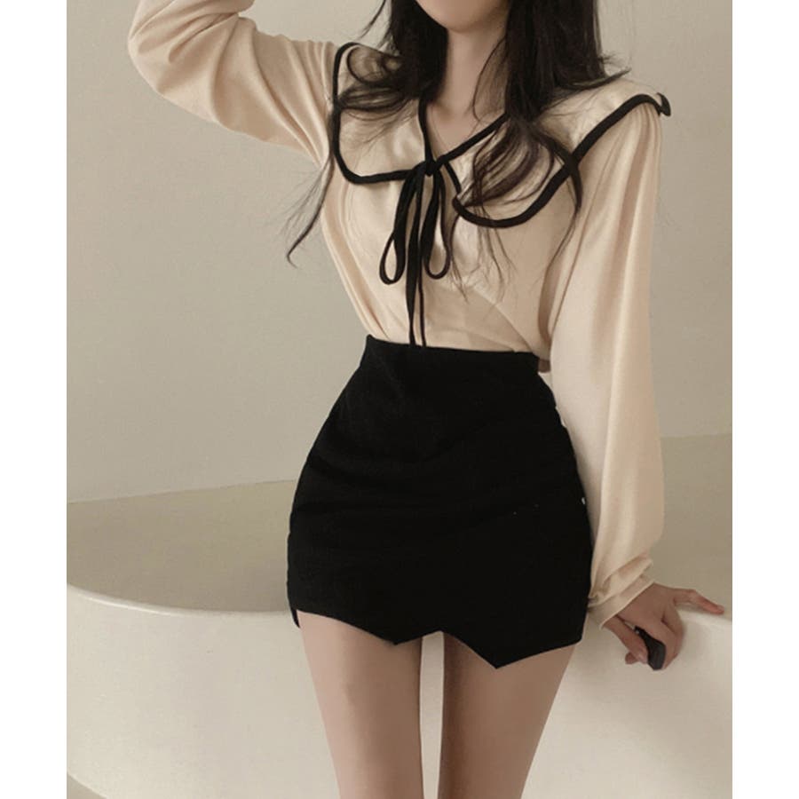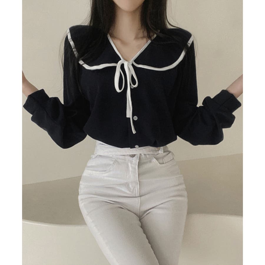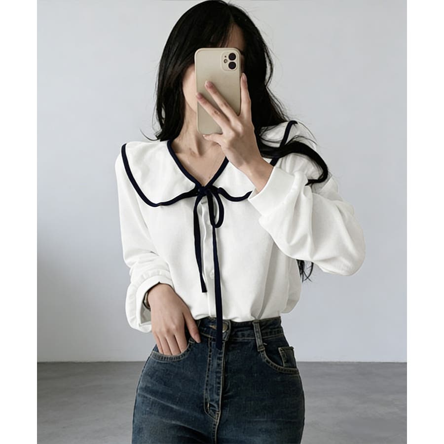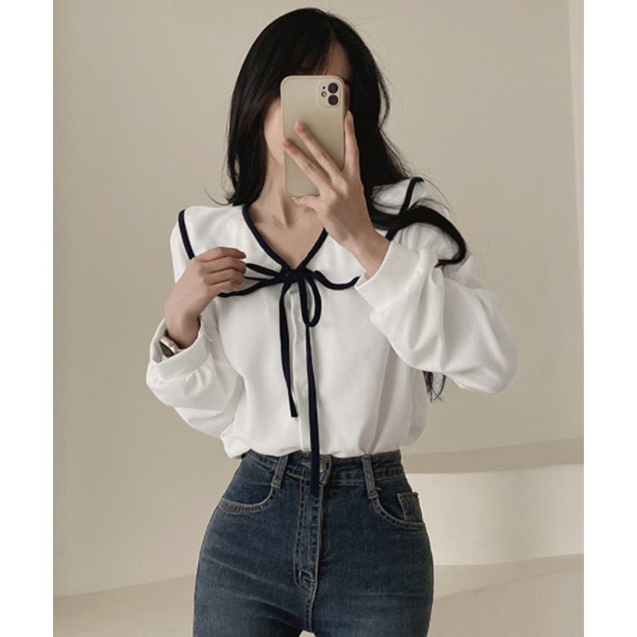 フレンチムード漂うリボンタイ付きのビッグカラーブラウス。