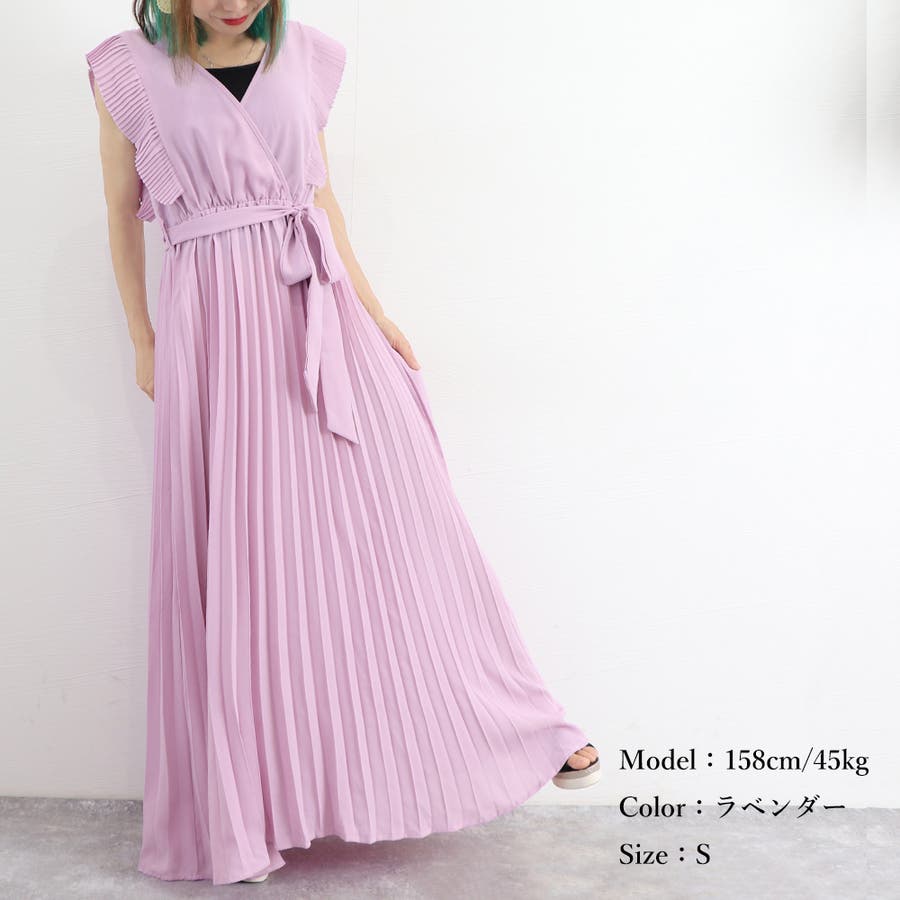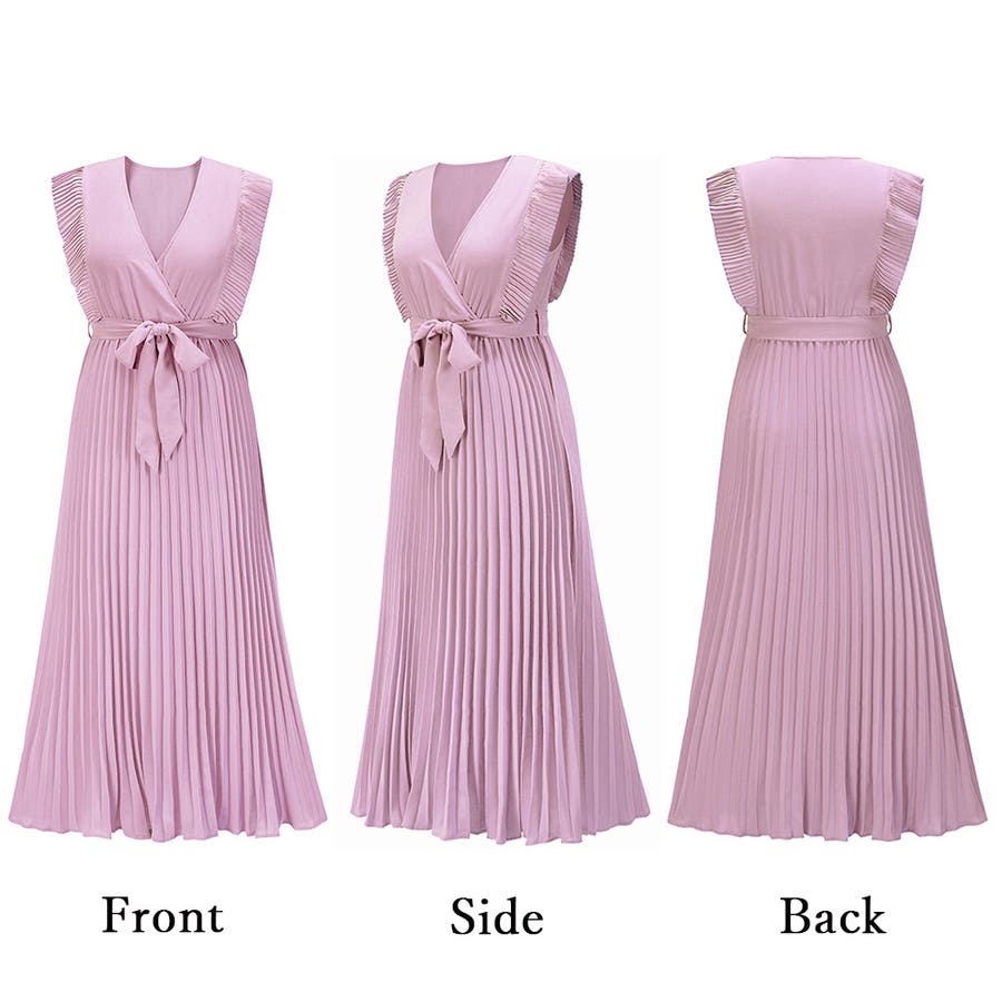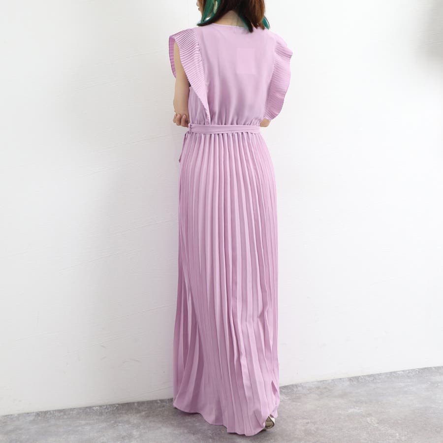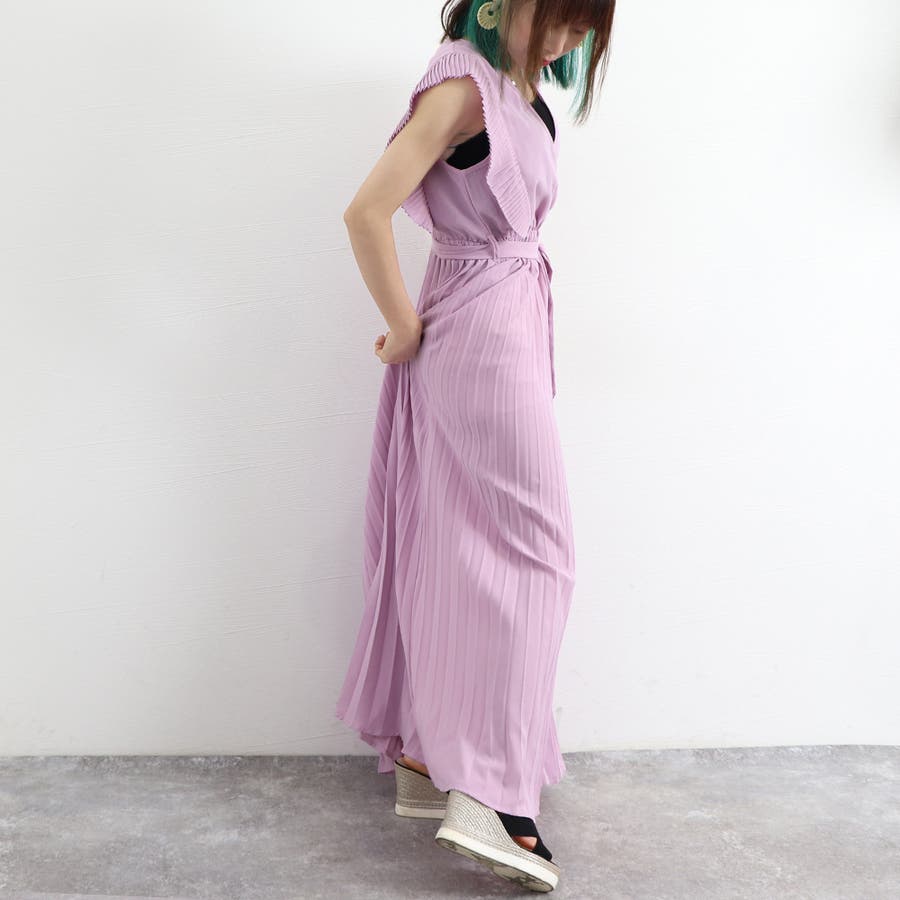 上品で優雅な印象を与えるプリーツロングワンピース。