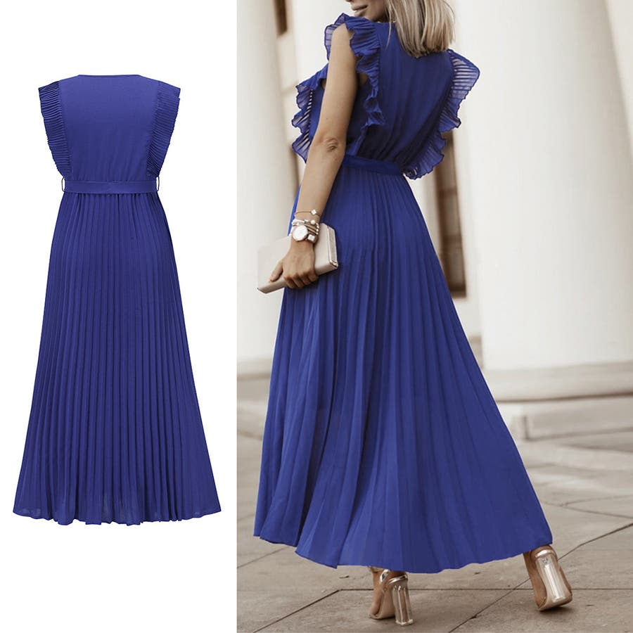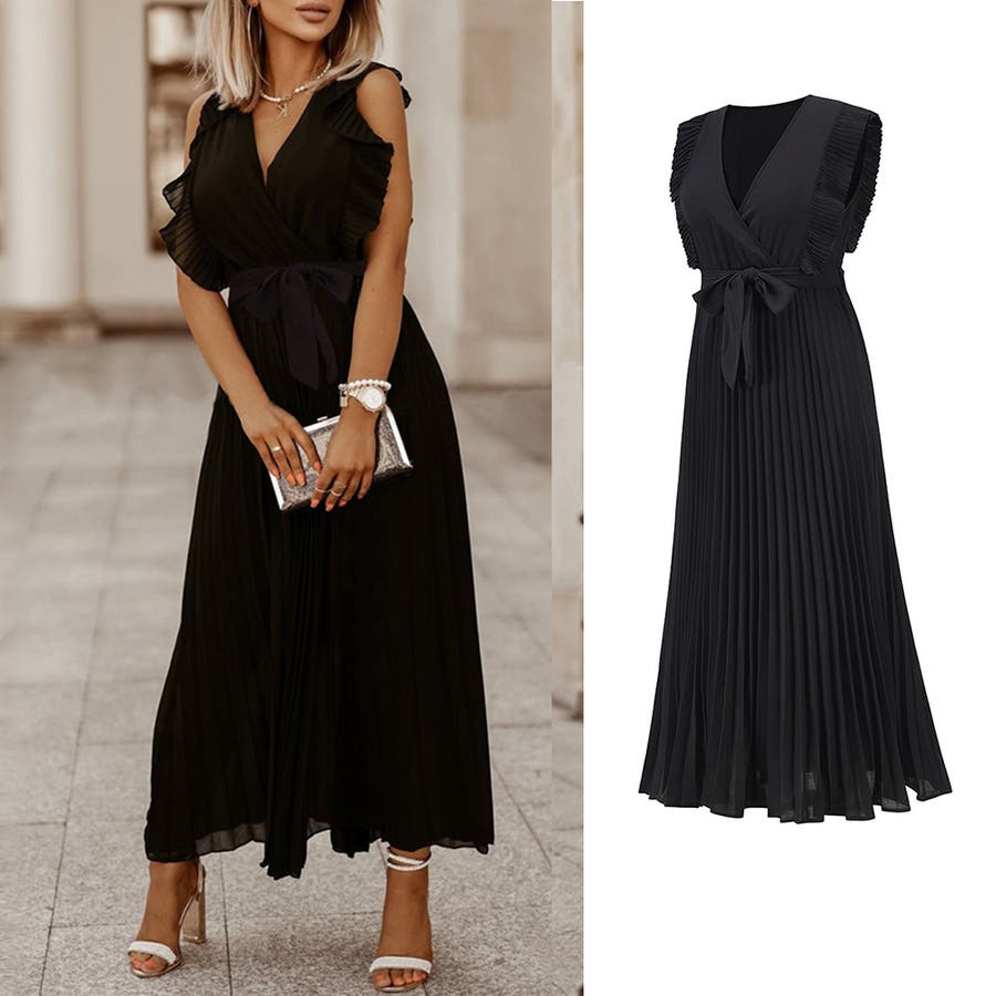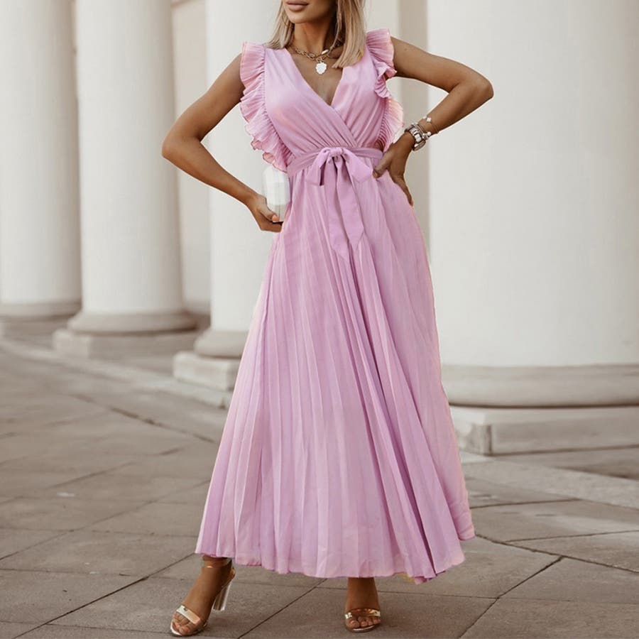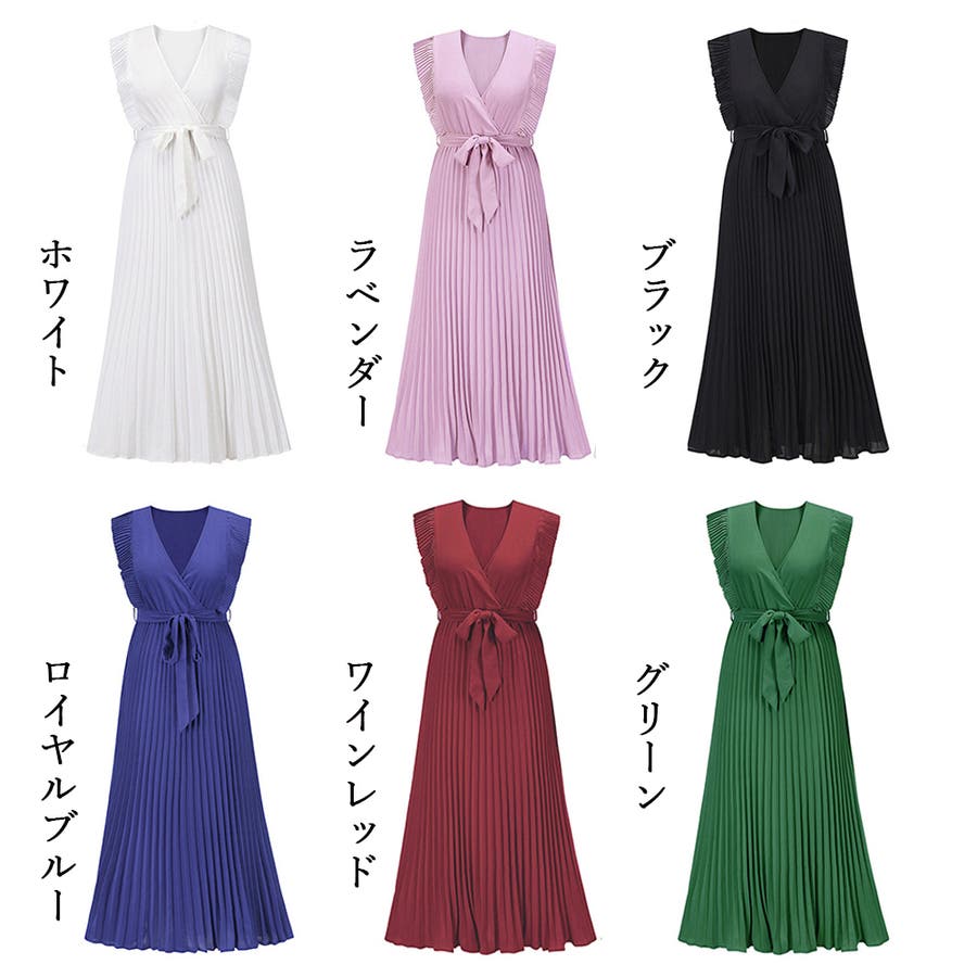 上品で優雅な印象を与えるプリーツロングワンピース。