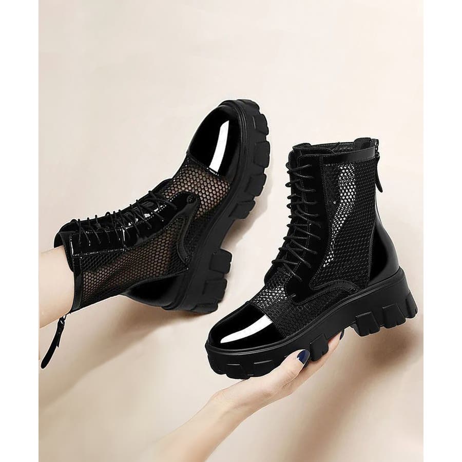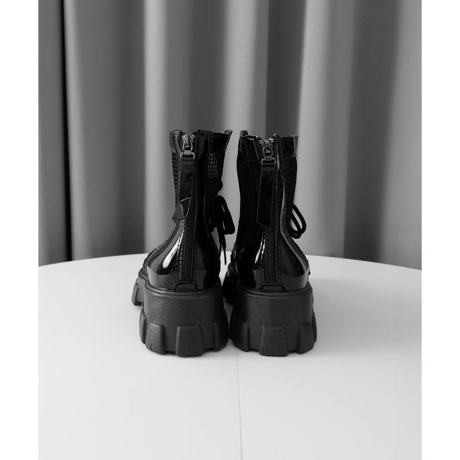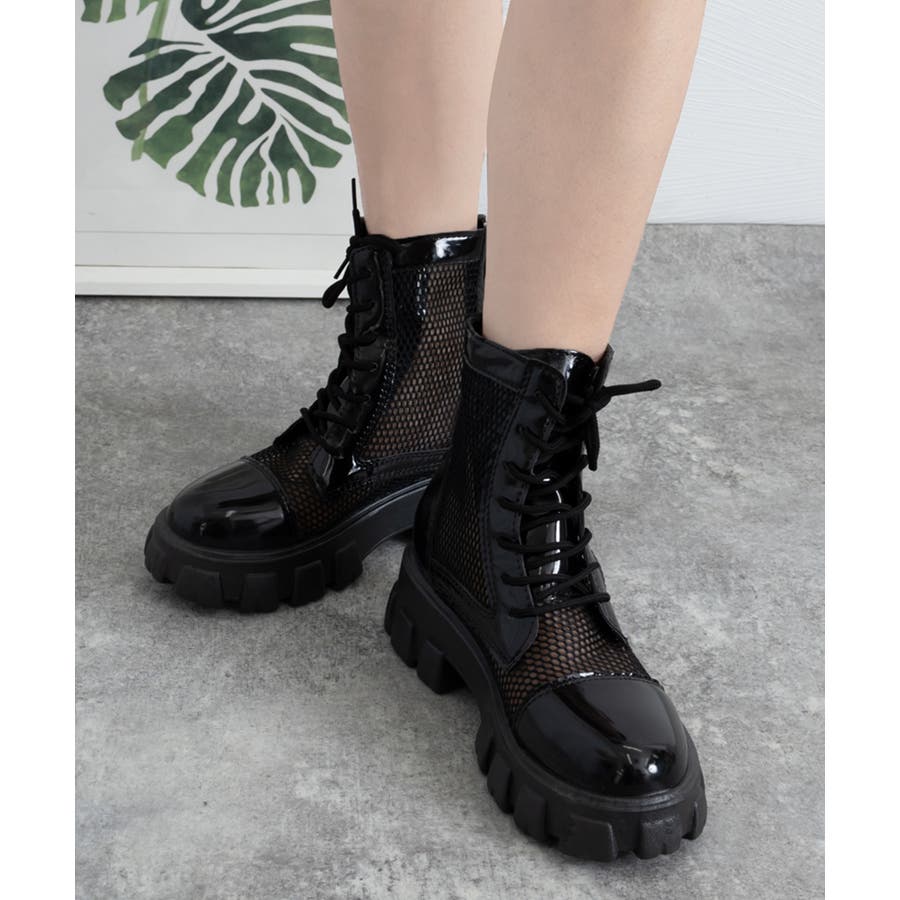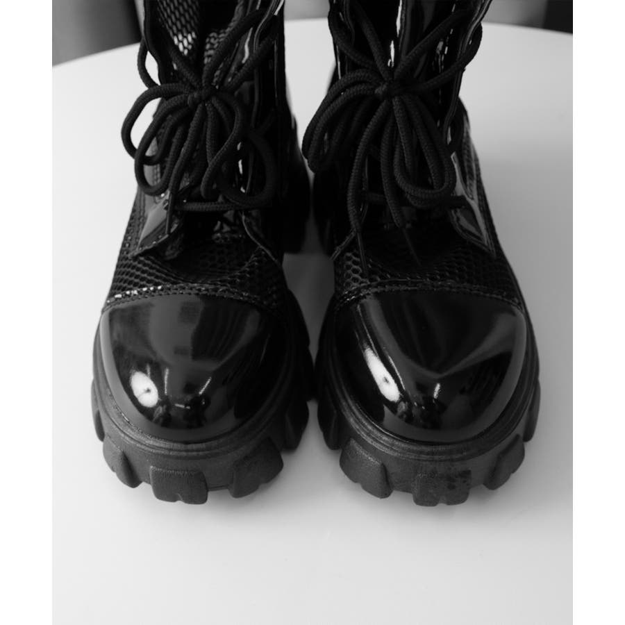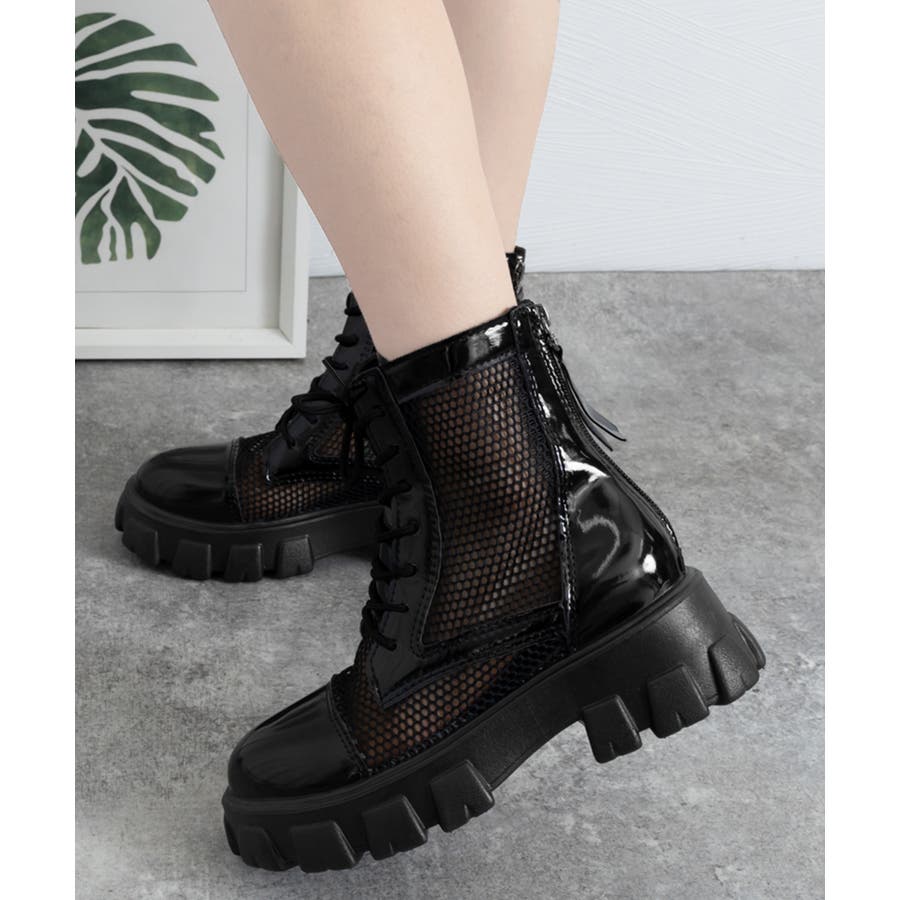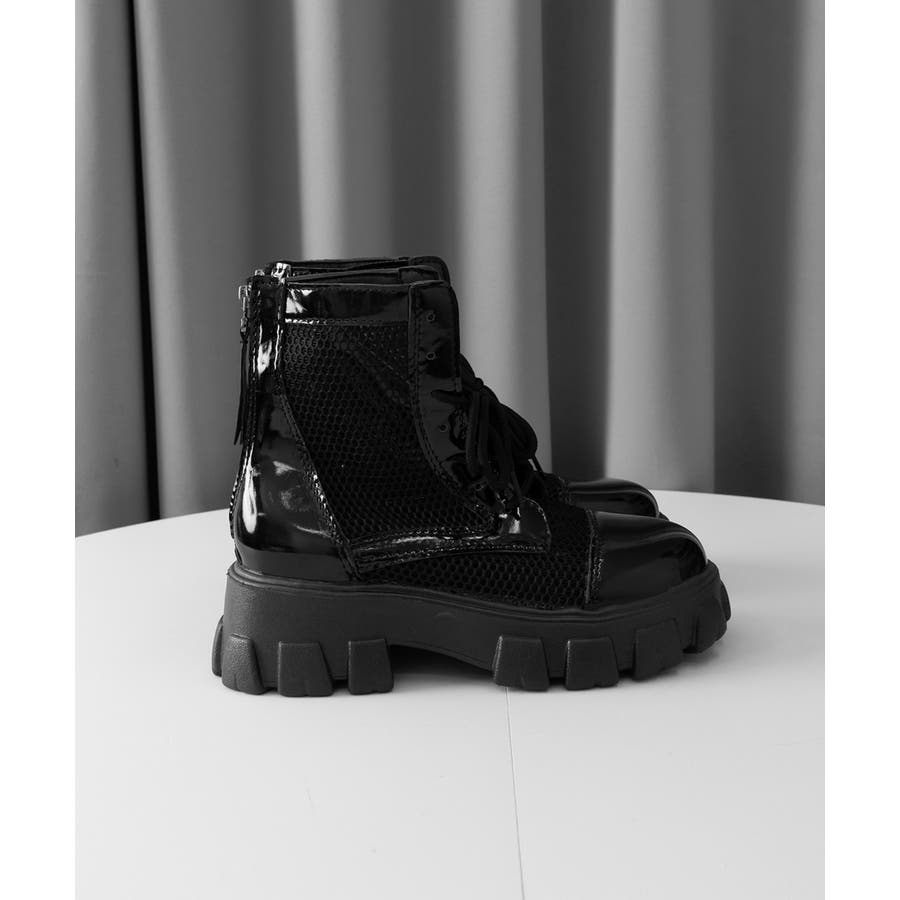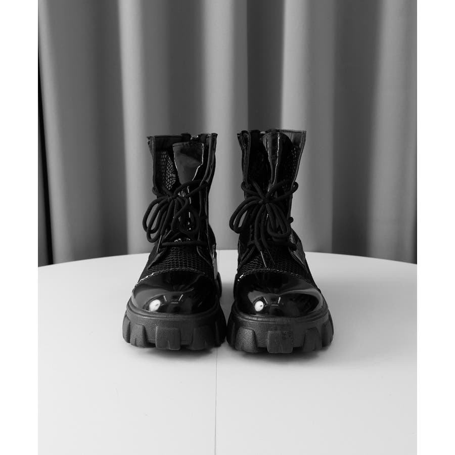 重くなりがちなトラックソールにシアー素材でフェミニンスタイルに大変身するシースルーブーツ