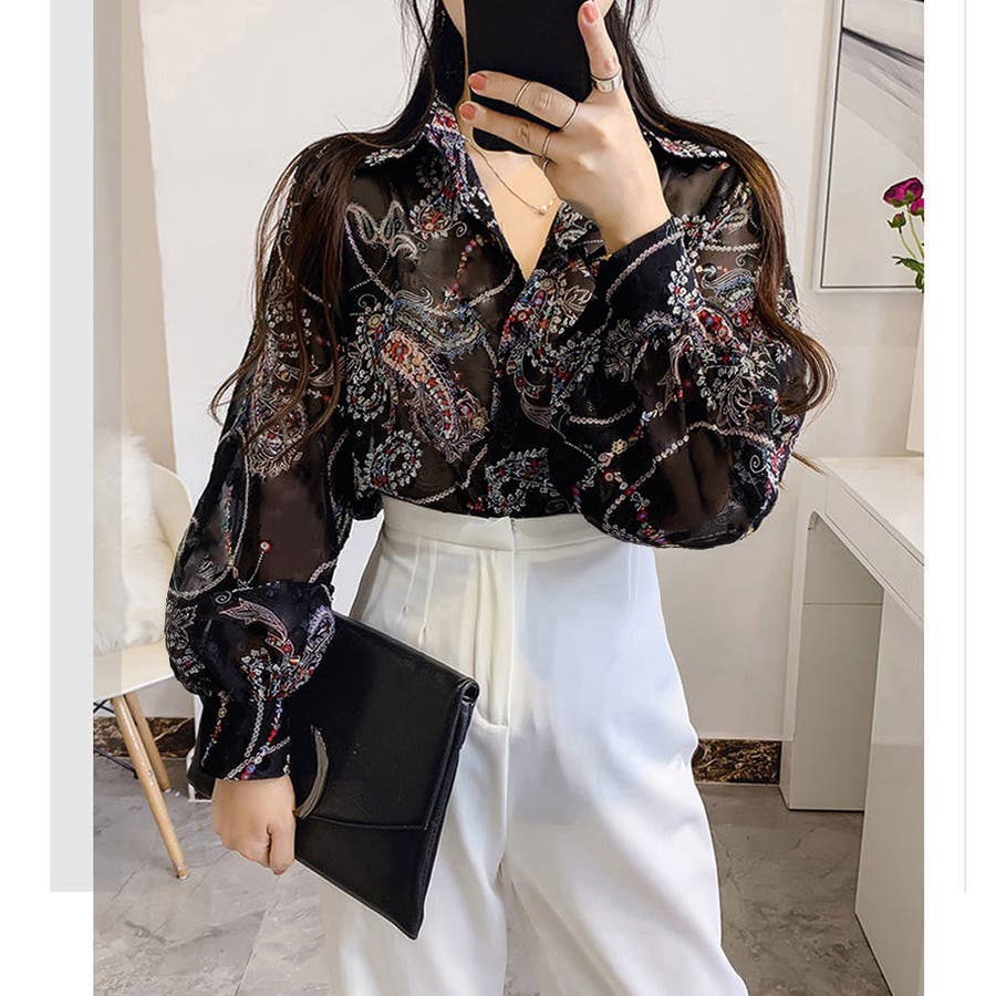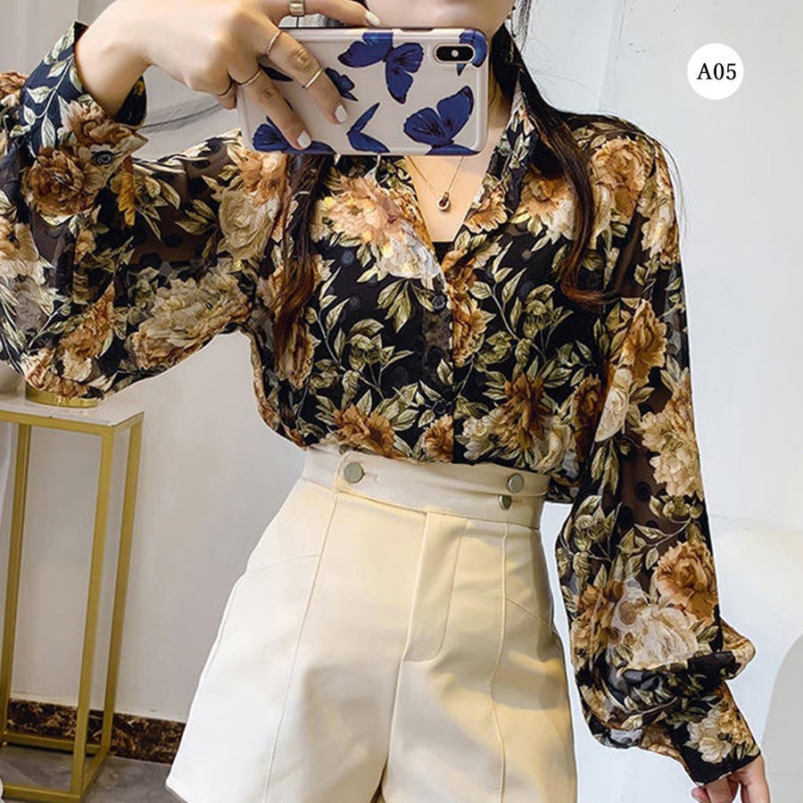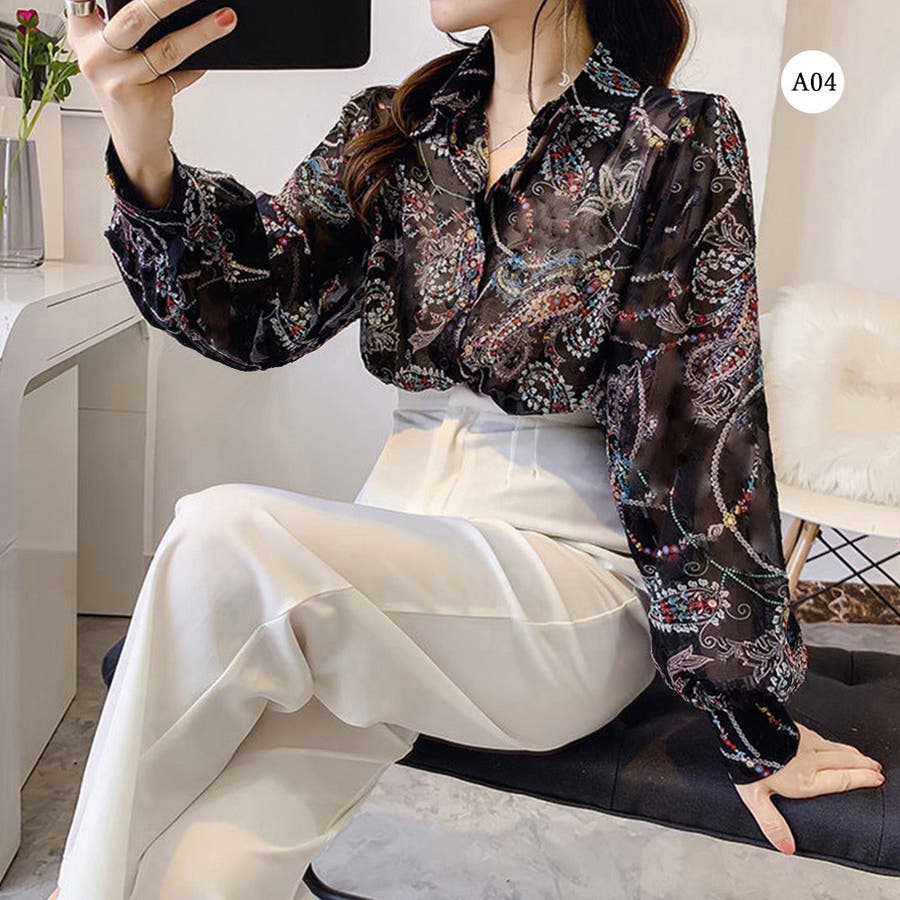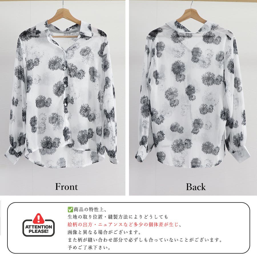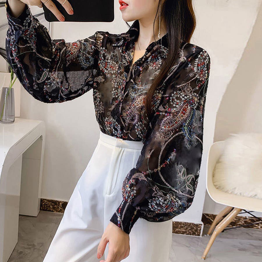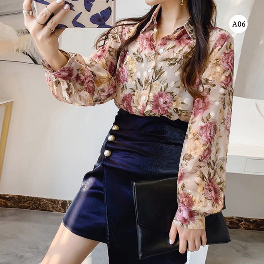 シャツブラウス 花柄 シアーブラウス長袖