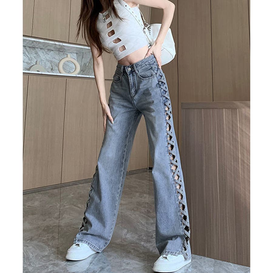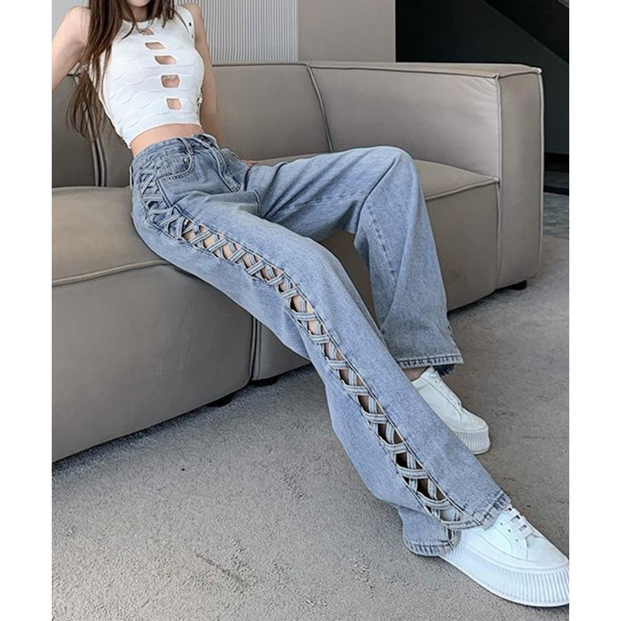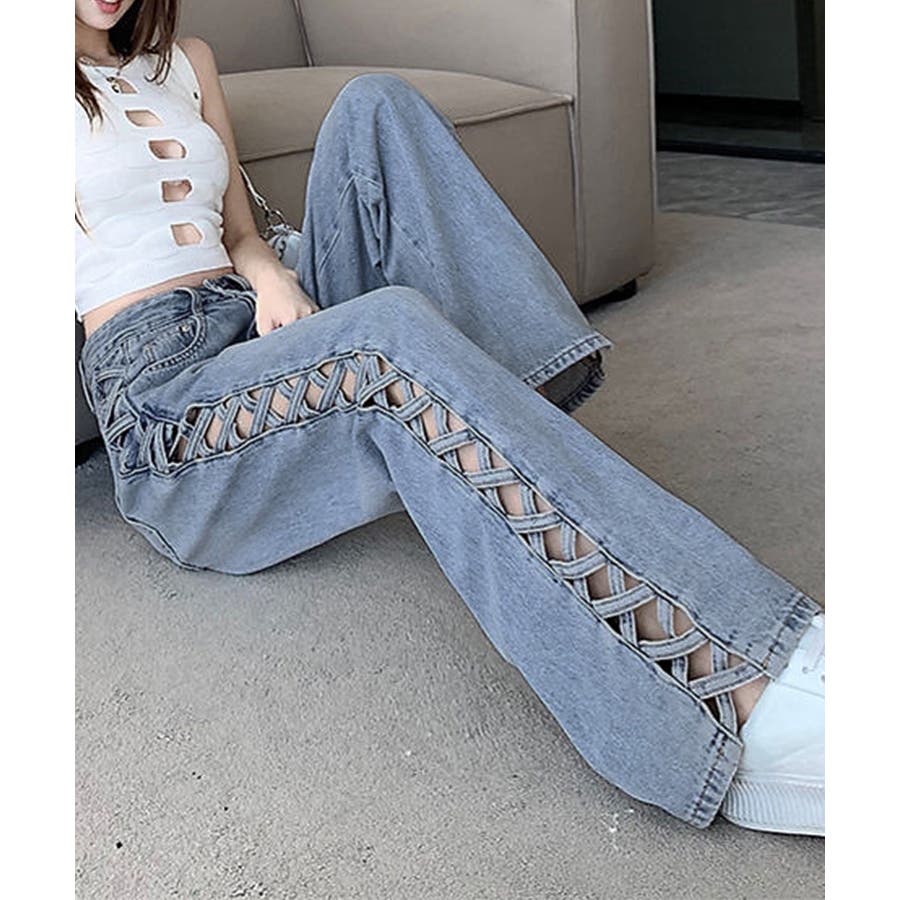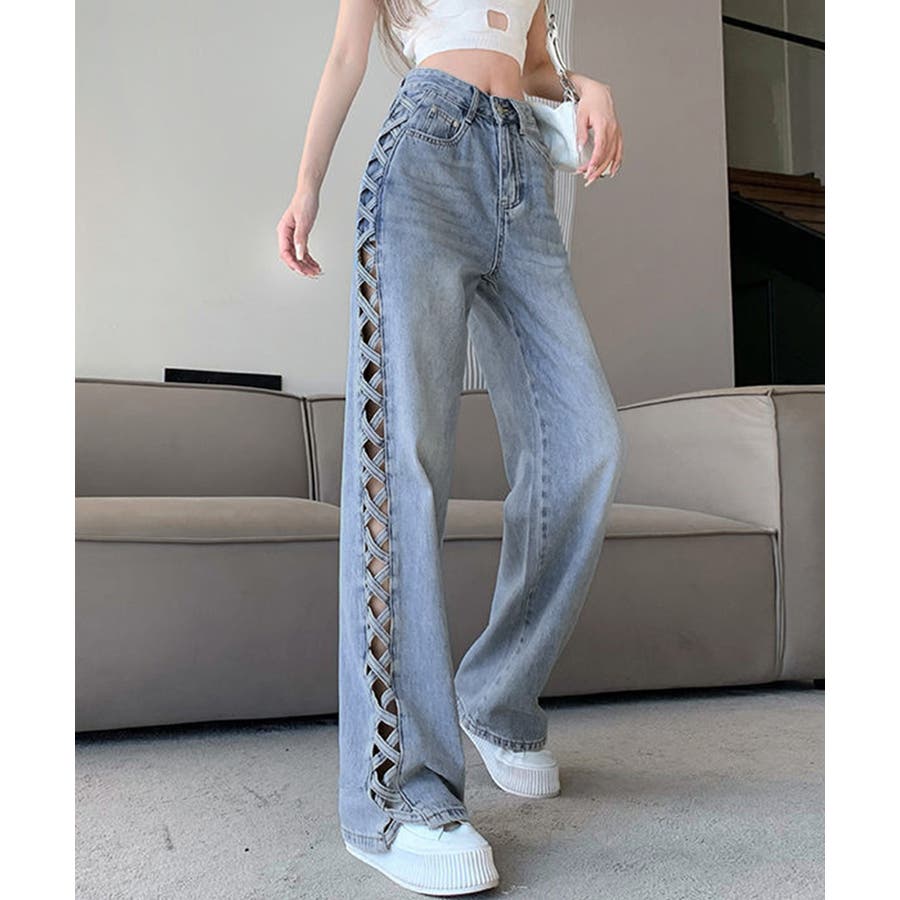 レディース ハイウエスト Y2Kストレートパンツ 肌見せ セクシージーンズ サイドオープンデニム 美脚脚長ボトムス着やせ