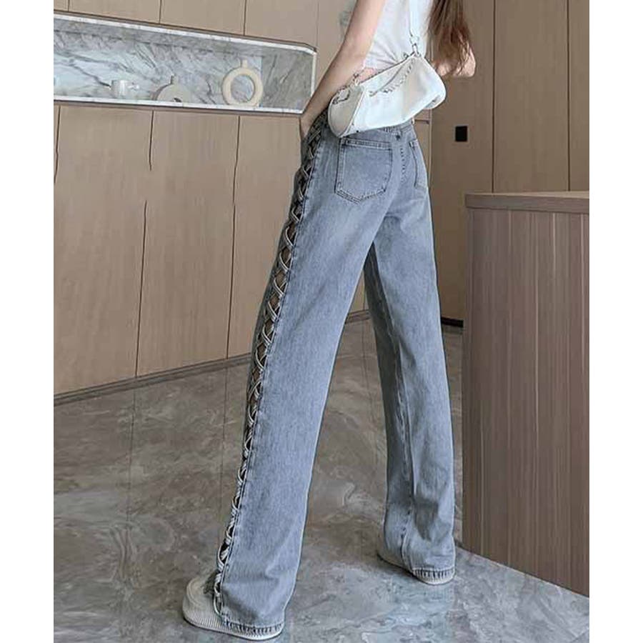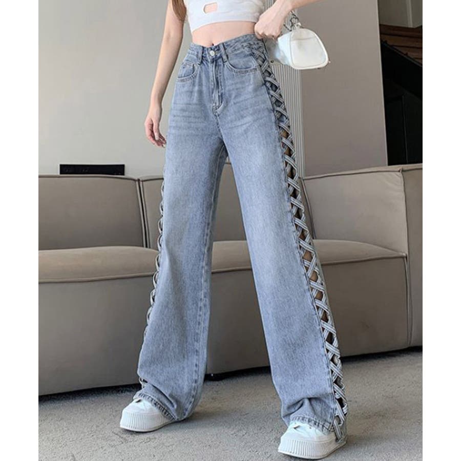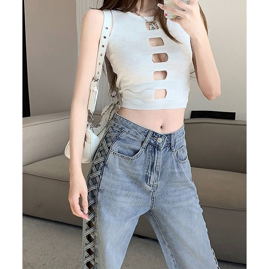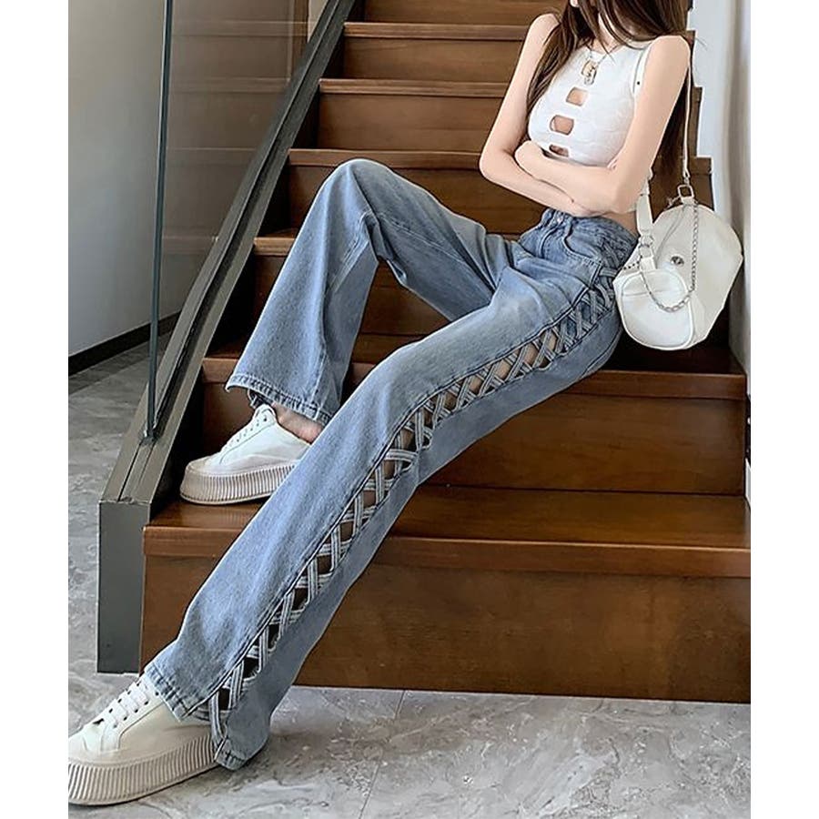 レディース ハイウエスト Y2Kストレートパンツ 肌見せ セクシージーンズ サイドオープンデニム 美脚脚長ボトムス着やせ