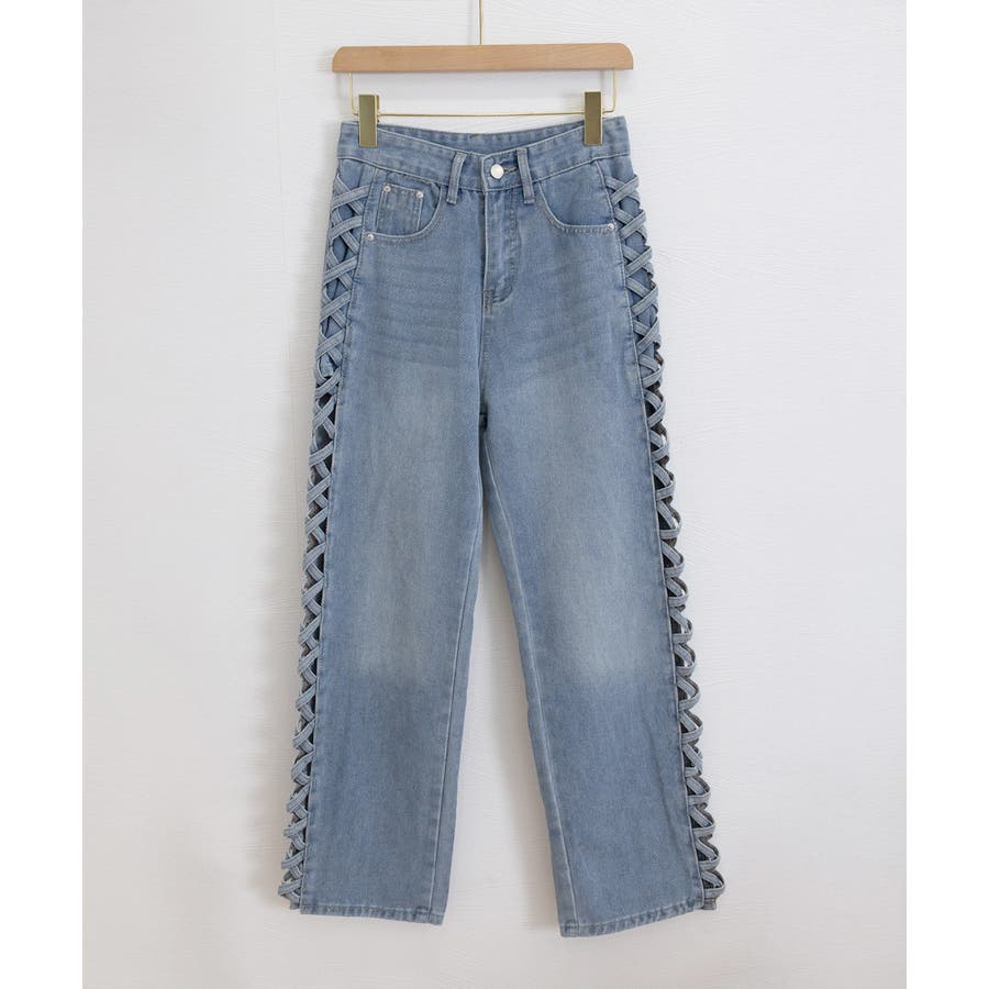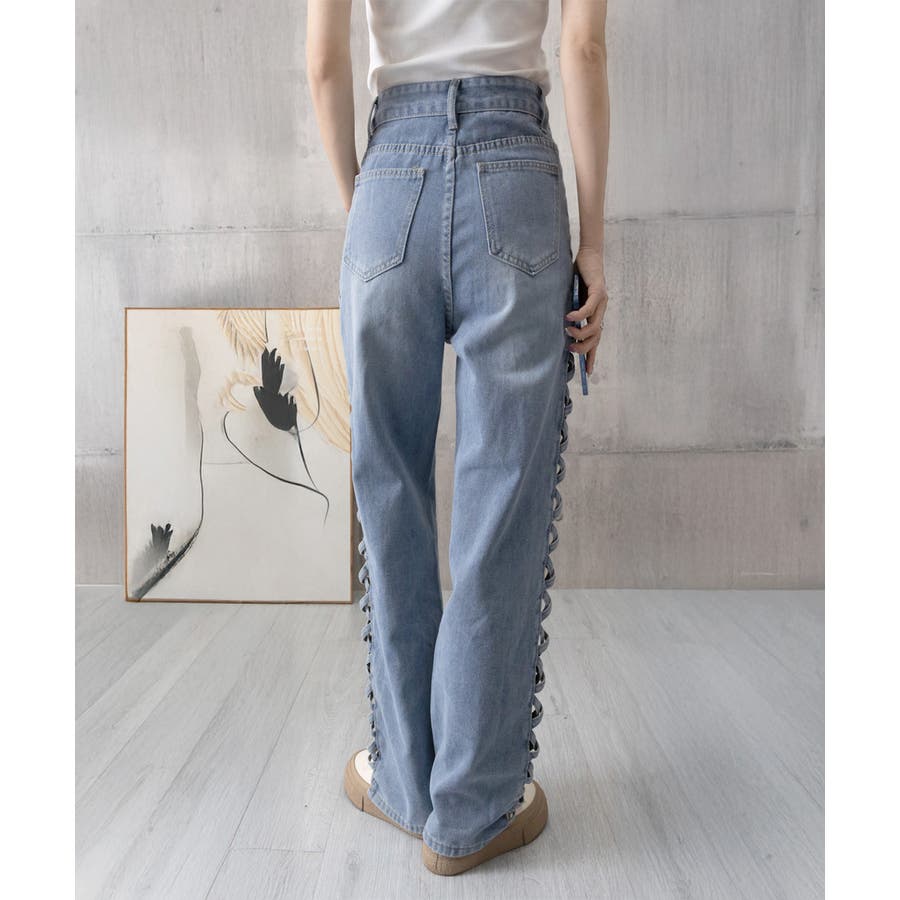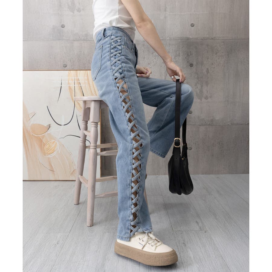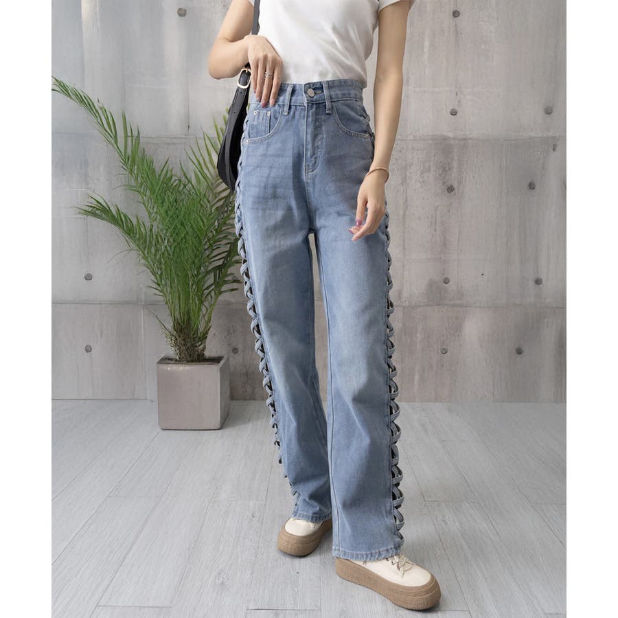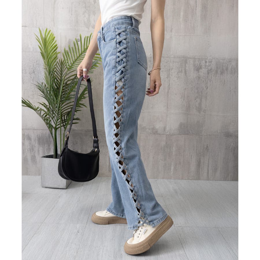 大胆なサイド編み上げデザインが目を引く、個性派デニムパンツ。