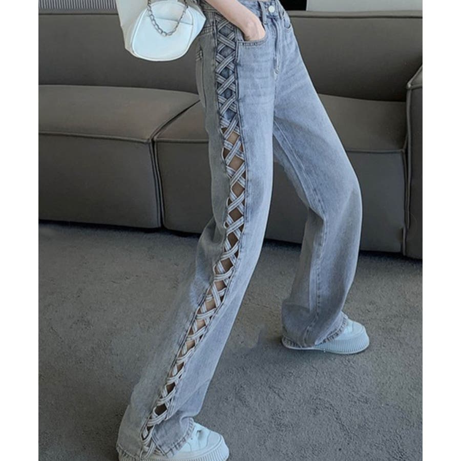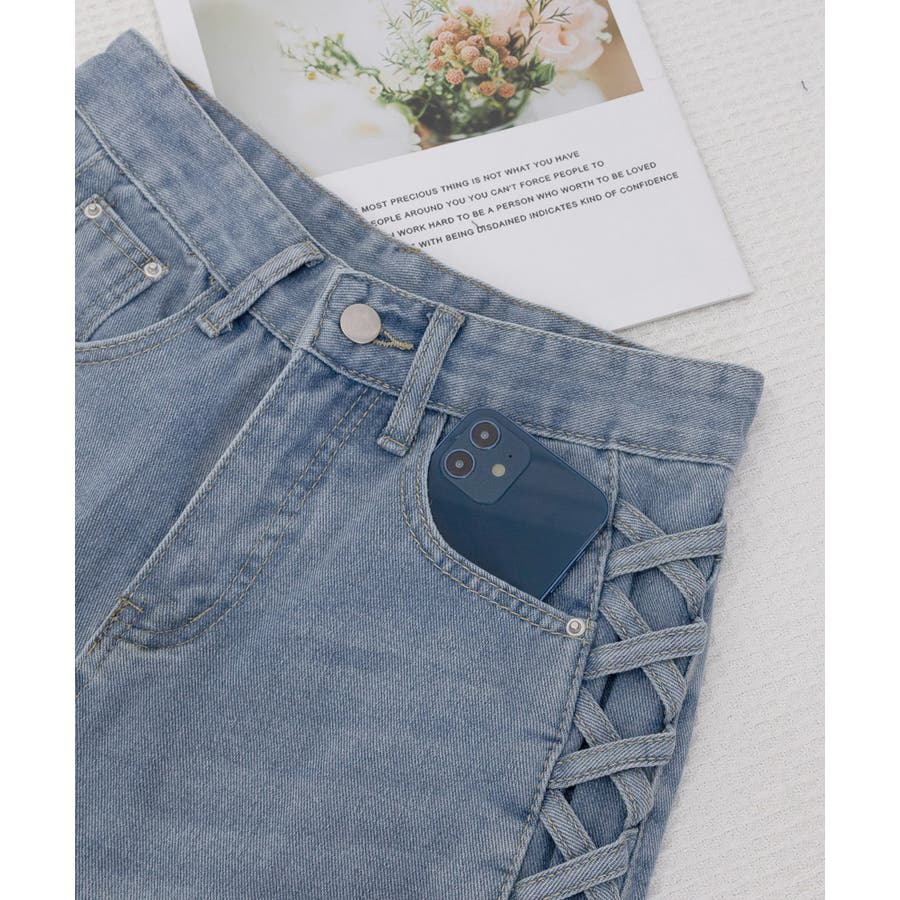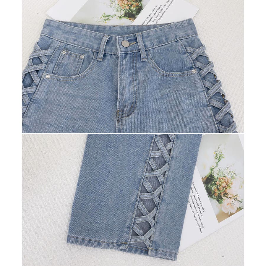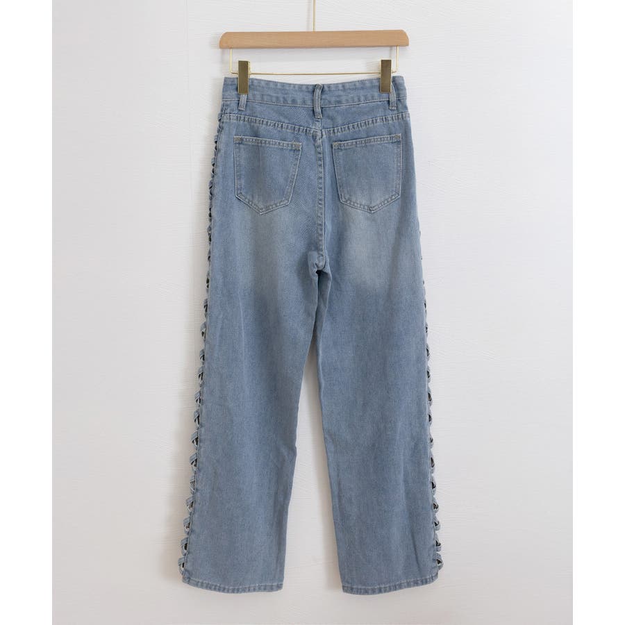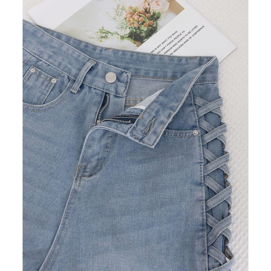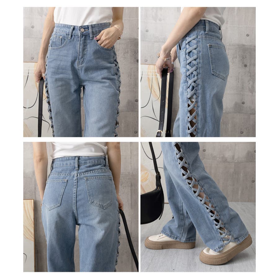 大胆なサイド編み上げデザインが目を引く、個性派デニムパンツ。