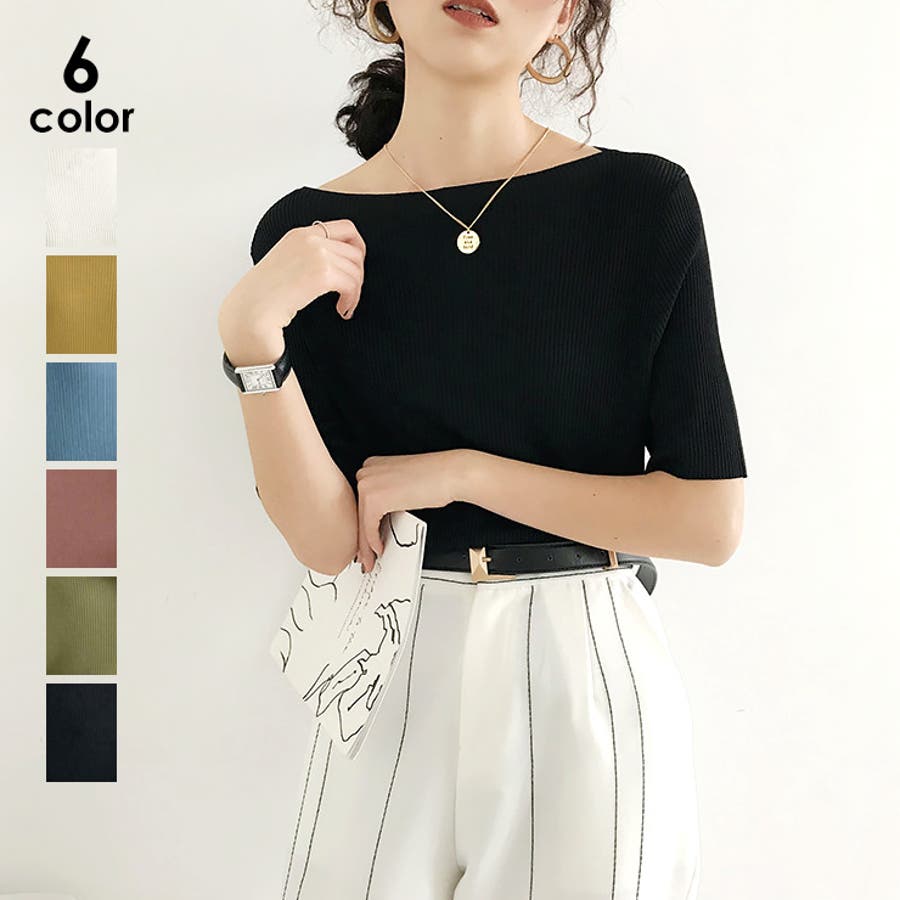 ボートネックデザインがデコルテを綺麗に見せてくれる