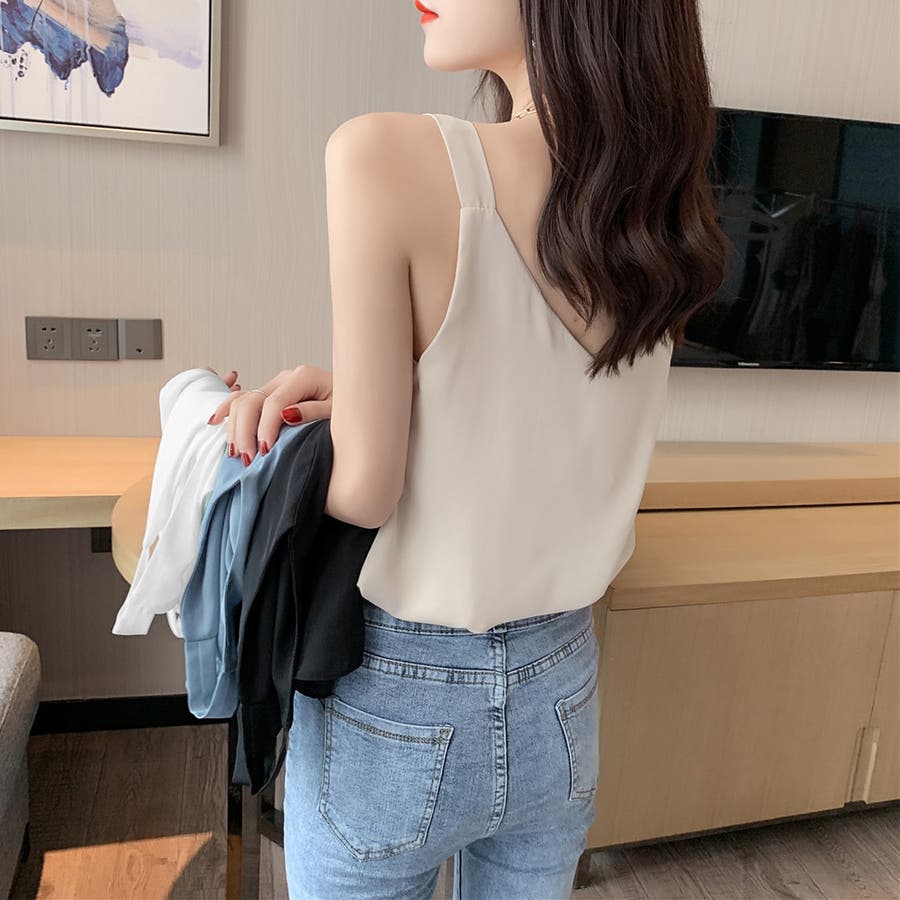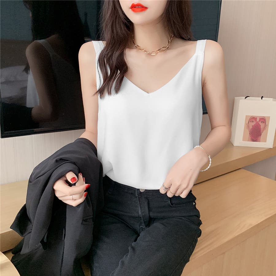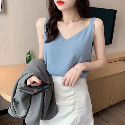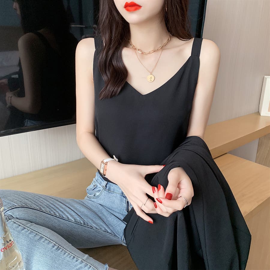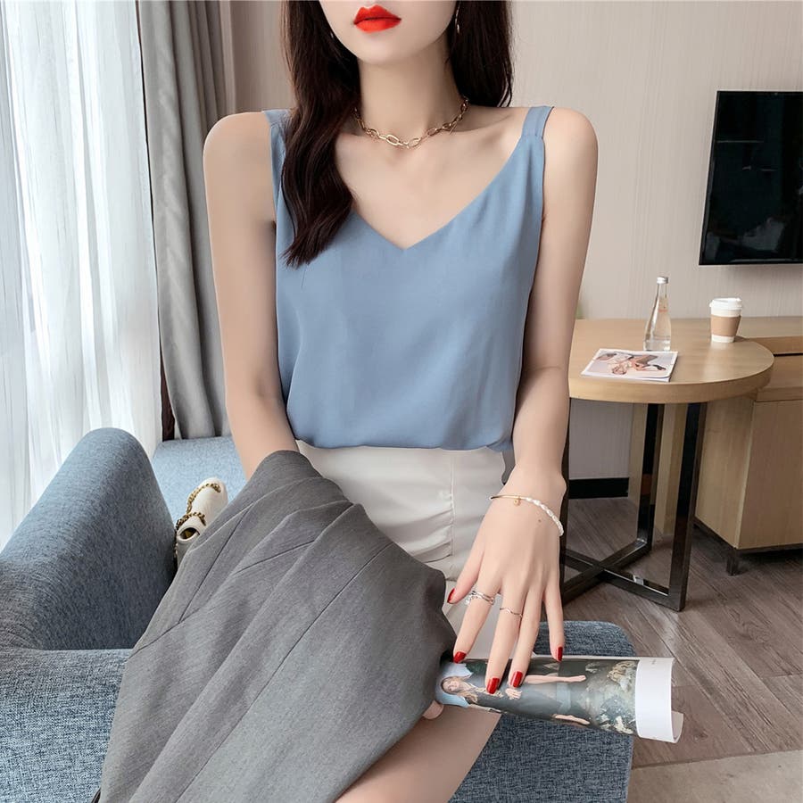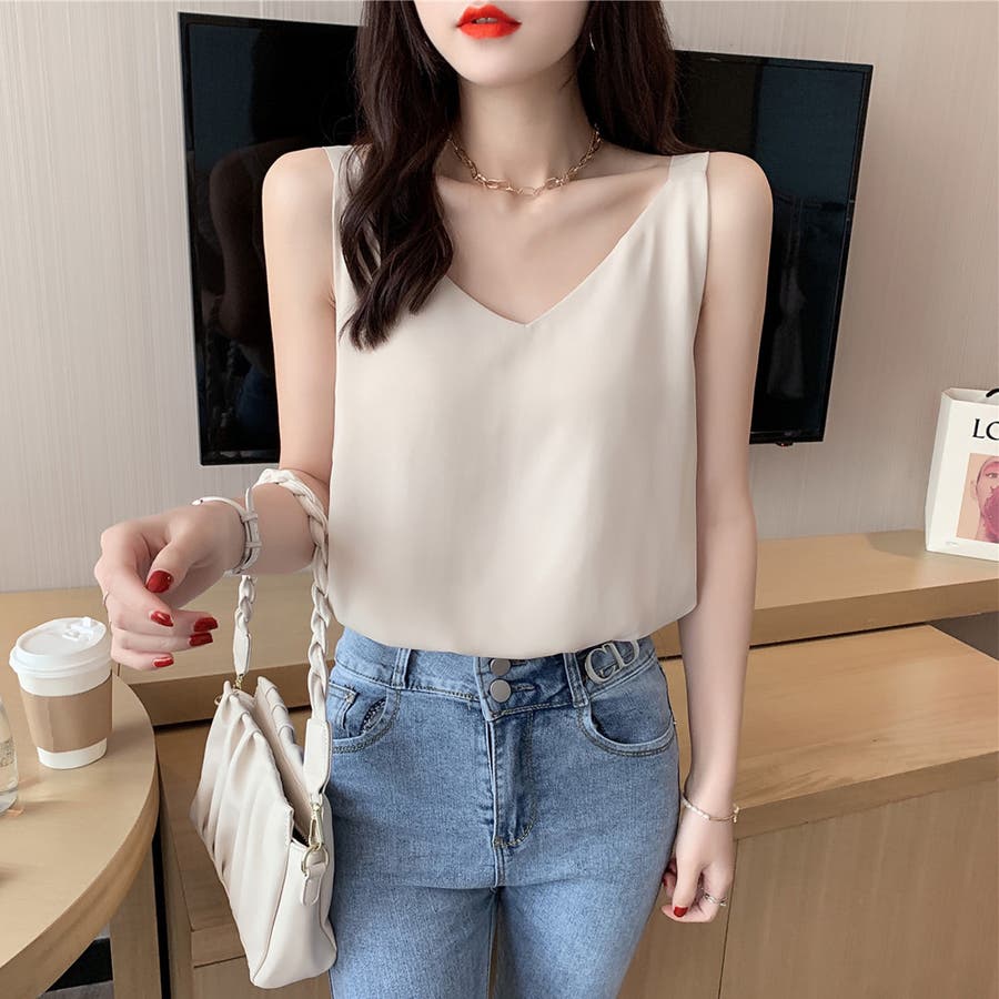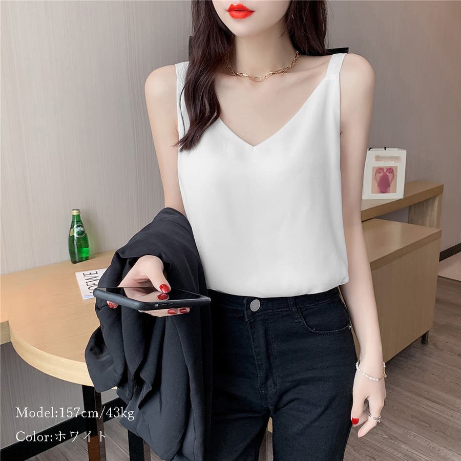 Vネックで女性らしいシルエット、涼しげで透け感のあるエレガントなシフォンキャミソール