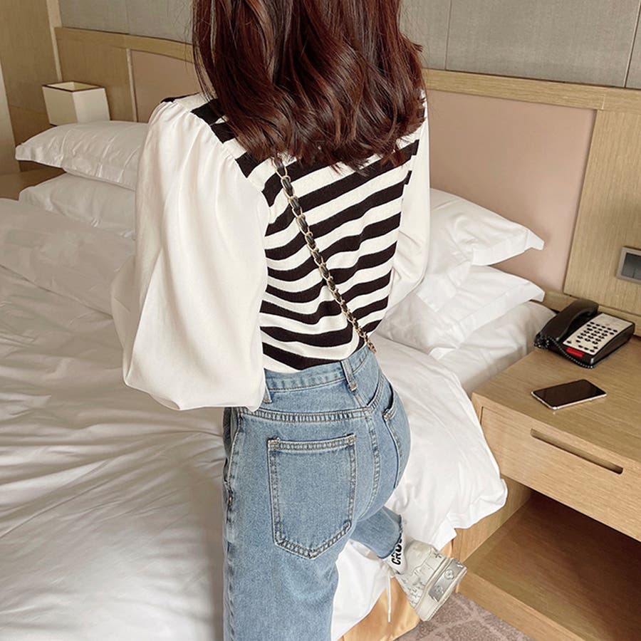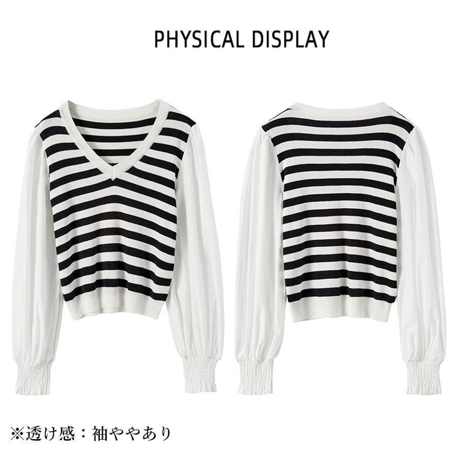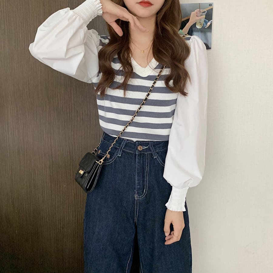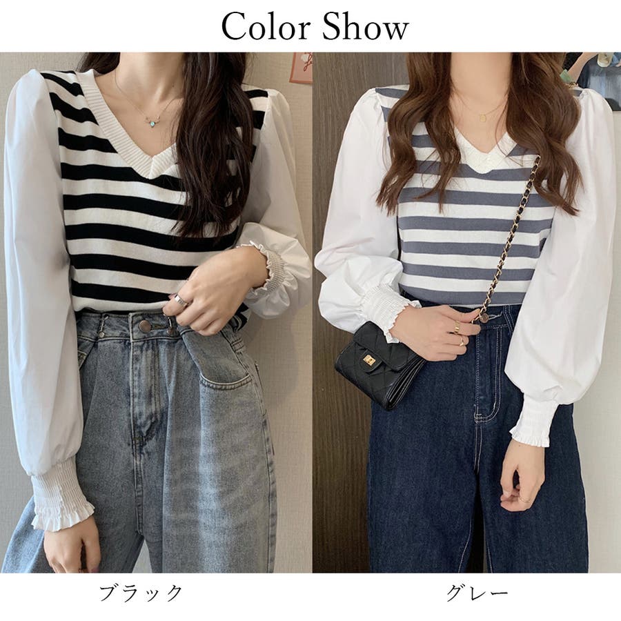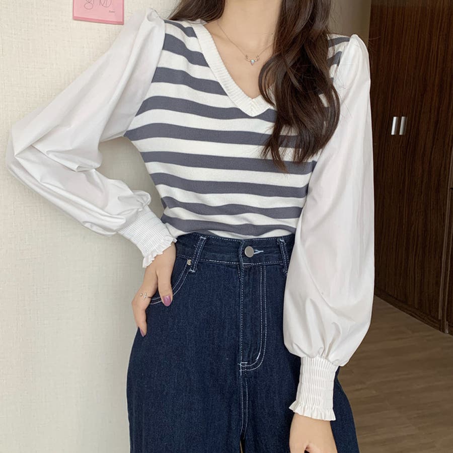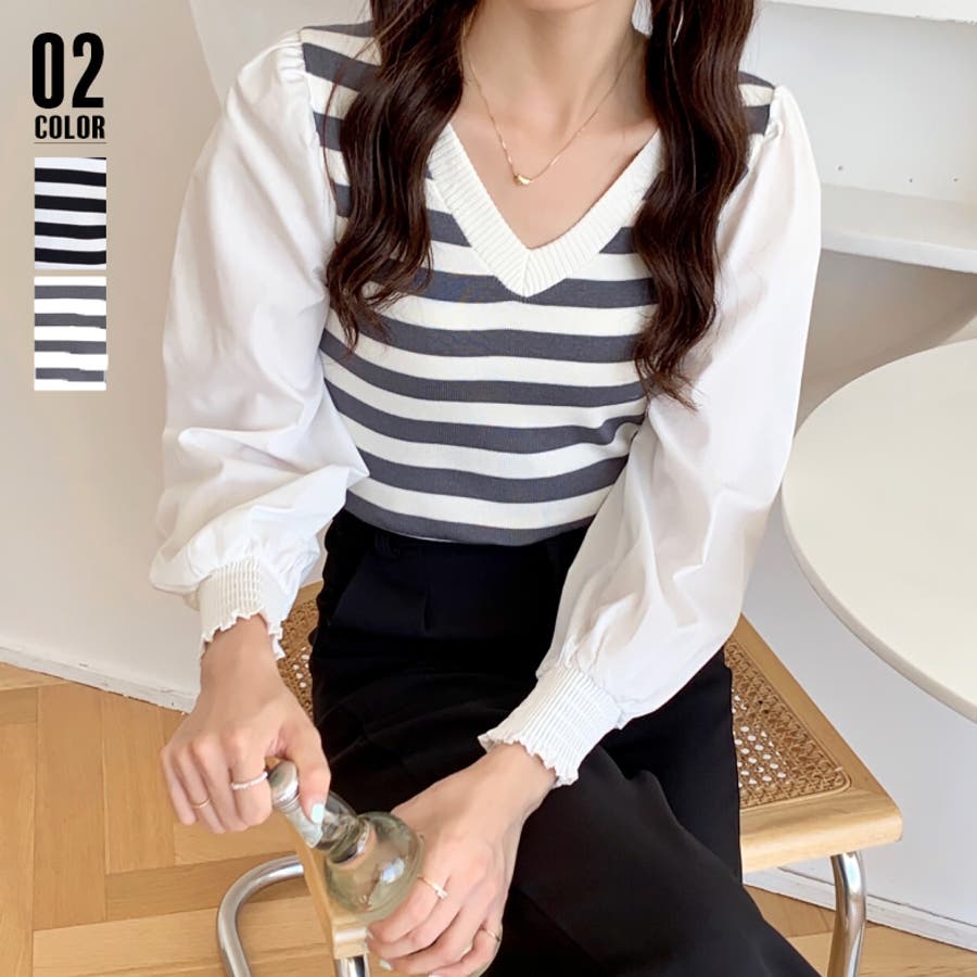 ボーダーとぽわんとしたパフスリーブが可愛いニットトップス