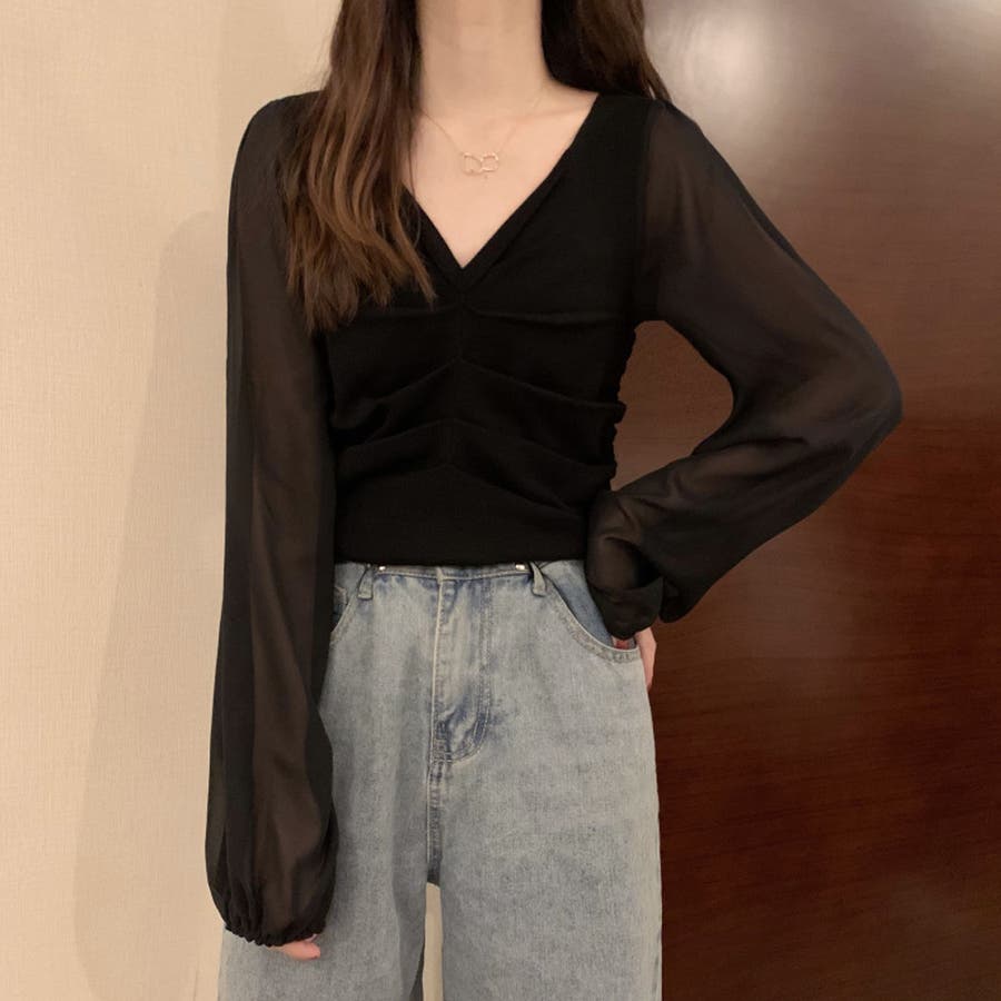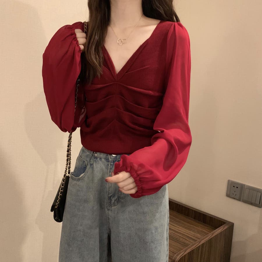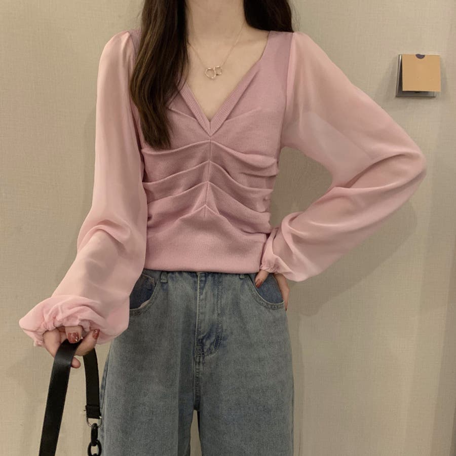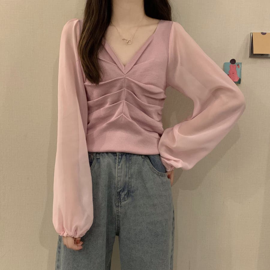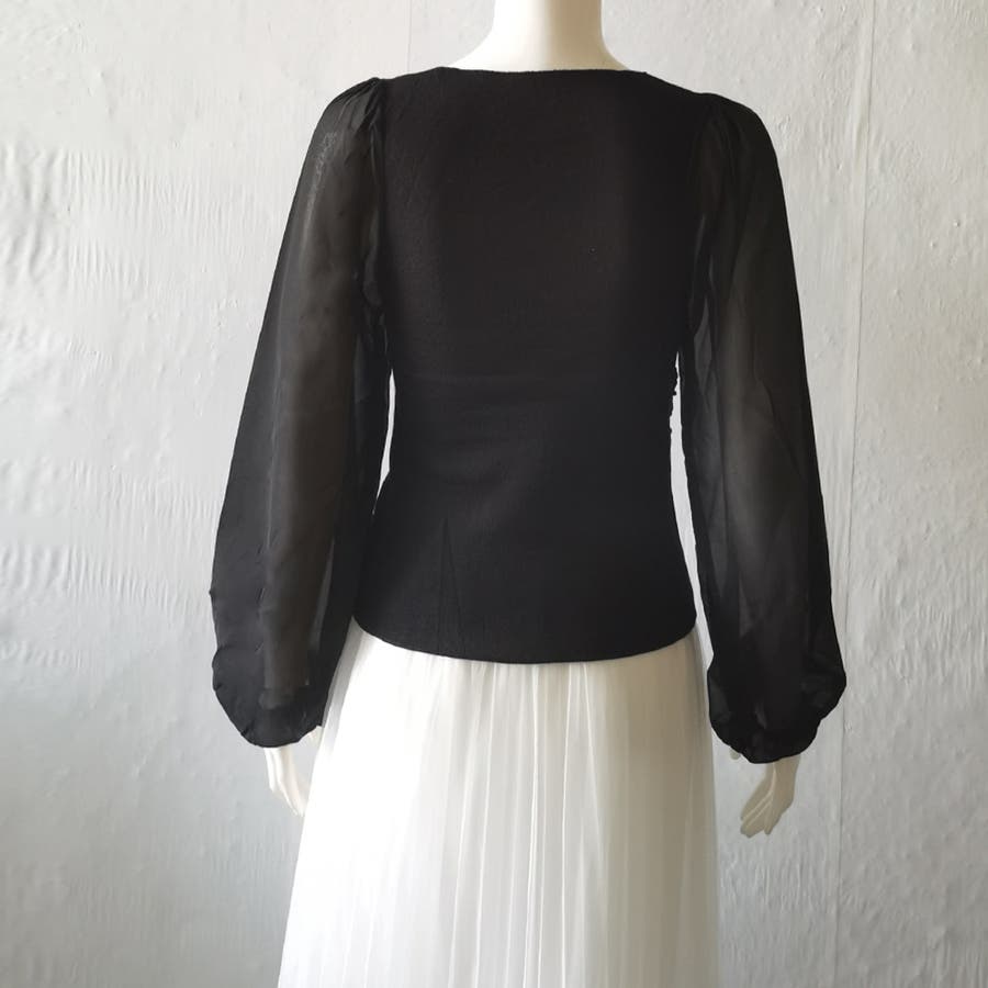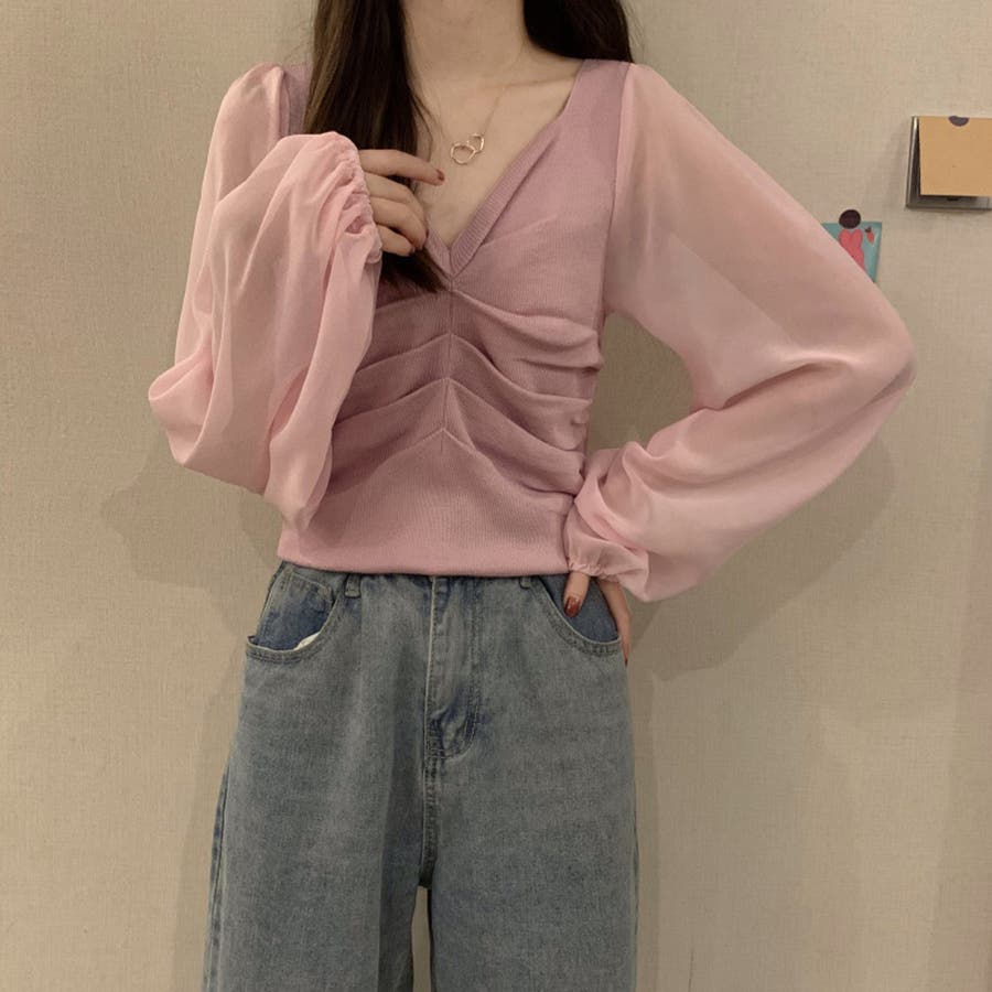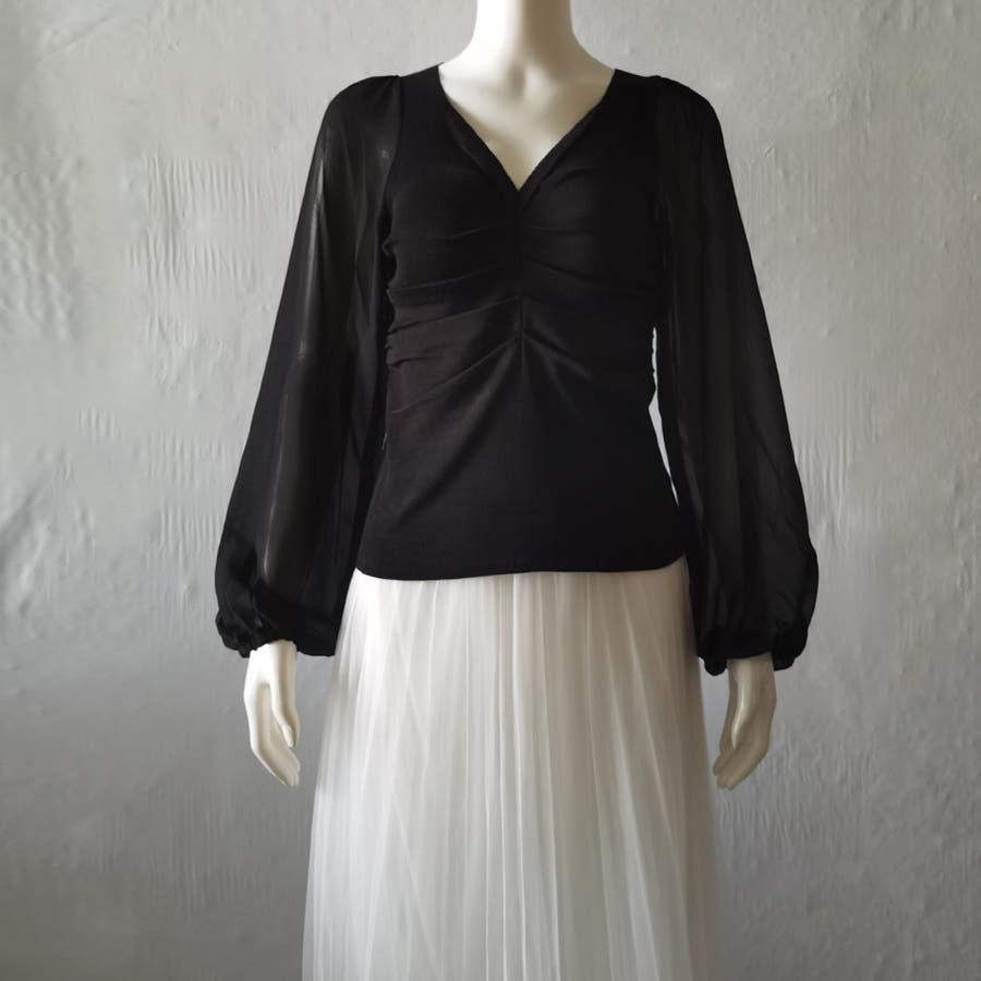 ふんわりとしたボリュームスリーブと肩のギャザーがフェミニンなアイテム