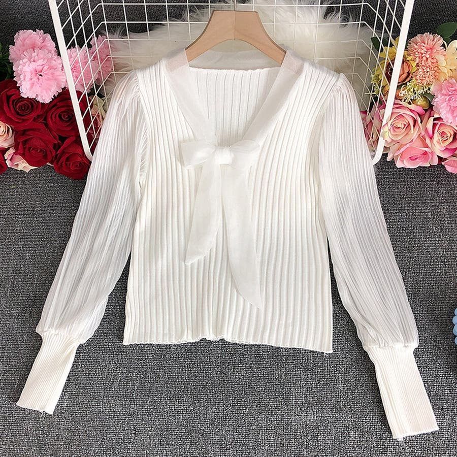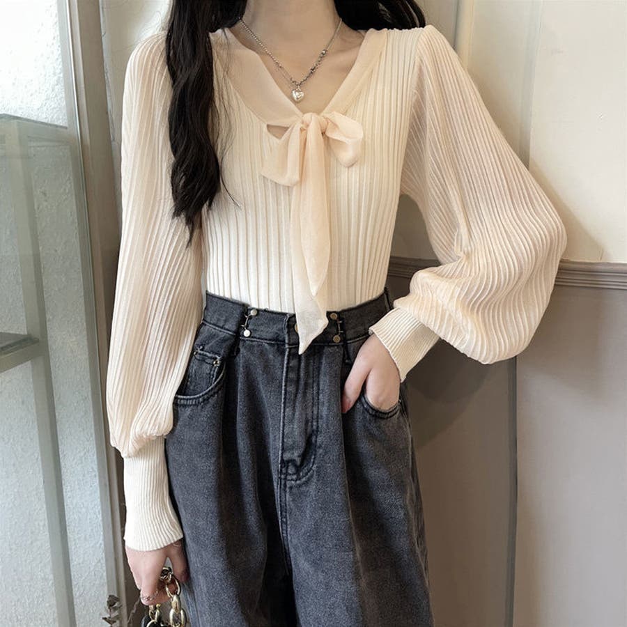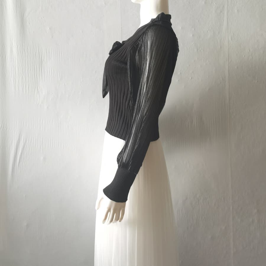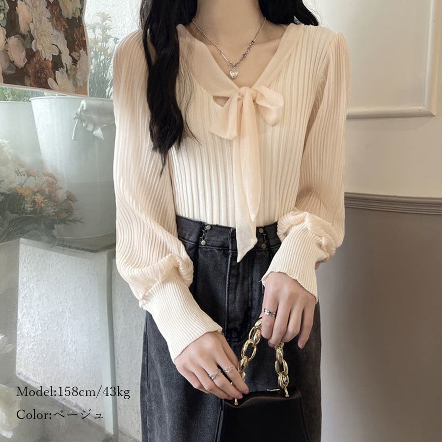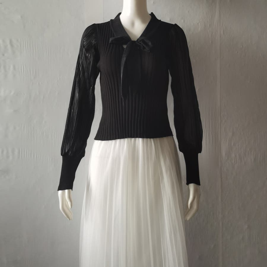 胸元の大きなリボンで一枚でもまたインナーとして着用していただいても上品に演出してくれるプリーツリブニット