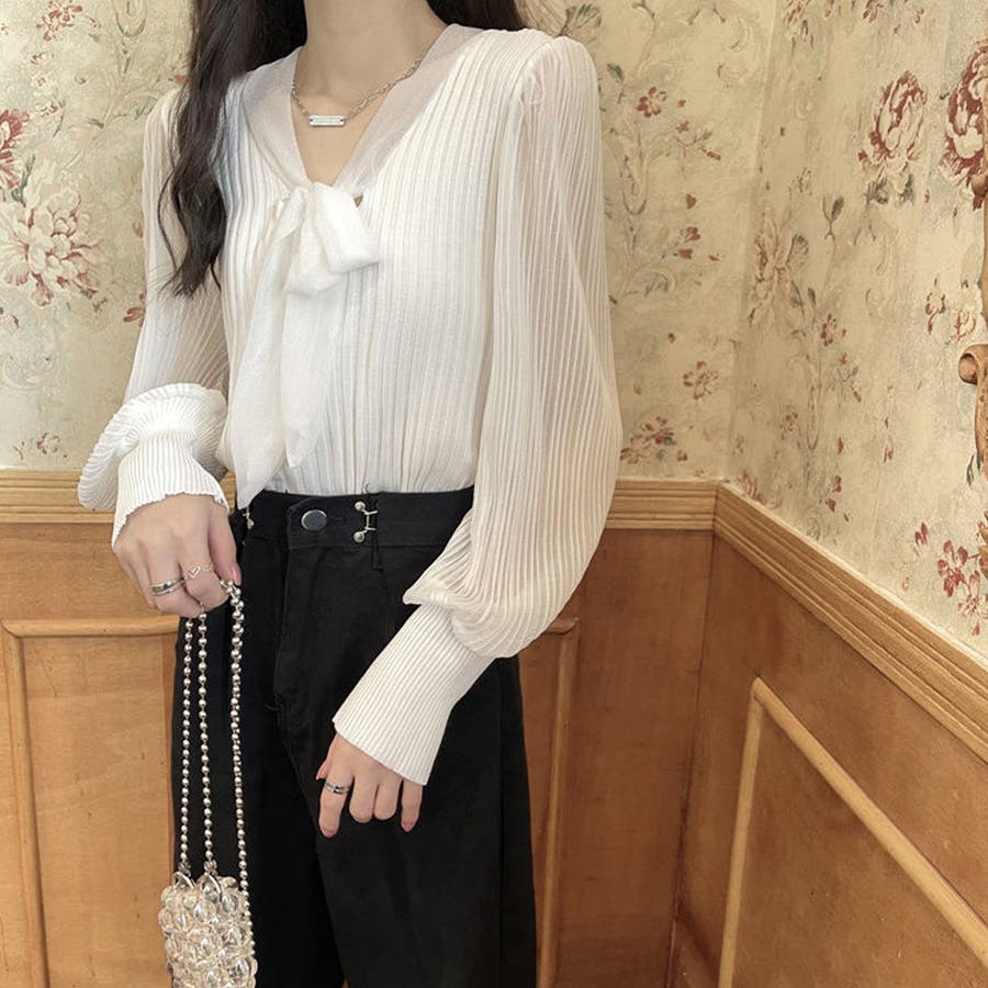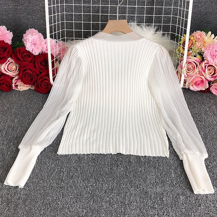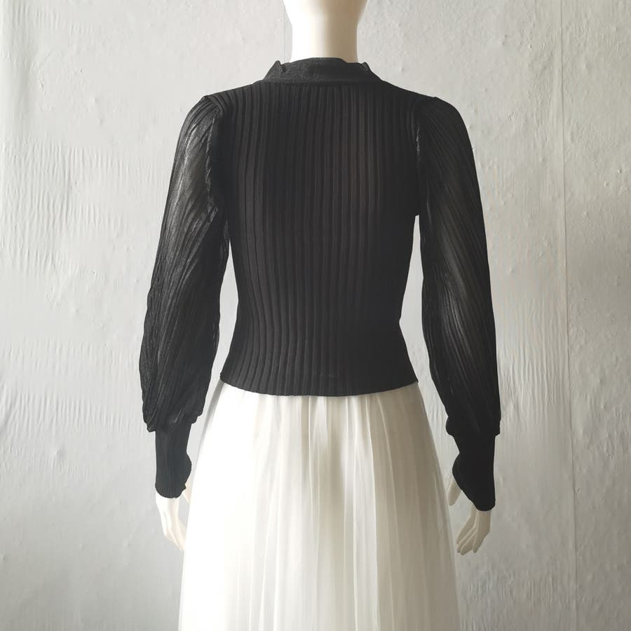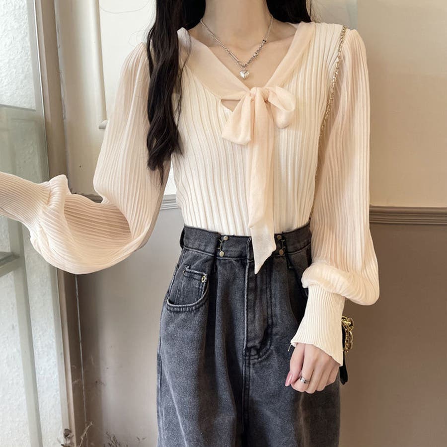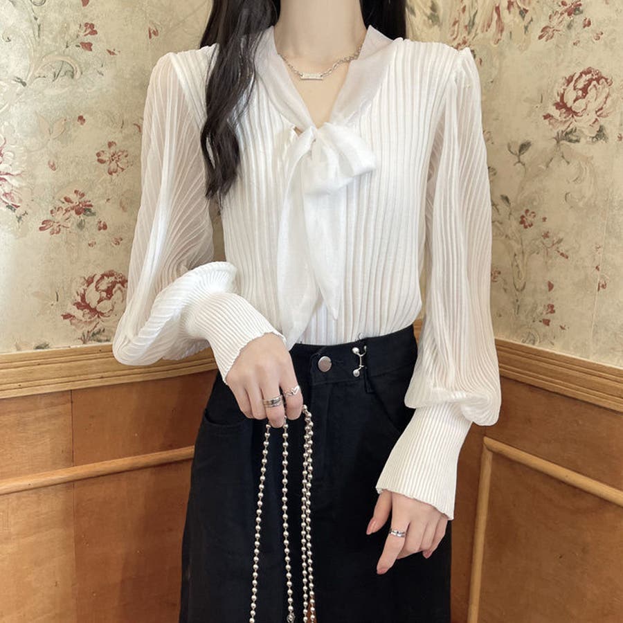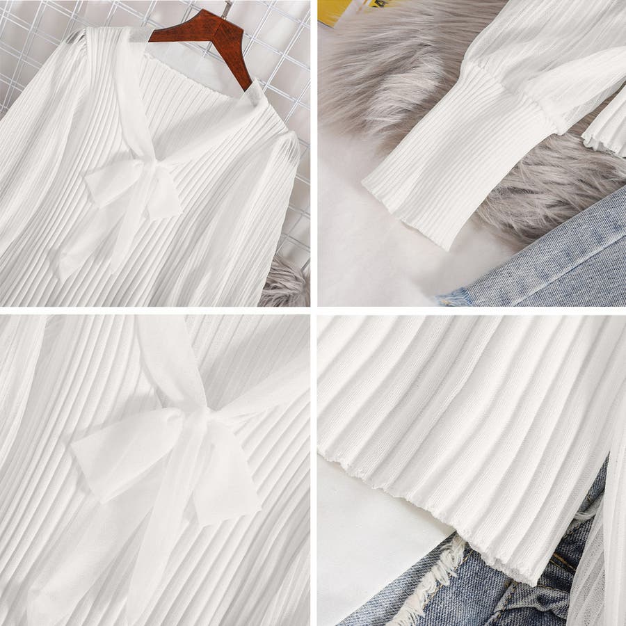 胸元の大きなリボンで一枚でもまたインナーとして着用していただいても上品に演出してくれるプリーツリブニット