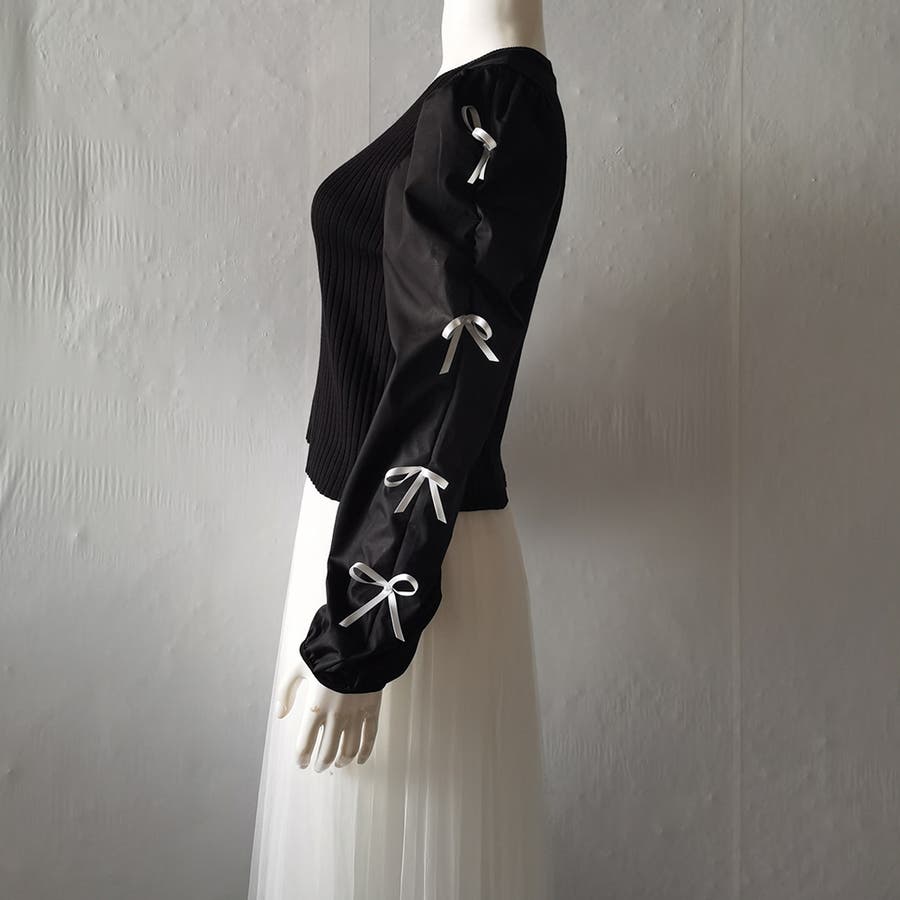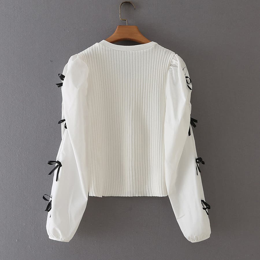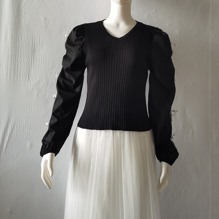 異素材で切り替えたボリュームスリーブが女性らしいニュアンスをプラス