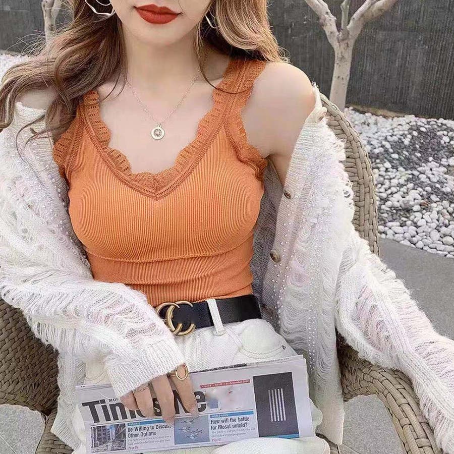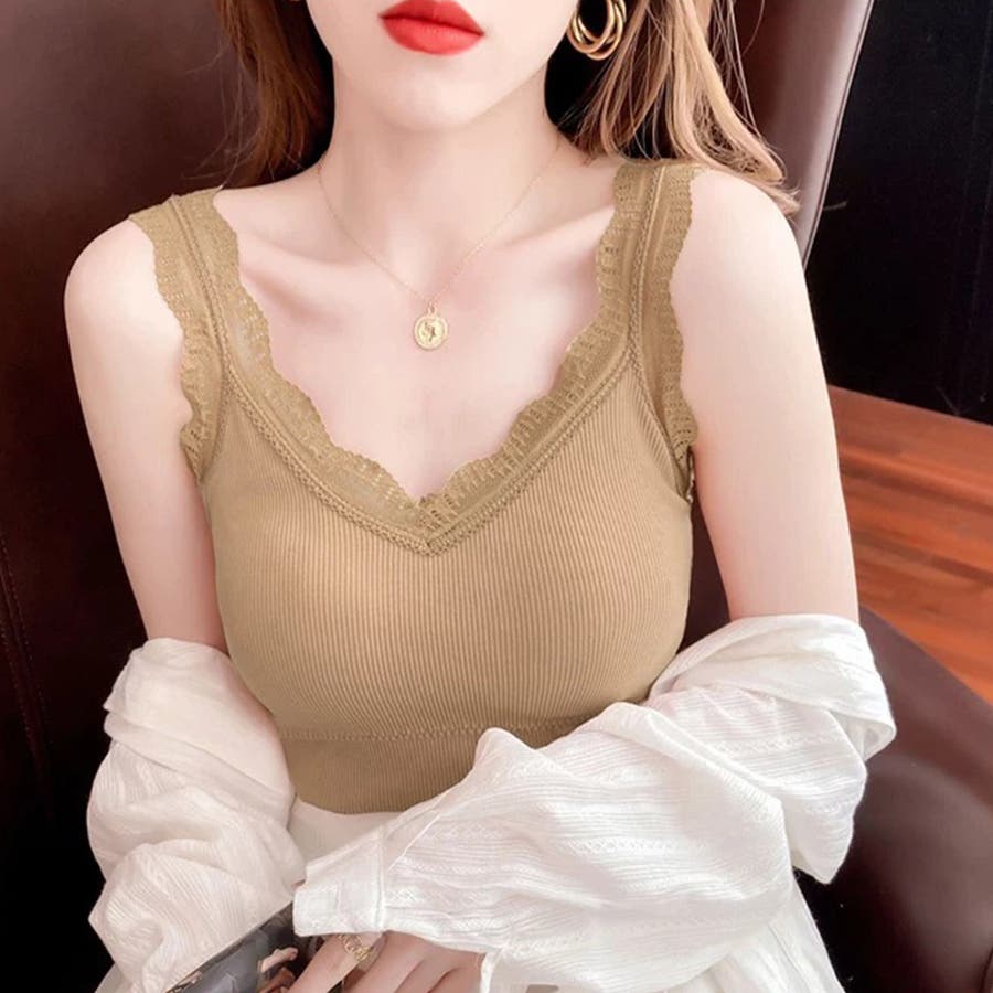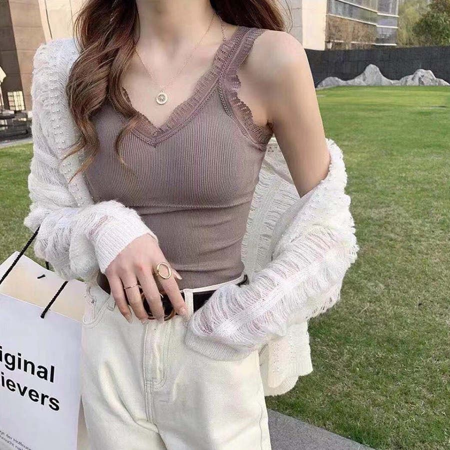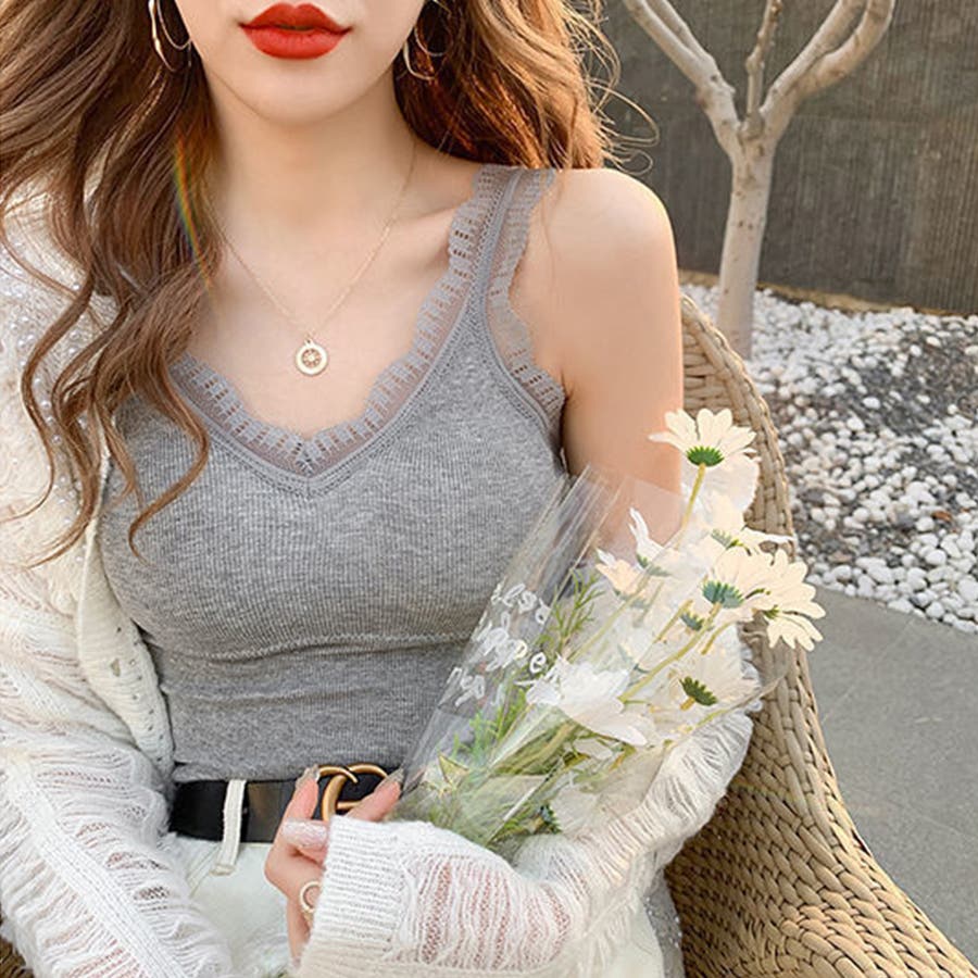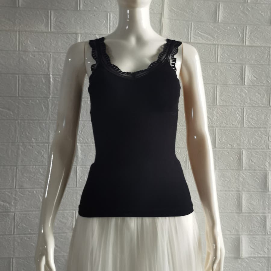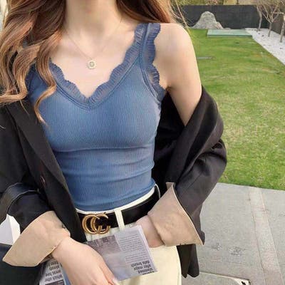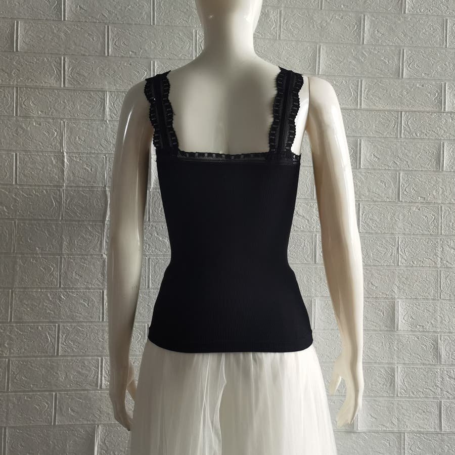 肩と胸元のレースが可愛らしいデザインなのでインナーとして取り入れるだけでフェミニンな印象に