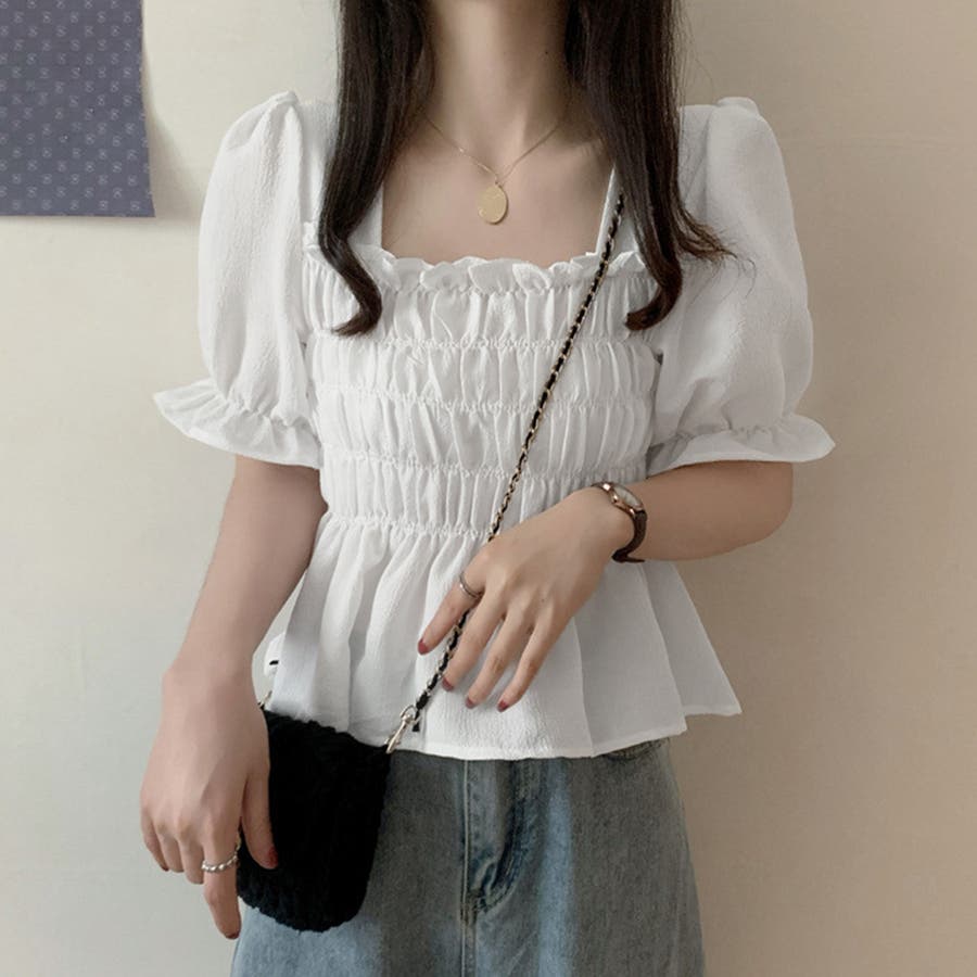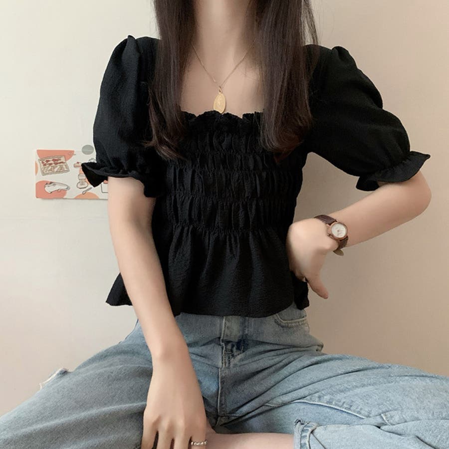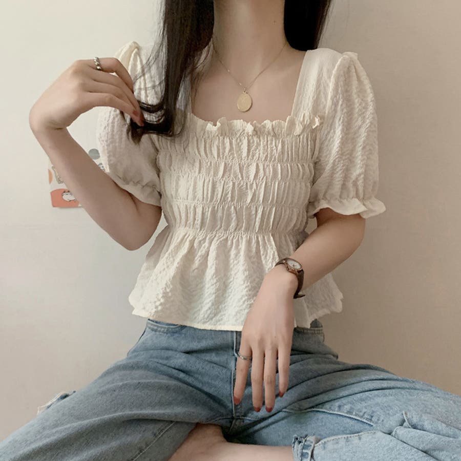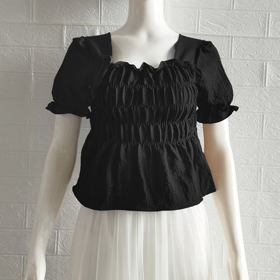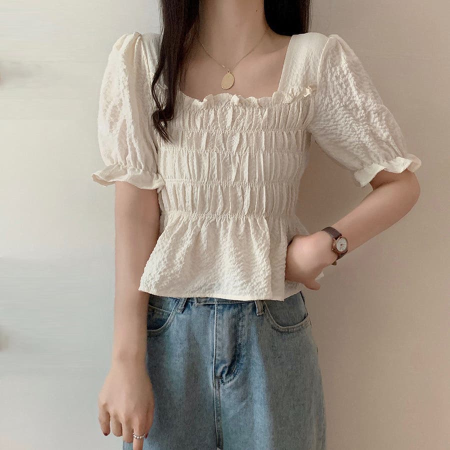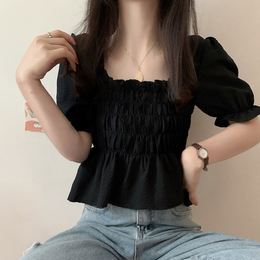 スクエアネック ブラウス シャーリング