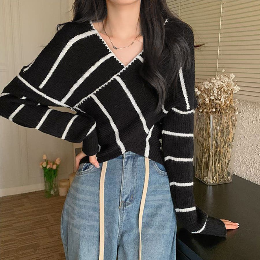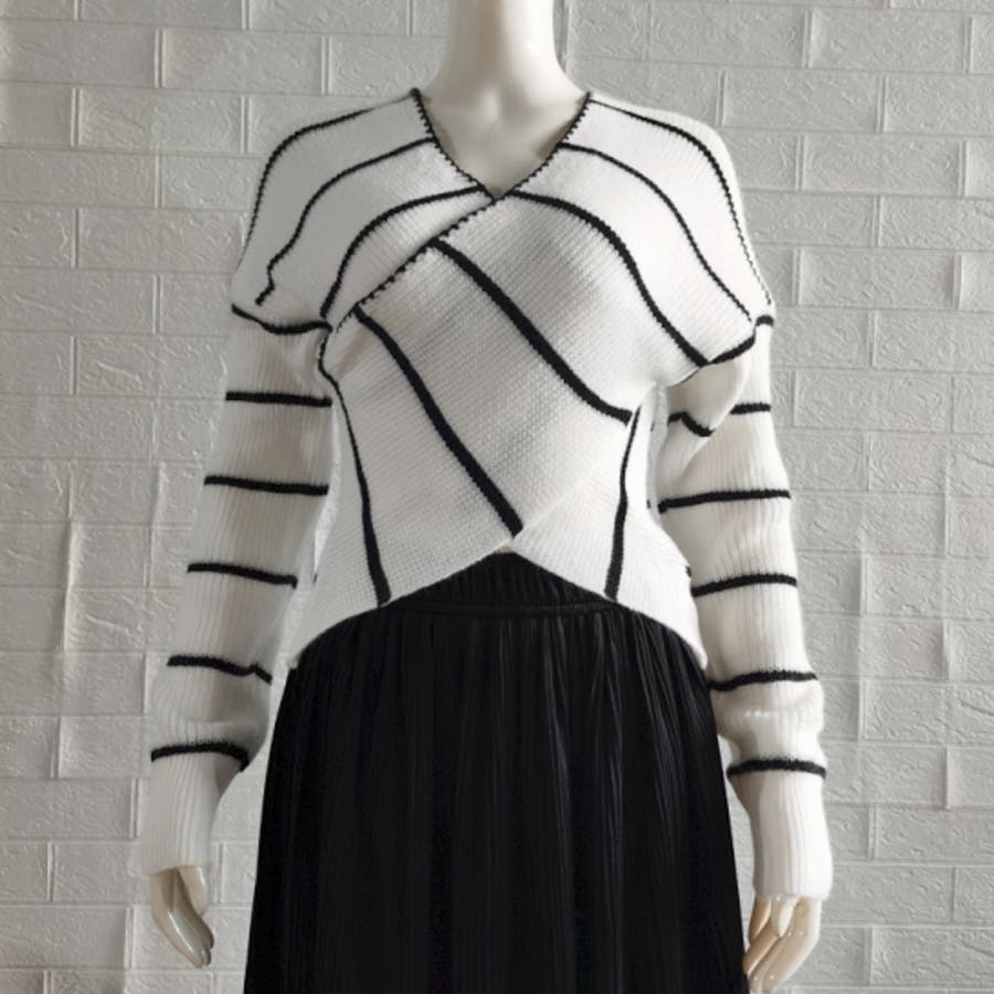 フロントのクロスデザインがウエストをすっきりと見せてくれ、Vネックの開きで顔周りはシャープな印象を与えてくれるニットトップス