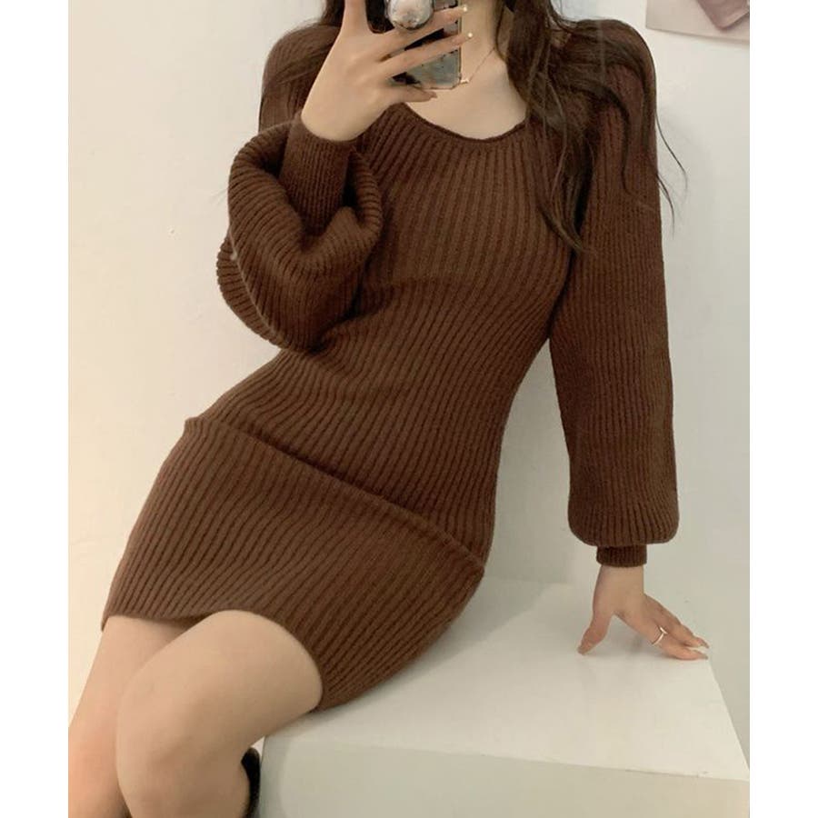 インナーワンピ長袖 無地膝上ワンピース 着回しニットワンピ