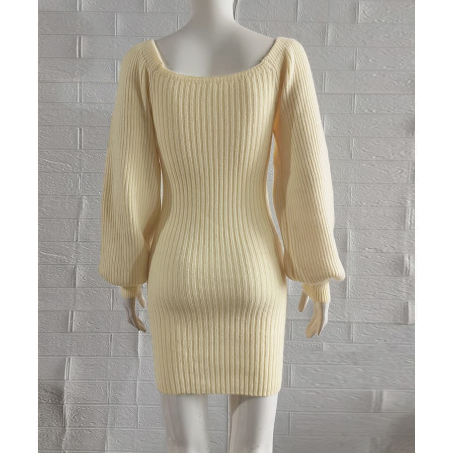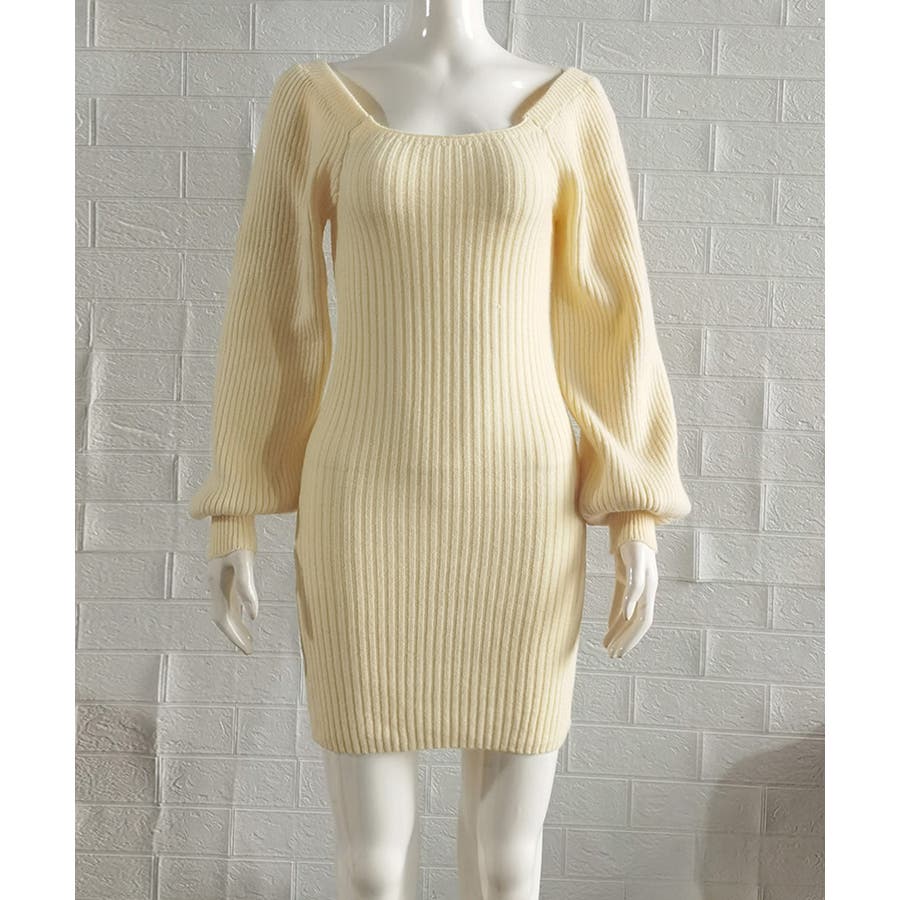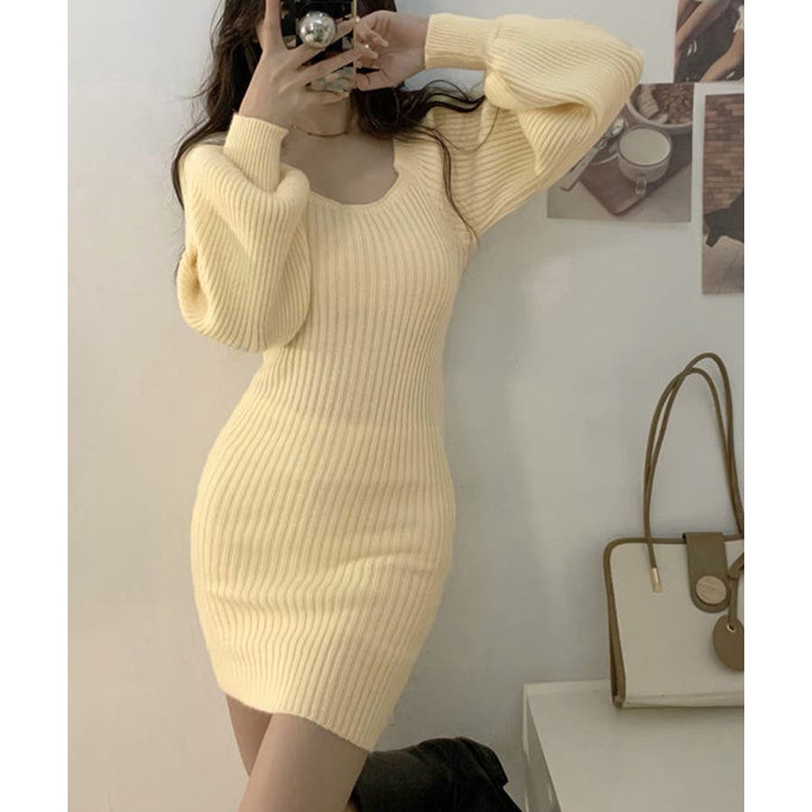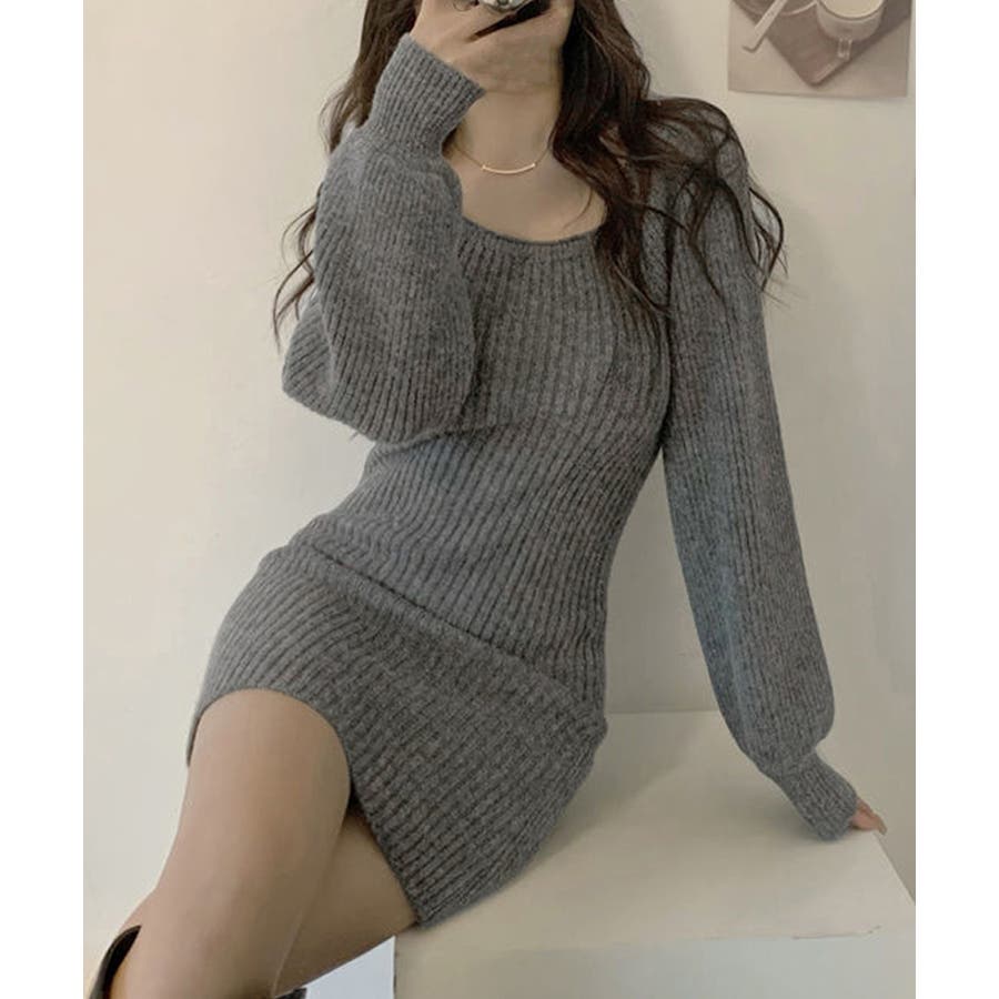 スクエアネックなのでデコルテ部分をスッキリと見せてくれるショート丈ニットワンピース。