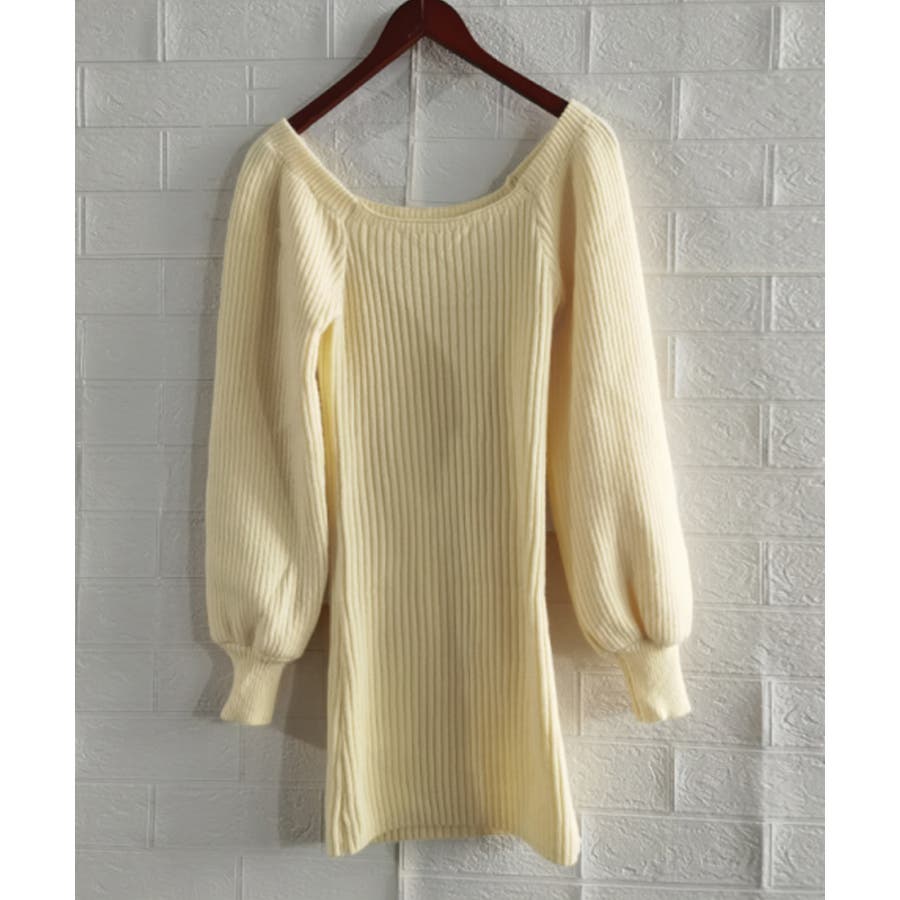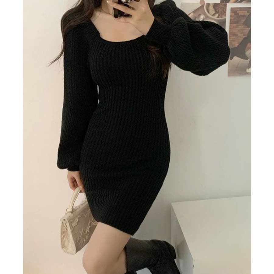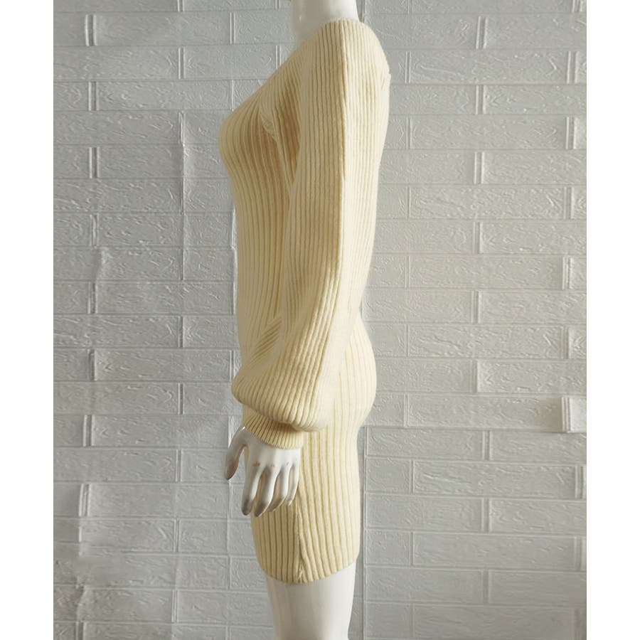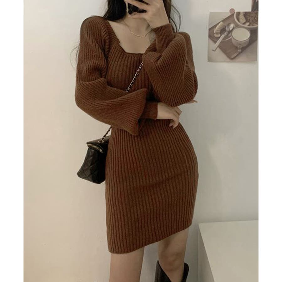 スクエアネックなのでデコルテ部分をスッキリと見せてくれるショート丈ニットワンピース。