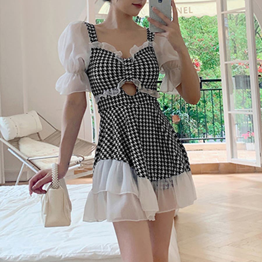 ワンピース水着 千鳥柄 韓国スイムウェア