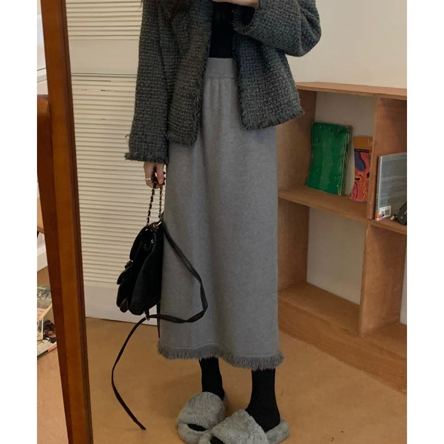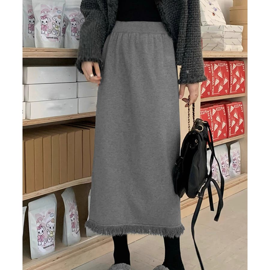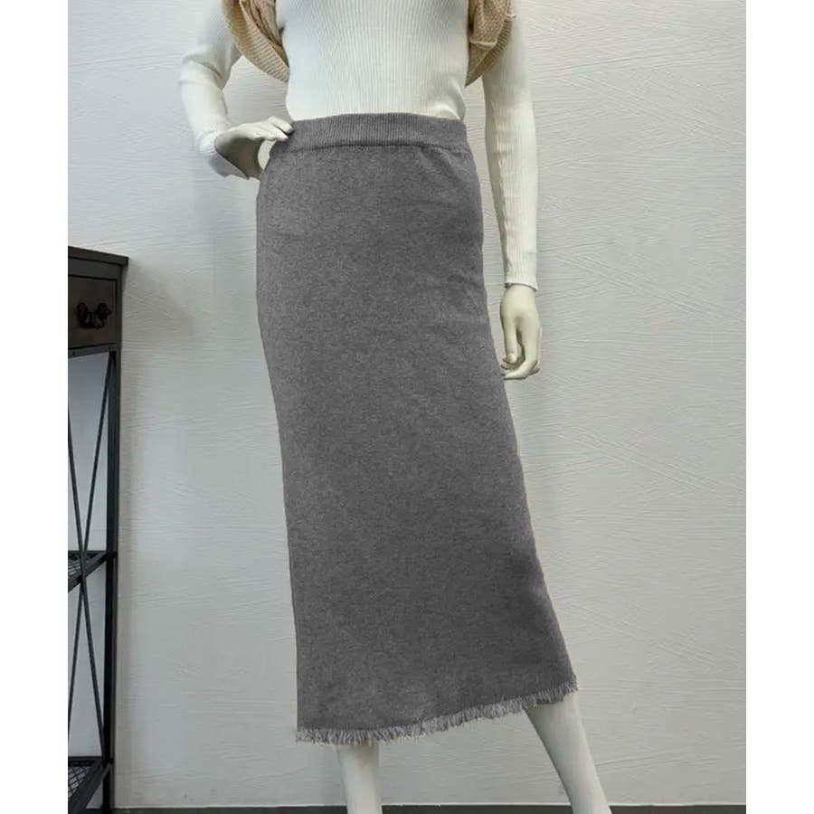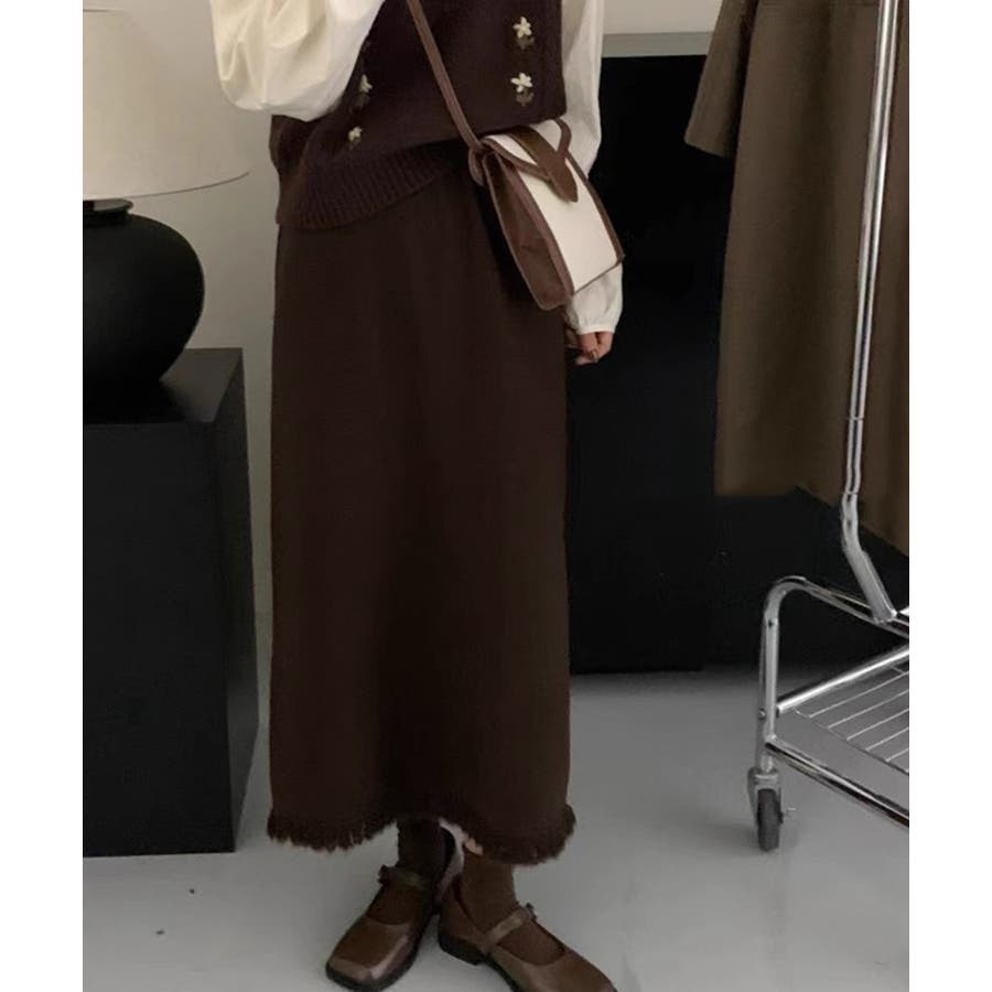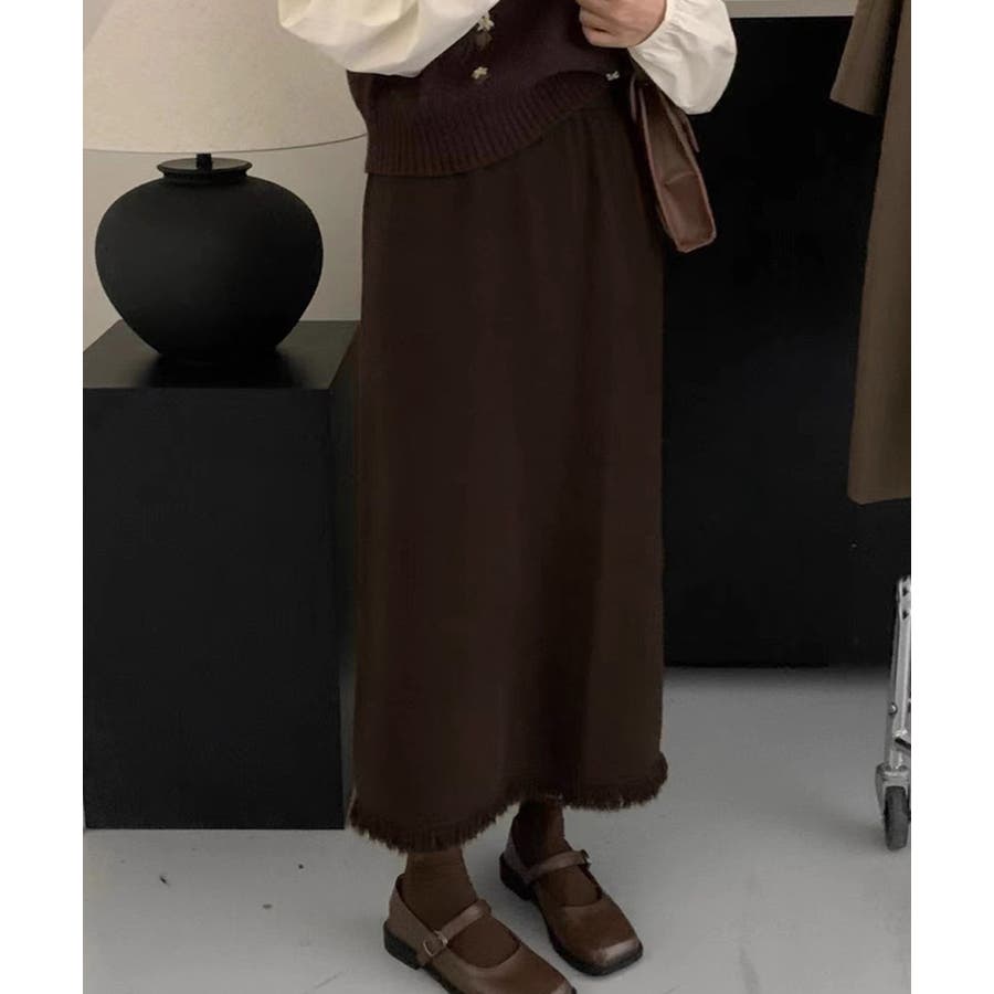 ロングスカート 裾フリンジニットスカート