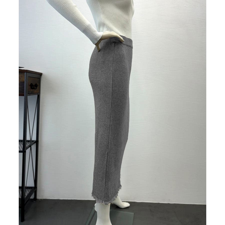 体のラインを拾いすぎないセミタイトが女性らしい着こなしを演出する裾フリンジニットスカート