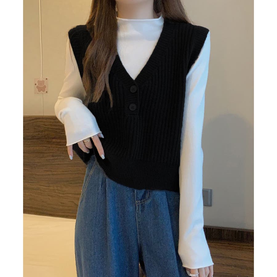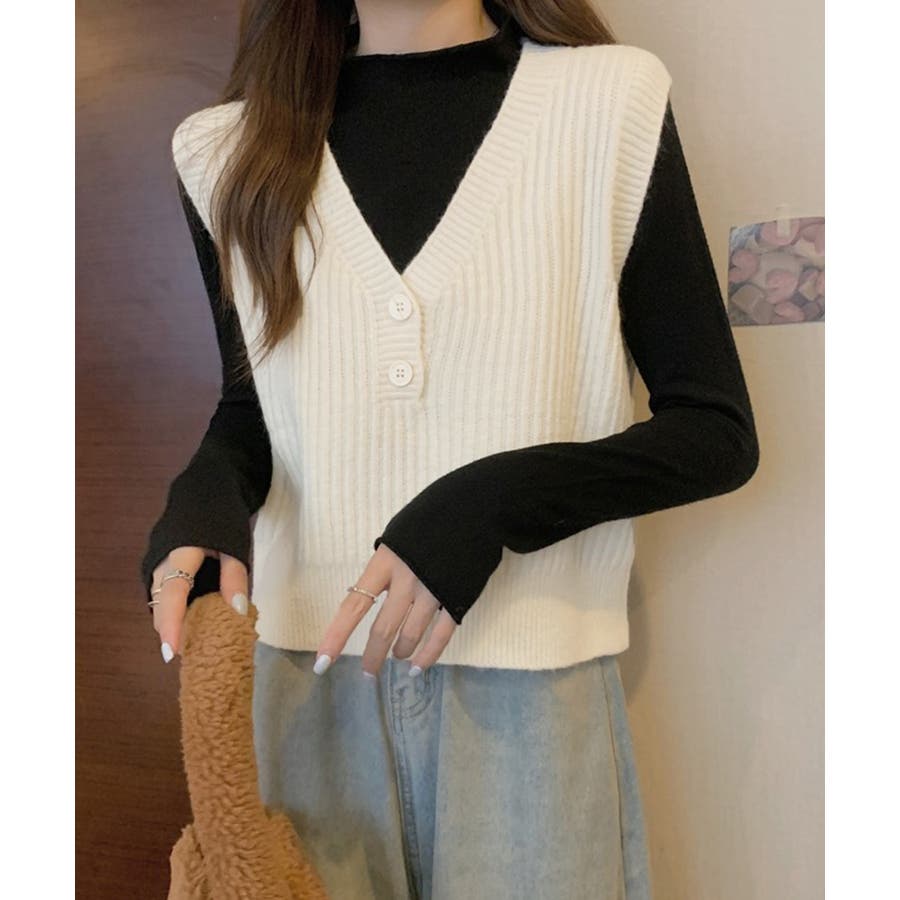 レディース ニットトップス 重ね着 レイヤードベスト カジュアル お洒落 ノースリーブ 着やせ プルオーバー20代30代