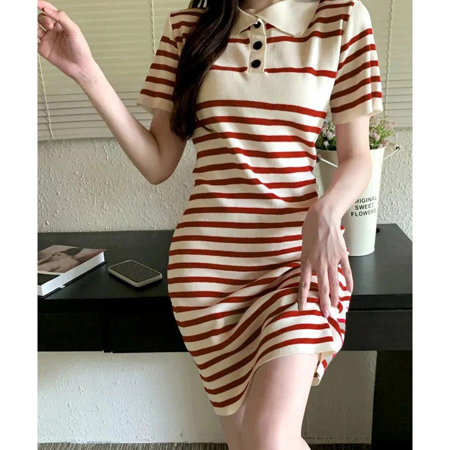 細身膝上ワンピース 半袖ミニワンピース 着回しニットワンピ