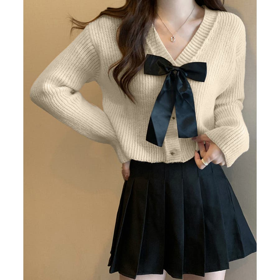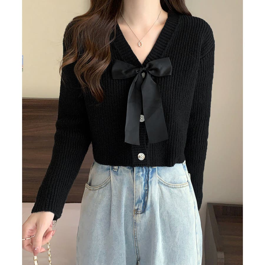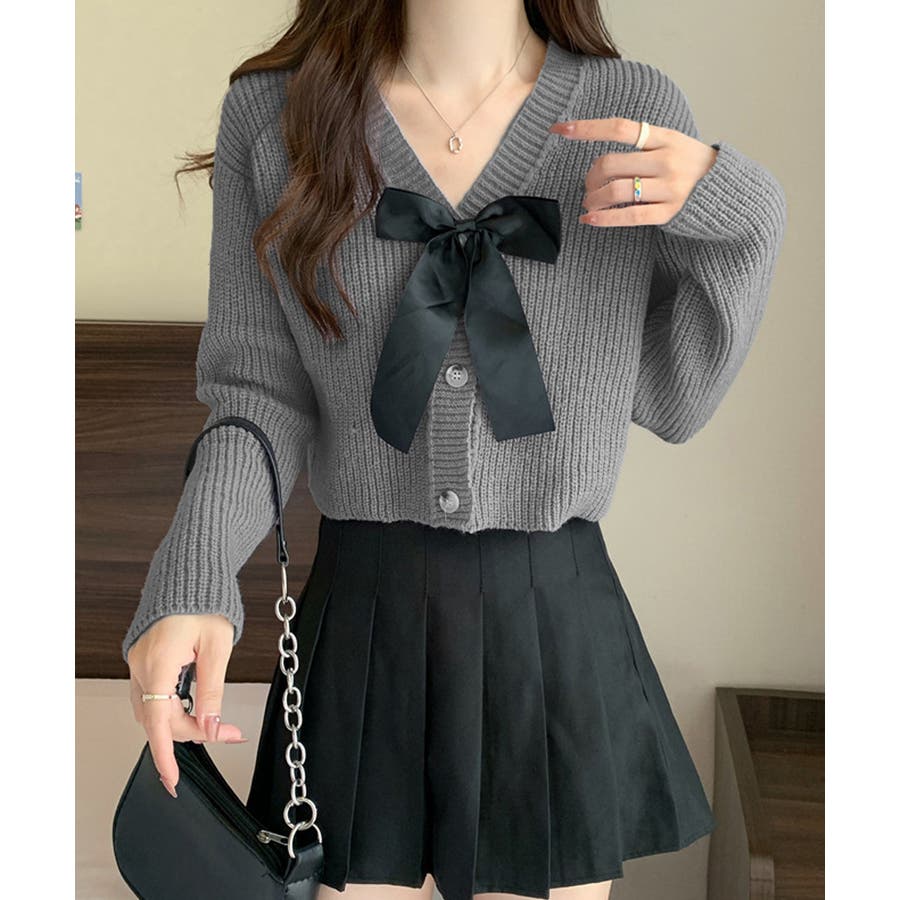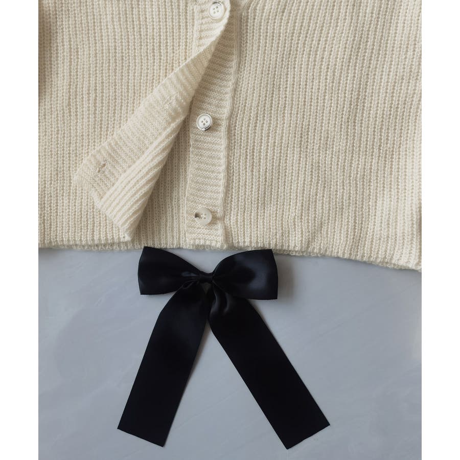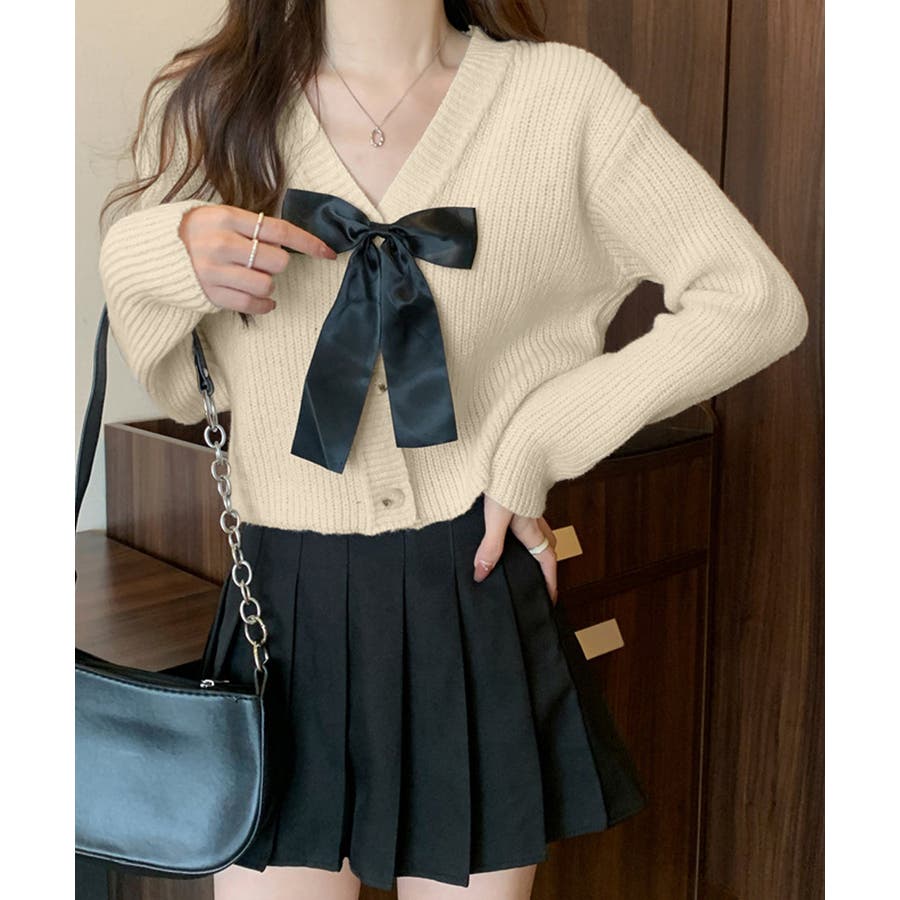 Vネックデザインとフロントのサテンリボンが、女性らしい上品な印象を演出します