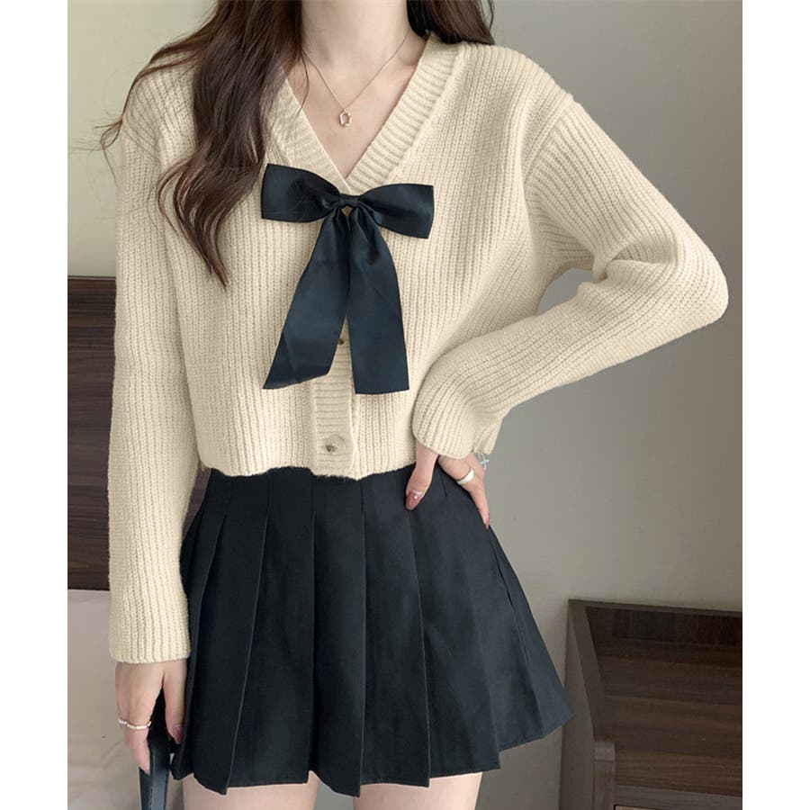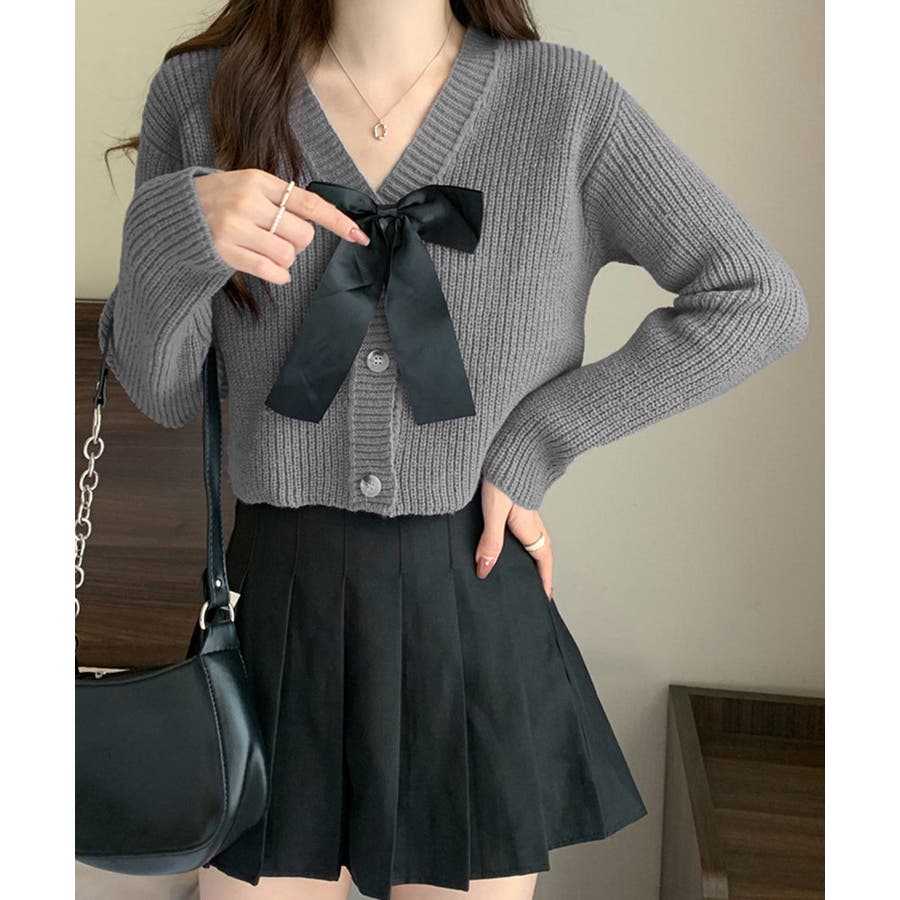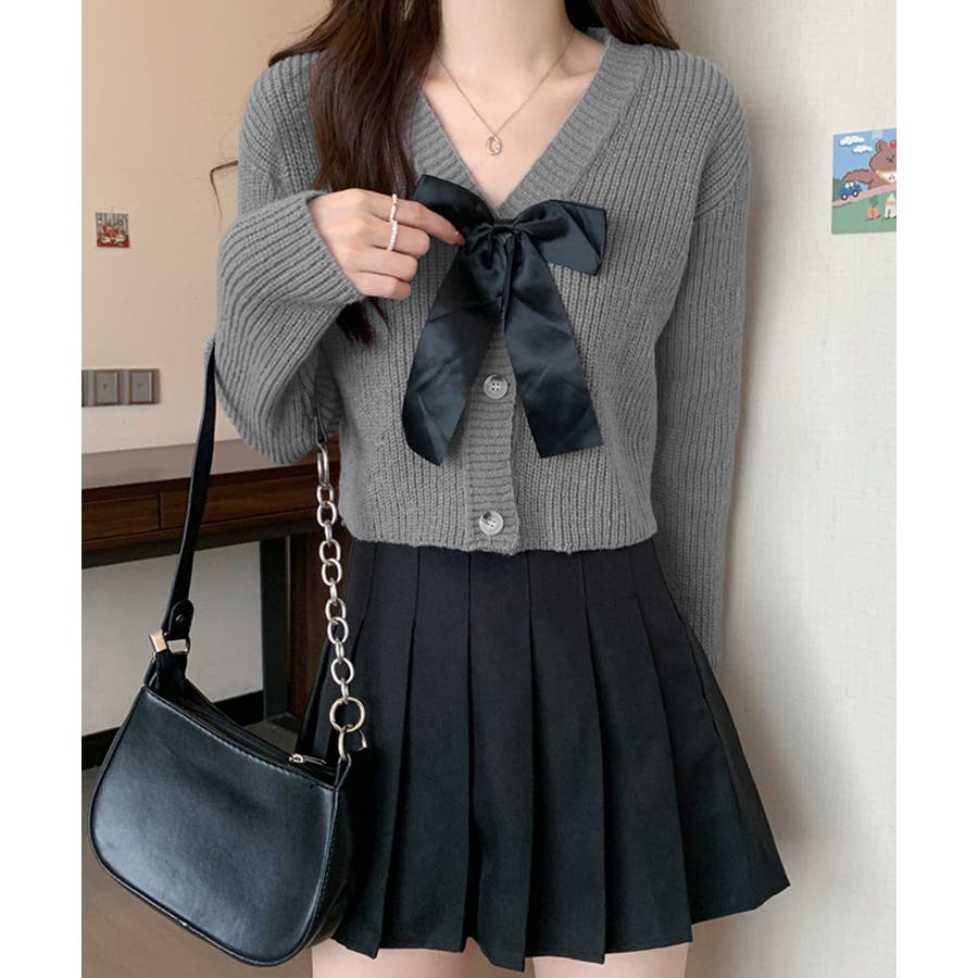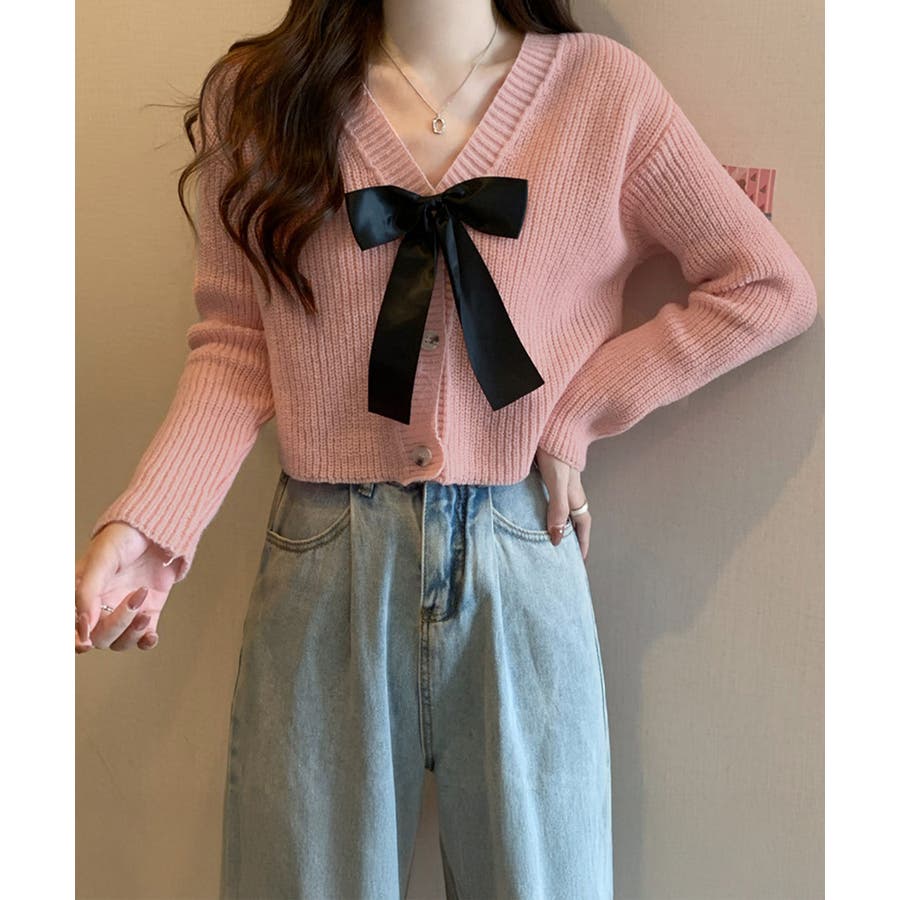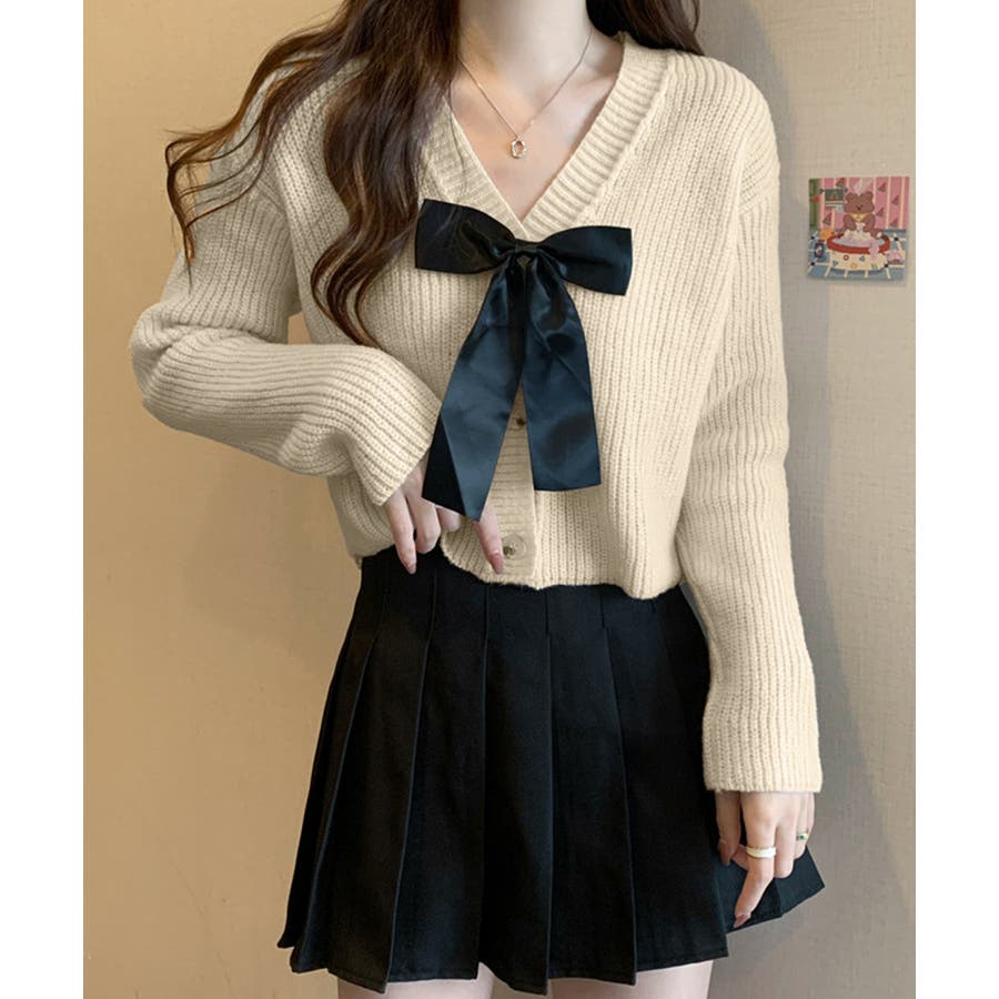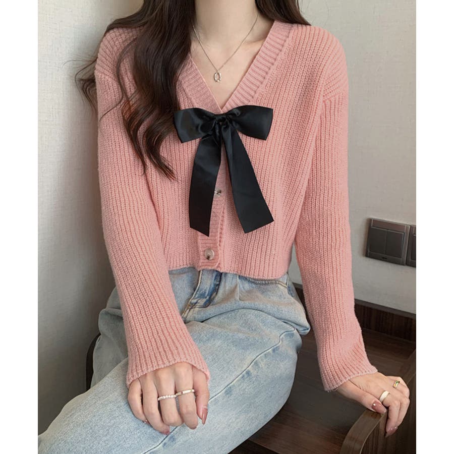 Vネックデザインとフロントのサテンリボンが、女性らしい上品な印象を演出します