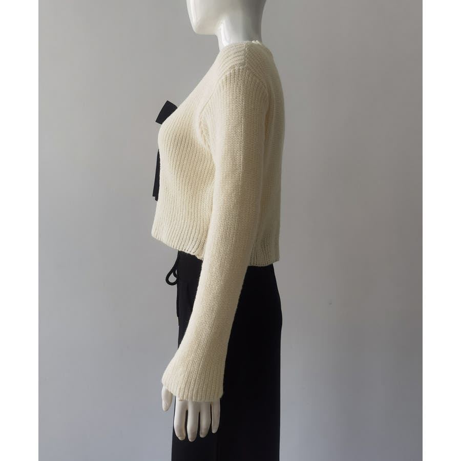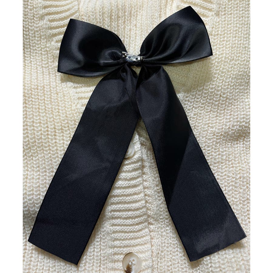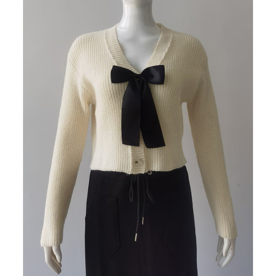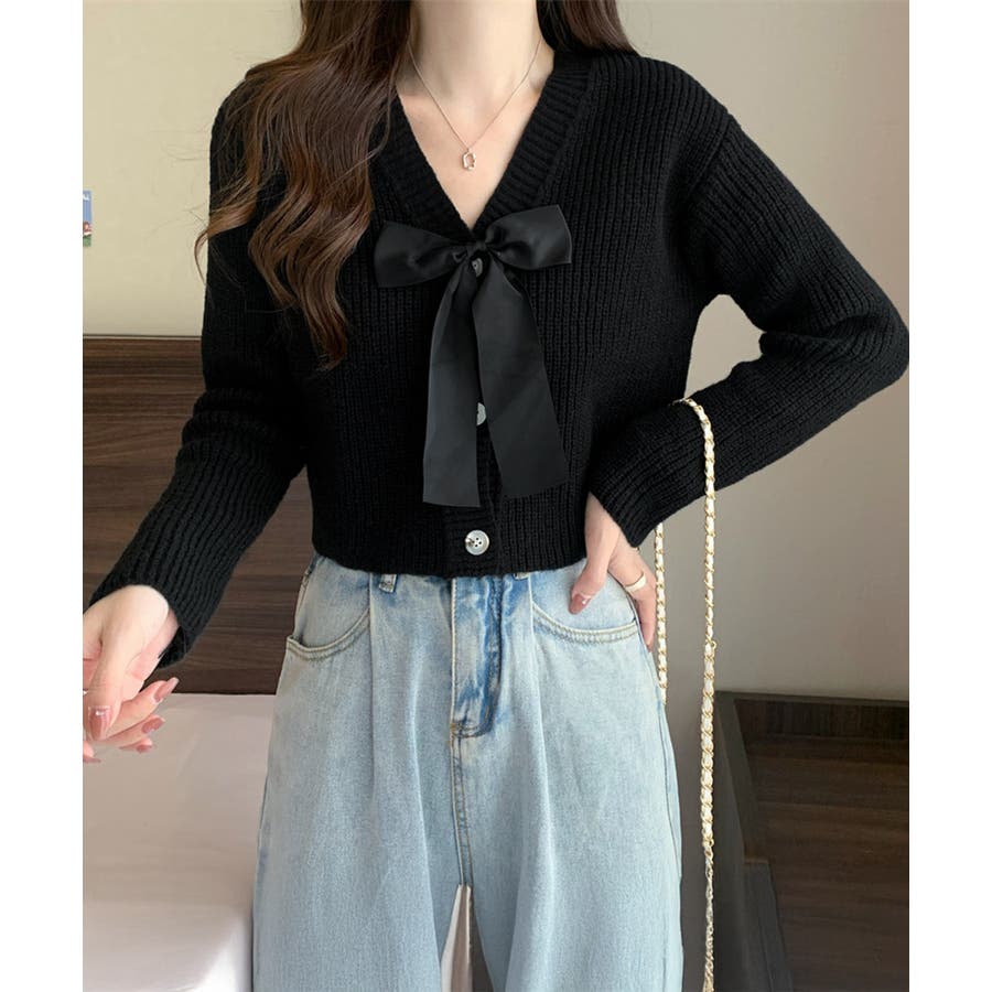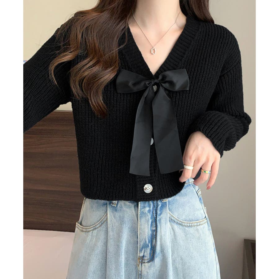 Vネックデザインとフロントのサテンリボンが、女性らしい上品な印象を演出します